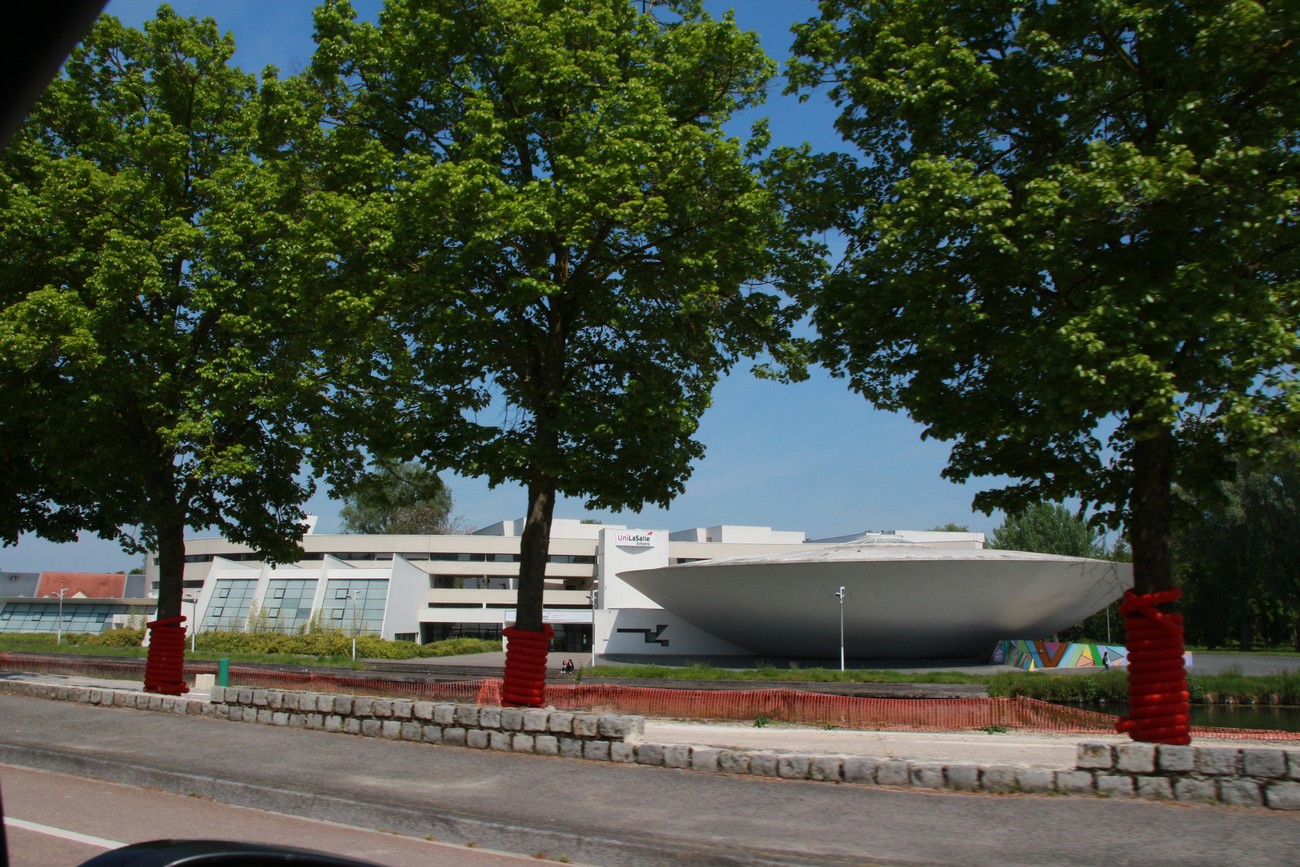 Kämpille päästyä ilta oli vielä nuori, joten kamera kantoon ja kaupungille. Krista hyytyi päivän ylämäkiharjoituksiin ja jäi pakkailemaan, itse kävelin pari korttelia vanhempaan ja köyhempään osaan Amiensia, työläisten puolelle. Siellä kanavat ja kadut risteilevät, talot ovat pieniä, värikkäitä ja vähän vinoja, osa viimeisen päälle kunnostettu ja osa tyhjillään ja huonommassa hapessa. Teema näyttää siis jatkuvan maasta toiseen, pienillä vivahde-eroilla. Baareja ja ravintoloita riittää etenkin isomman kanavan varrella ja hälinä on perjantai-iltana auringonaskun aikaan melkoisen tiheä. Kävelin syvemmälle naapurustoon, baarit vähenivät mutta laadukas katutaide lisäntyi. Tuli vastaan yliopiston modernimpia rakennelmia, ne antoivat hyvän kontrastin vanhemmalle rakennuskannalle - ja sopivat kerrankin paikkaansa.