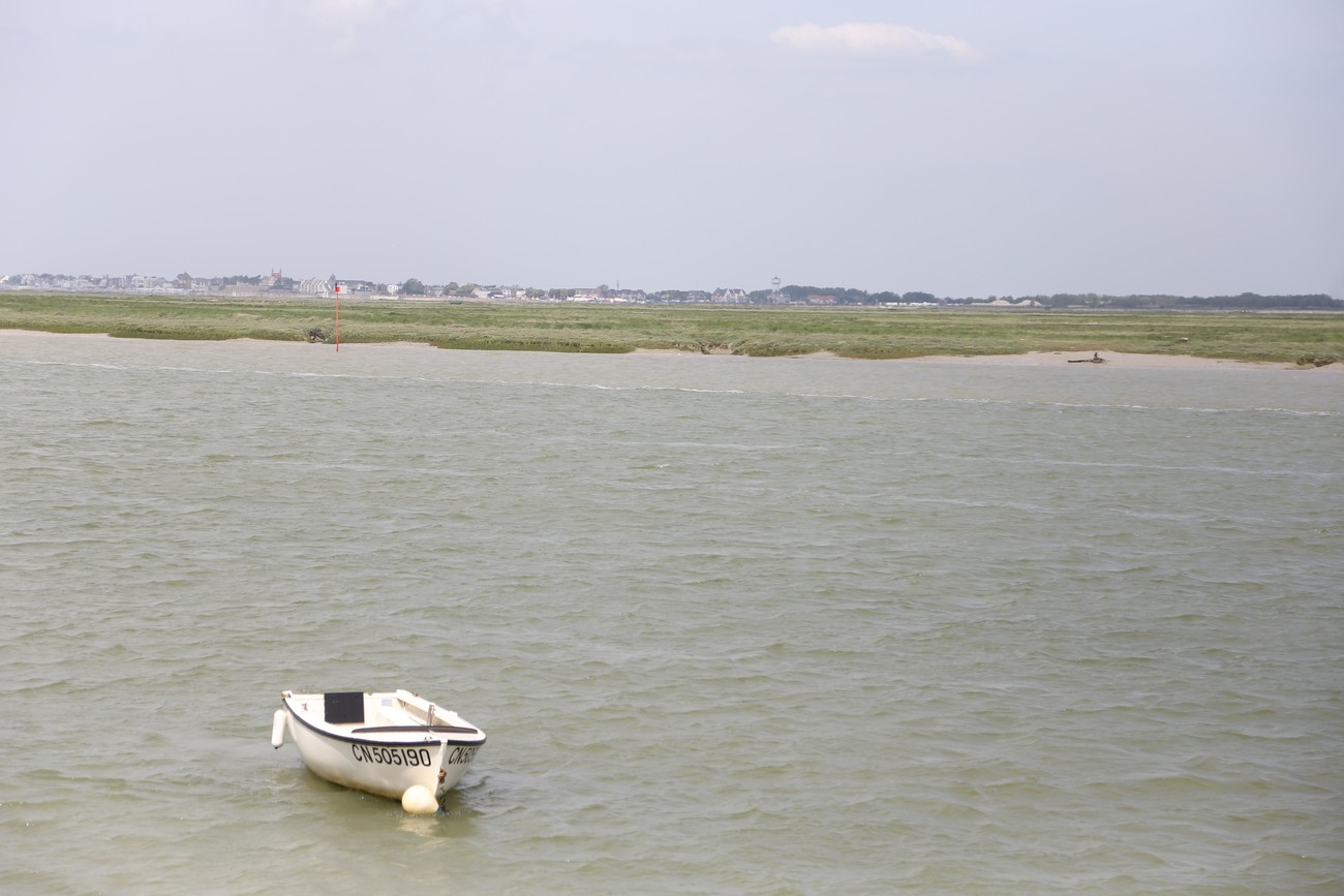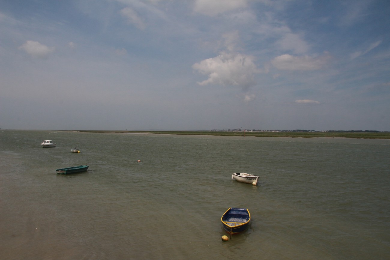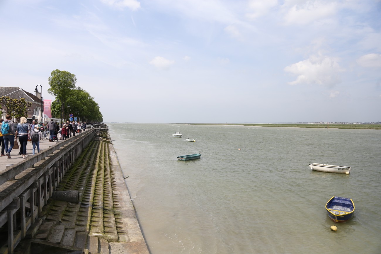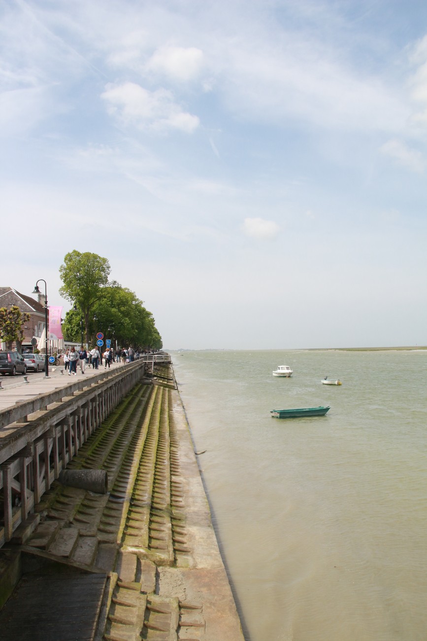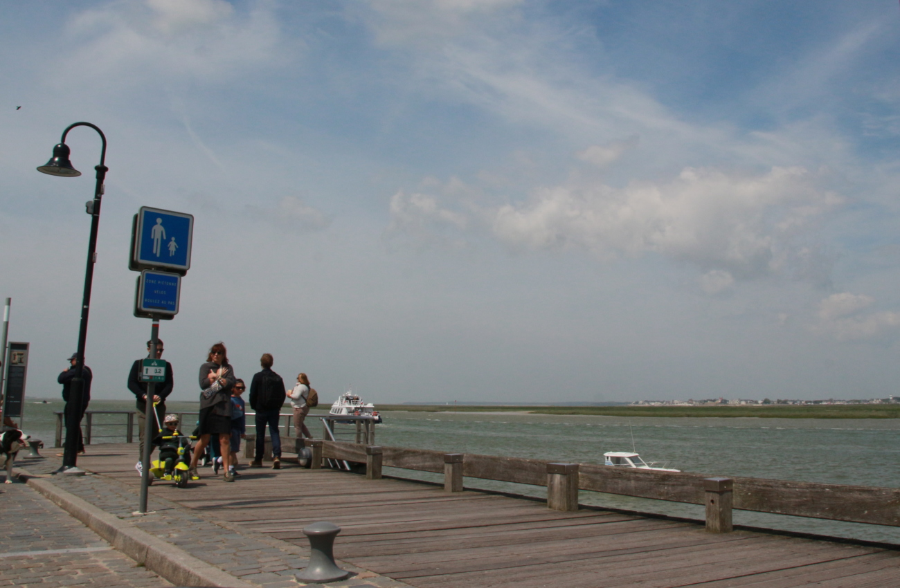 Tie kumpuili alkuun, mutta tasoittui sitten jokisuiston ja marskimaan lähestyessä. Pellot ja metsälaikut vuorottelivat - usein kuljettiin aika korkealla, mäkien päältä näki avarassa maisemassa kauas. Ruoho vihersi lähes koomisen kirkkaana, isot pilvet kiirehtivät tummansinisellä taivaalla ja usva nousi aika piankin sinertämään lähimpiäkin kukkuloita. Tuuli vei auringolta terän, oli sopivan lämmin. Kohteen lähestyessä liikenne lisääntyi, itse kylä oli jo totaalisen tukossa. Ensimmäiselle parkkipaikalle ei tahtonut edes päästä, niin paljon jumitavia turisteja palloili edessä - ja täynnähän se tietenkin oli. Toisella parkkiksella sama juttu, mutta tällä kertaa tien tukkona mopokerhon ikämiesjaosto. Toisaalta hyvä niin, koska muuan belgialaistäti ehti nähdä ahdinkomme ja vinkkasi, että he lähtevät ihan kohta, ruutu vapautuu. Ja vaikka maa olikin tässä kohtaa väärä, on todettava, että ranskalaisten tylyys ja ylimielisyys on kovaa vauhtia osoittautumassa myytiksi.