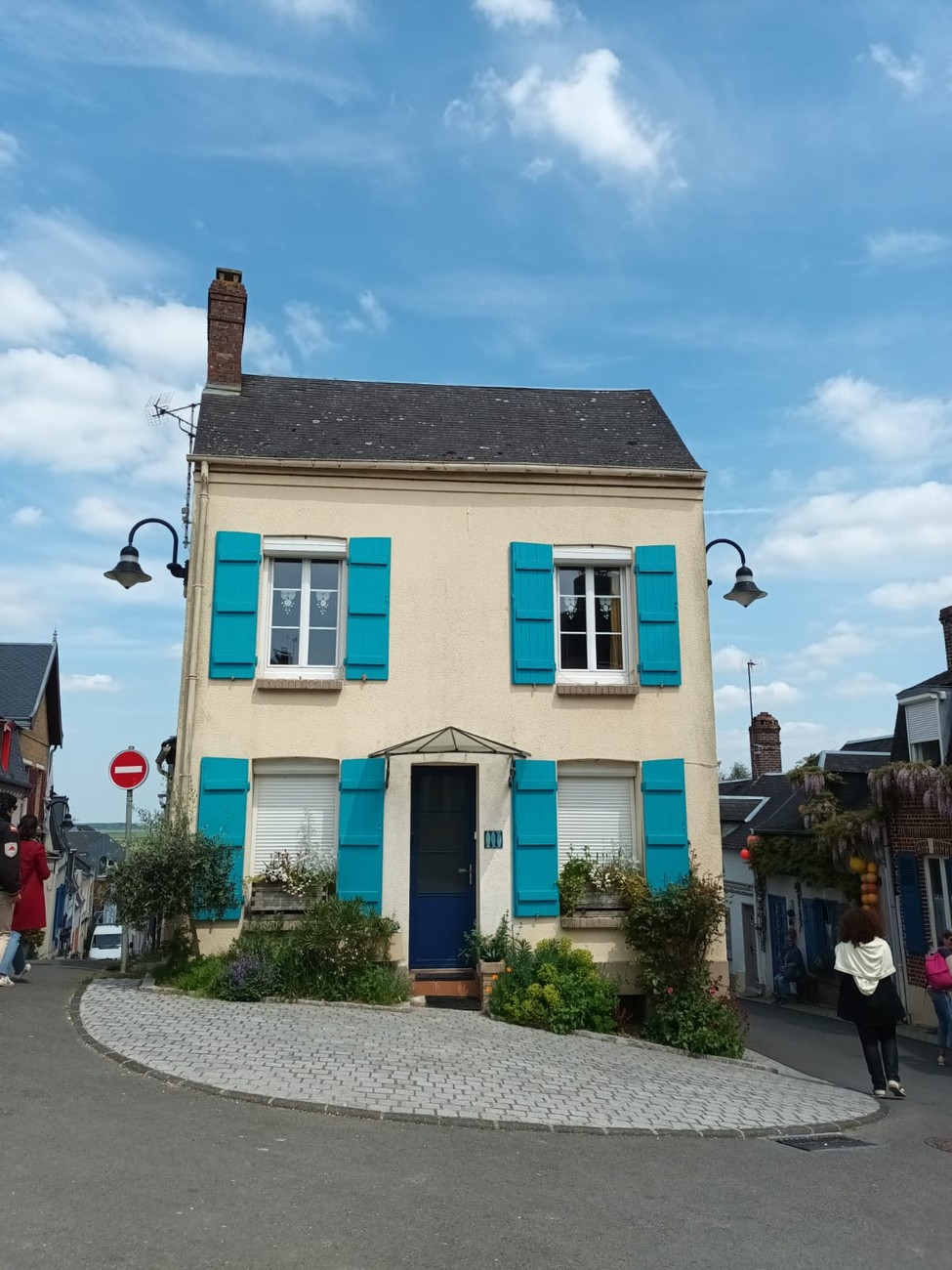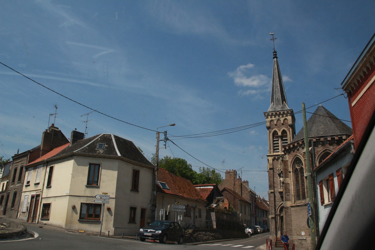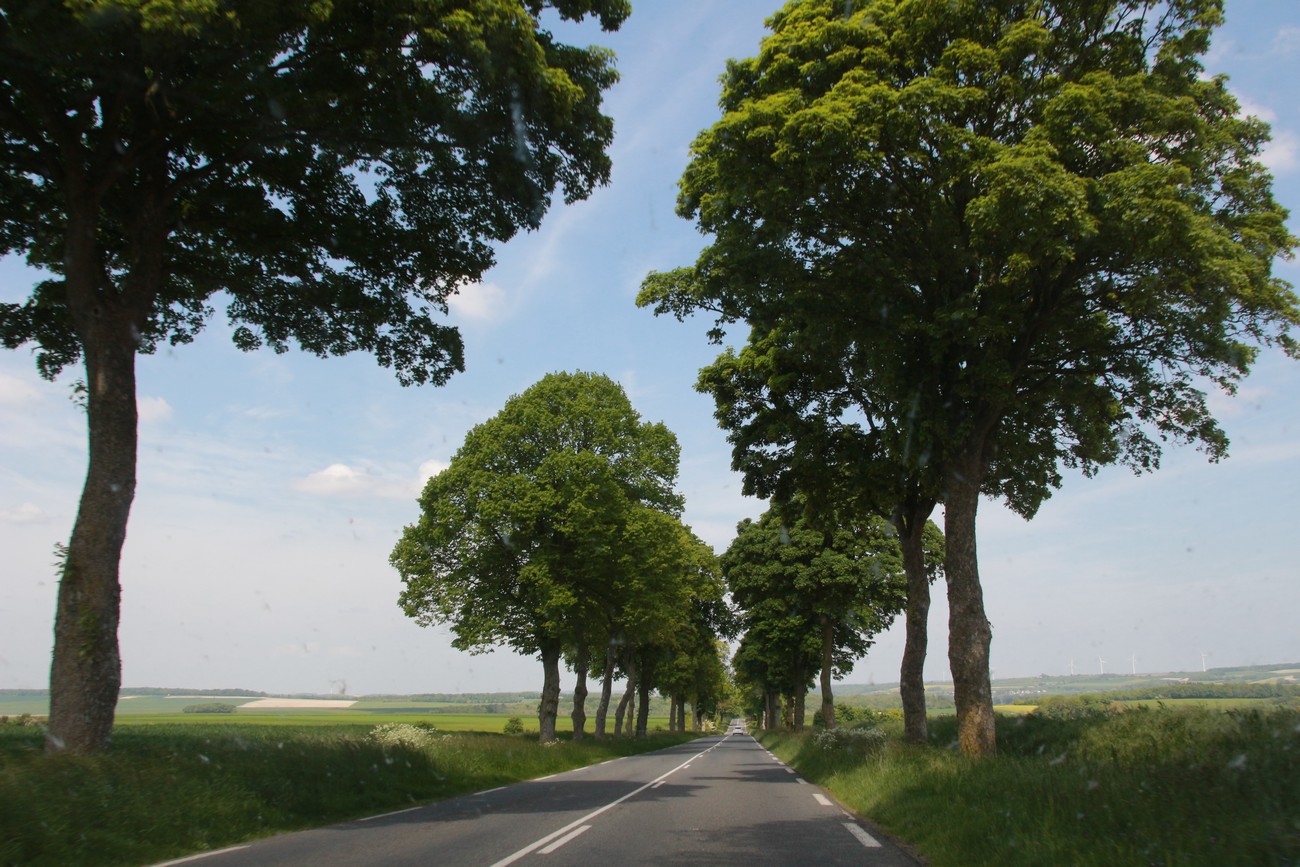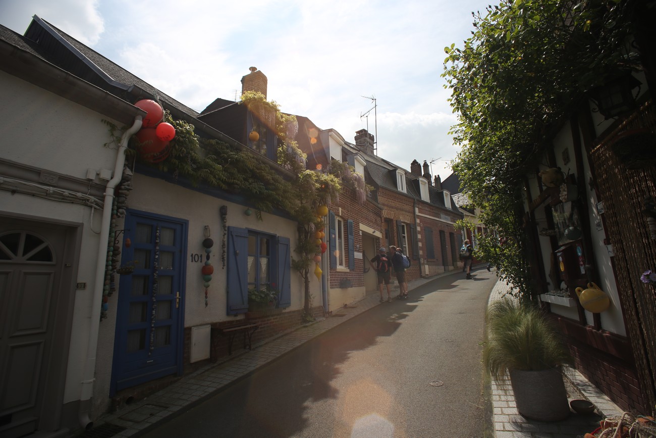 Tie kumpuili alkuun, mutta tasoittui sitten jokisuiston ja marskimaan lähestyessä. Pellot ja metsälaikut vuorottelivat - usein kuljettiin aika korkealla, mäkien päältä näki avarassa maisemassa kauas. Ruoho vihersi lähes koomisen kirkkaana, isot pilvet kiirehtivät tummansinisellä taivaalla ja usva nousi aika piankin sinertämään lähimpiäkin kukkuloita. Tuuli vei auringolta terän, oli sopivan lämmin. Kohteen lähestyessä liikenne lisääntyi, itse kylä oli jo totaalisen tukossa. Ensimmäiselle parkkipaikalle ei tahtonut edes päästä, niin paljon jumitavia turisteja palloili edessä - ja täynnähän se tietenkin oli. Toisella parkkiksella sama juttu, mutta tällä kertaa tien tukkona mopokerhon ikämiesjaosto. Toisaalta hyvä niin, koska muuan belgialaistäti ehti nähdä ahdinkomme ja vinkkasi, että he lähtevät ihan kohta, ruutu vapautuu. Ja vaikka maa olikin tässä kohtaa väärä, on todettava, että ranskalaisten tylyys ja ylimielisyys on kovaa vauhtia osoittautumassa myytiksi.