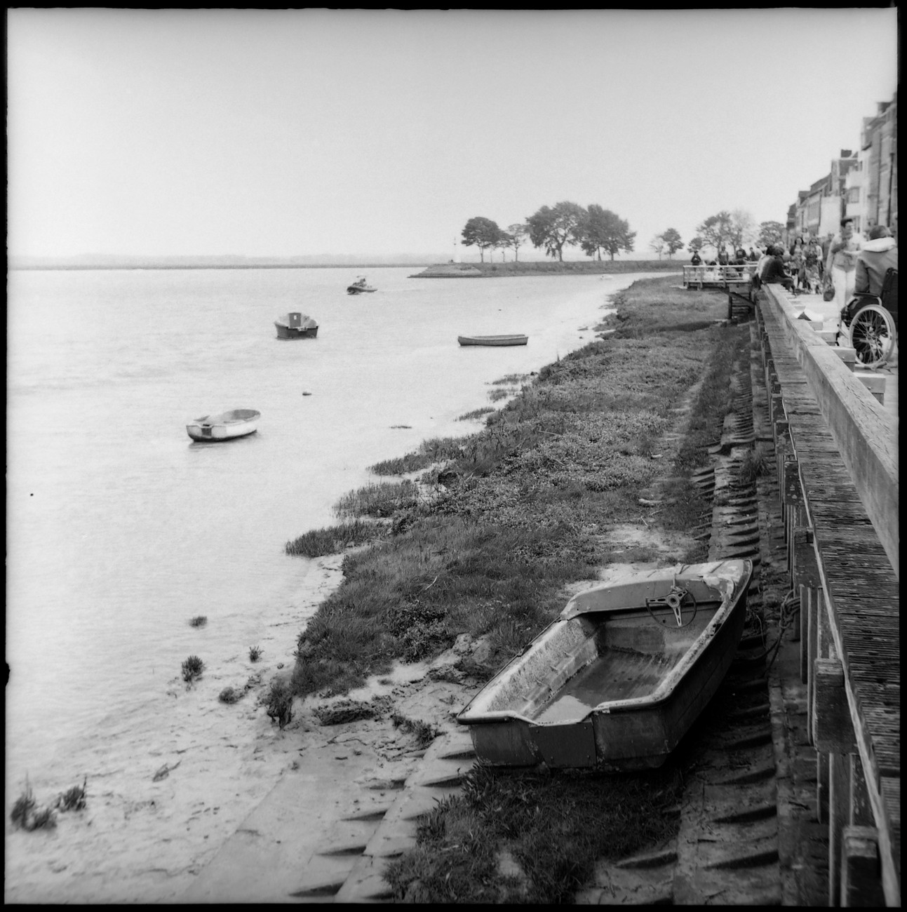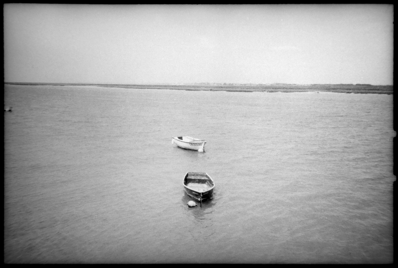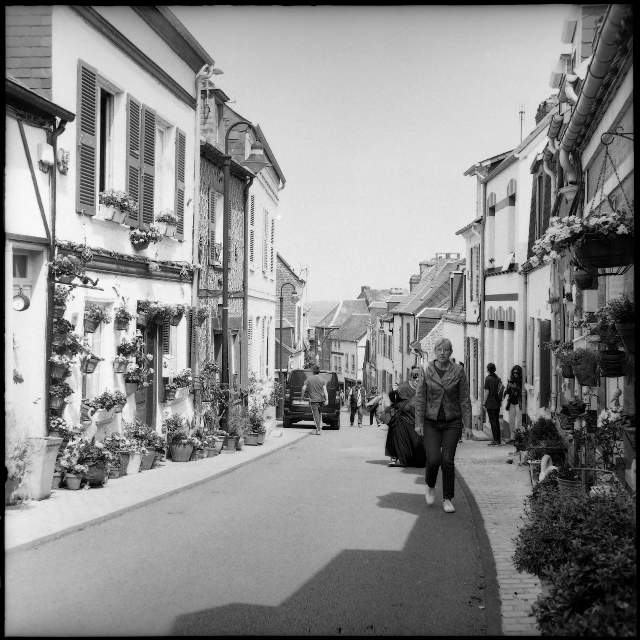 Takaisin kylässä etsin vielä kivaa kuvakulmaa majakkaan mutaisella vuorovesiniityllä, kun kenkä alkoi äkisti luisua sivuttain. Otin pari selännyrjäyttävää balettiaskelta ja pysyin sittenkin pystyssä - lahkeet ja kengät toki aivan savessa. Se kuivui auringossa valkoiseksi. Krista oli tällä välin soluttautunut ranskalaisten mummojen porukkaan, ne istuivat penkillä ja kommentoivat näkemäänsä kuin komediaa katsellen. Kielimuurista huolimatta olennainen tieto välittyi. Että nyt tuo tyttö osti kojusta letun ja asetti sen hetkeksi maahan, tuuli tarttui heti ja heitätti pari kuraista volttia, flop flop. Siellä on nyt lettu levällään, hon hon hon. Ja nyt se tyttö poimi sen ylös, pyyhkäisi vähän ja söi kuitenkin. Että ei kyllä paljon hävetä, joitain ihmisiä, nielevät mitä vain.