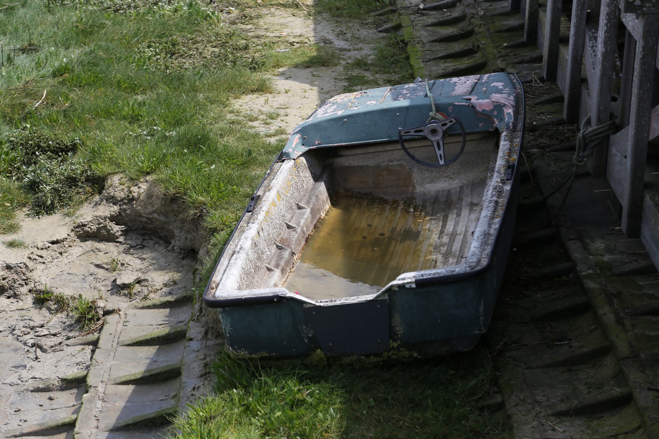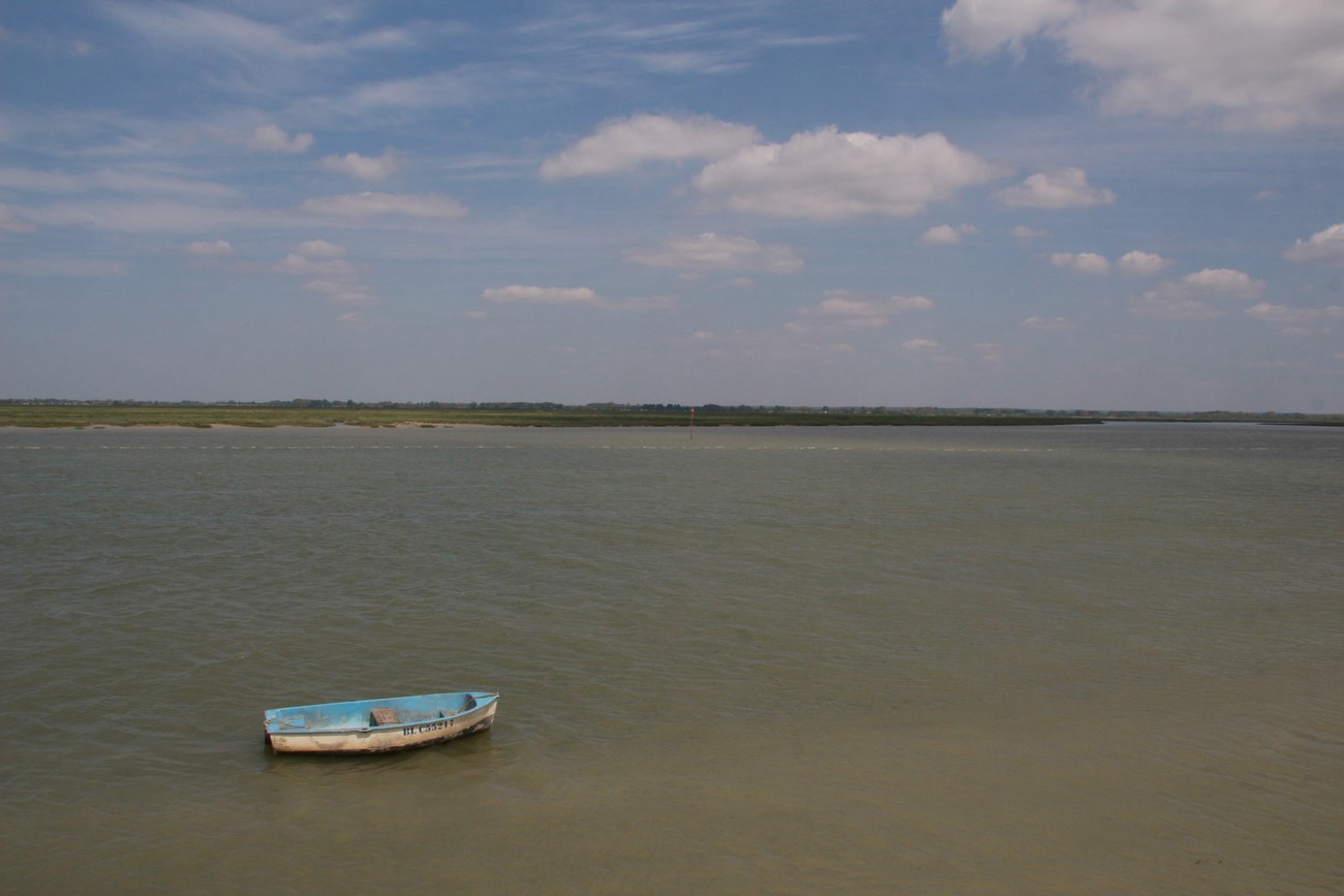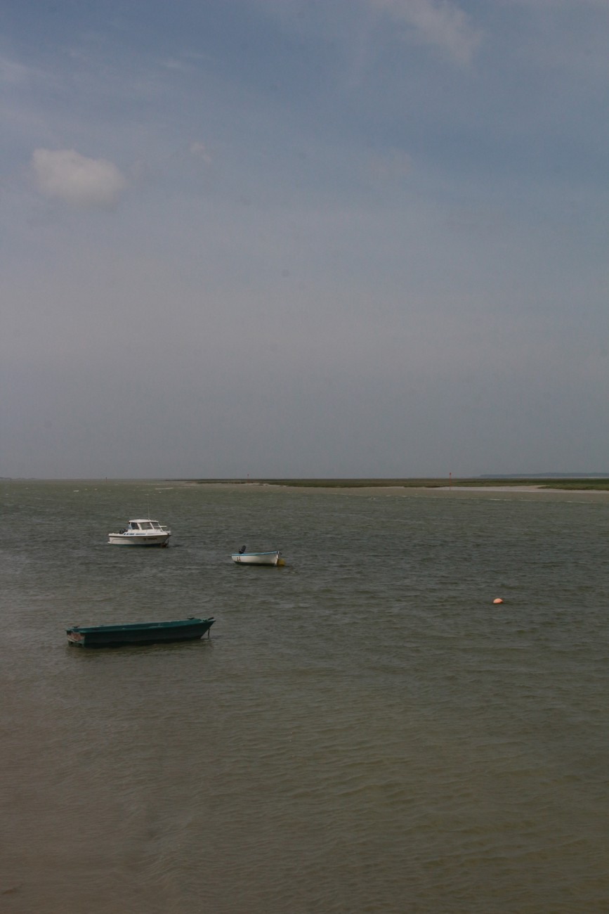Takaisin autolle ja syvemälle suistoon - kohti Hourdelia, joka on vielä pienempi kalastajakylä, ja jos mahdollista, vielä enemmän turistien hallussa. Parkkimaattiin ei käynyt kortti ja kolikot olivat ns. kortilla, sain ostettua aikaa vain tunnin. Kävelin rantaan, hiekka muuttui isoiksi pyöreiksi nilkantappokiviksi ja tuuli yltyi. Rantatörmän päällä puhalsi niin navakasti, että oli vaikea saada teräviä kuvia - kamera heilui ilmavirrassa. Hatun jemmasin laukkuun jo aiemmin. Maisema oli samaan aikaan mitätön ja mahtava; avara taivas, vaaleanharmaa kivikkoranta, harmaanvihreää likaisenmutaista vettä, vaaleanharmaata mutaa, vihreänharmaata ruohoa, horisontti suora ja kaukana. Ei lintuja, ei kaloja eikä varsinkaan hylkeitä - mutta ihmisiä kuin muurahaisia. Noin vartin kävelyn päässä näytti olevan kyljeleen kellahtanut bunkkeri, mantereen puolella taas läpitunkematonta, kyyristelevää pusikkoa. Keräsin pari nättiä kiveä ja kännyin pois.