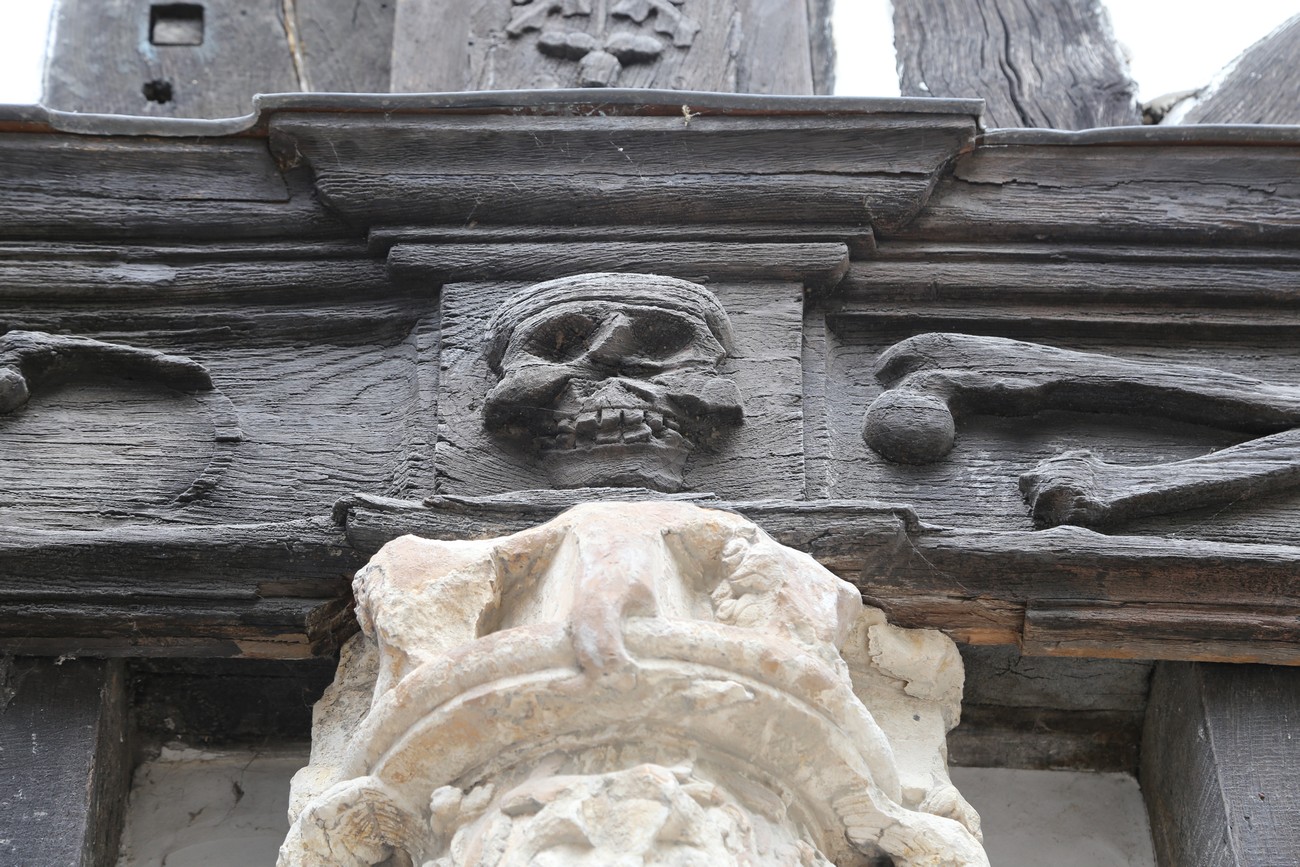 Pihalla kasvaa isoja puita ja seinien palkkeihin on kaiverrettu luita