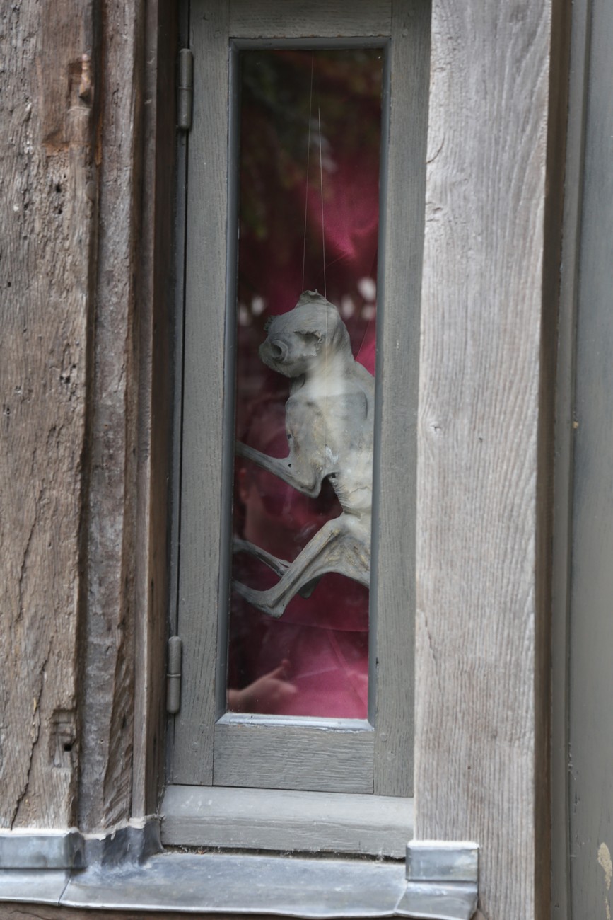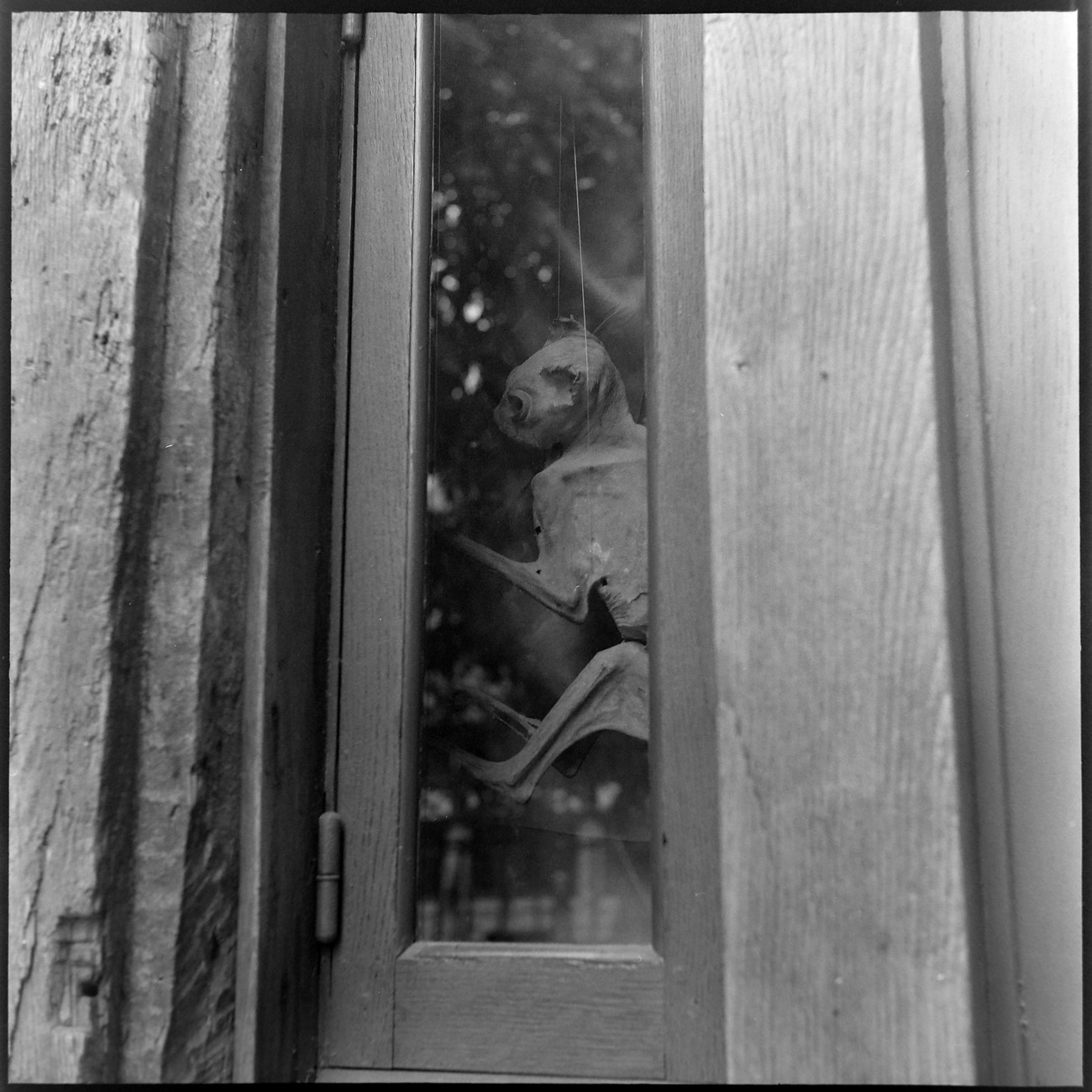 Seinä pullistuu ja palkit heijastuvat ikkunasta