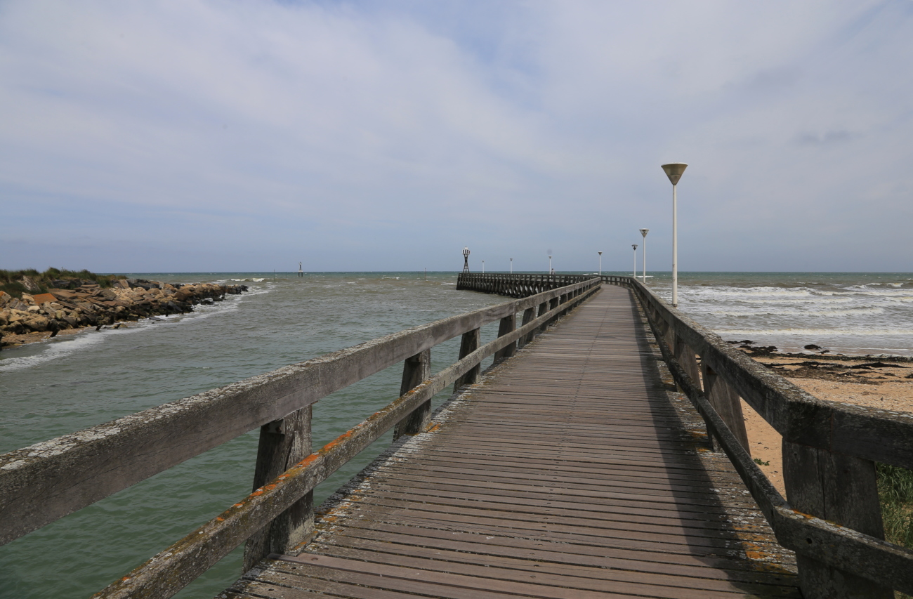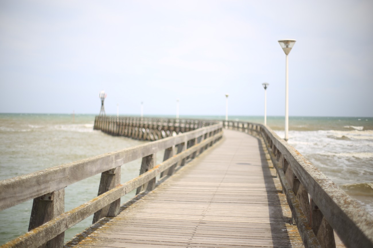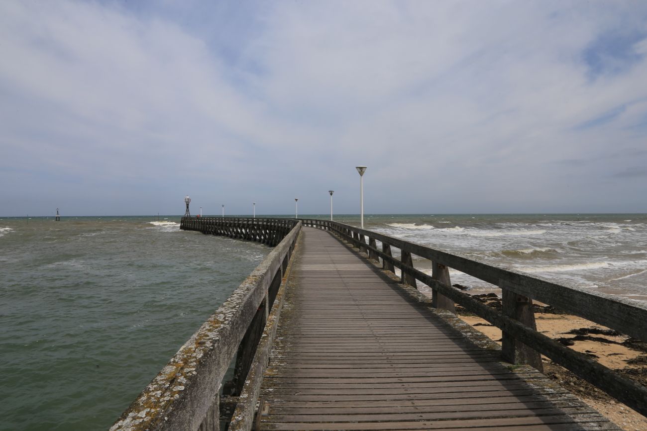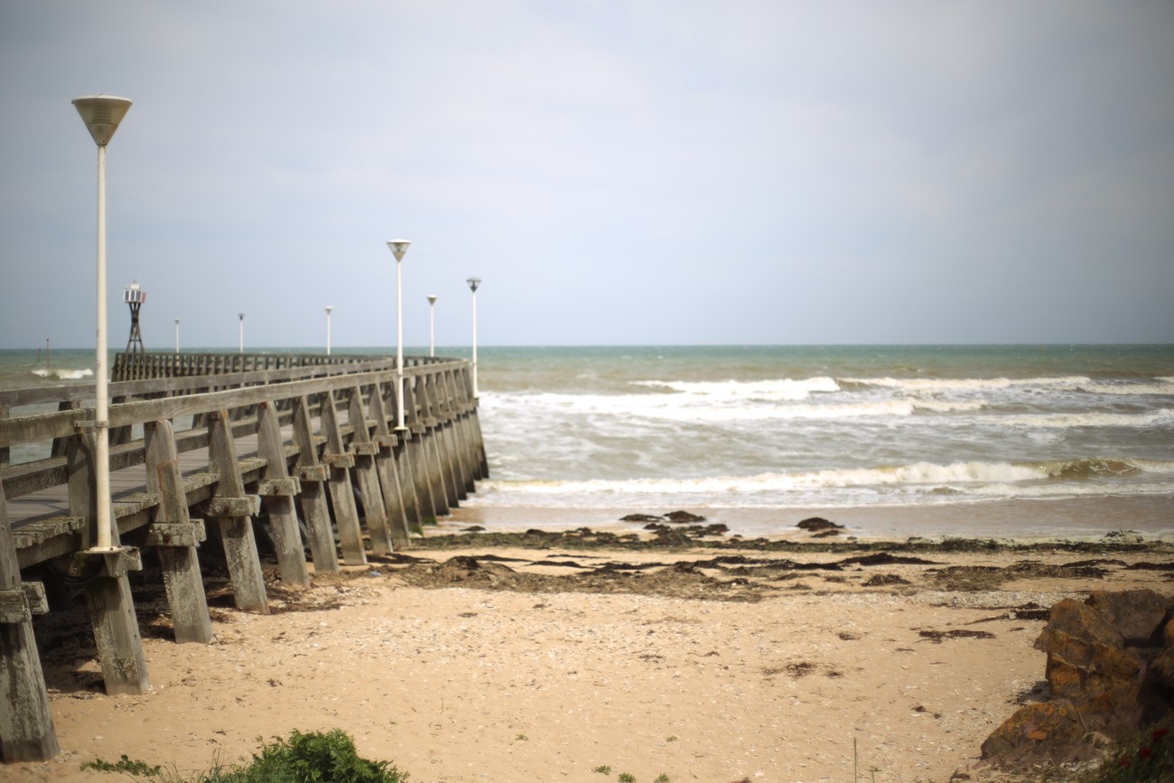 Rannan läheisyydessä tuuli kävi jo naurettavaksi, piti laittaa taas hattu laukkuun ja kiristää nutturaa. Katselin murtuvia aaltoja ja Juno Beachia laiturin nokasta. Näytti paljon helpommalta ja järkevämmältä paikalta nousta maihin kuin vaikka Omaha Beach: lyhyempi ranta, vain muutamia bunkkereita - ja, ennen kaikkea - ei kalkkikivijyrkännettä, jonka laelta jauhaa konekiväärillä. Kaksipuinen risti merkitsi paikan, jossa herra Charles de Gaule nousi maihin kuin joku ihmeentekijä tai tuleva presidentti.
