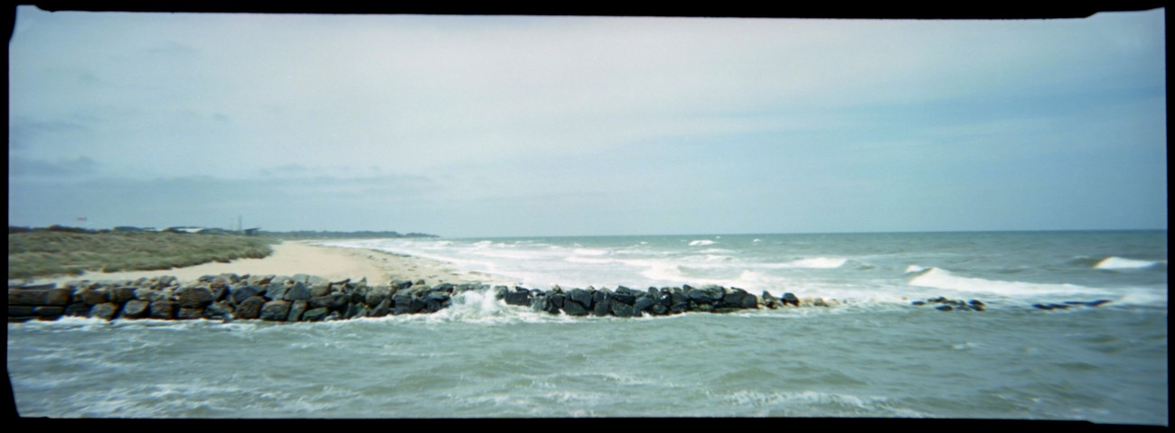 Astuin pari askelta taaksepäin ja tähyilin merelle, ihmetteilin horisontissa paikallaan jumittavaa laivaa. Pitkän putken läpi katsottuna se osoittautui jonkinlaiseksi betonirakennelmaksi - mikä lie, paikallinen Sealand ehkä? Aalto löi taas melkein kengille, meren ääni muuttui erilaiseksi; jotenkin kovemmaksi. The tide has turned eli aika lähteä; filmikin jo melkein puolivälissä. Taivas punersi, hehku heijastui de Gaulen erikoisrististä.