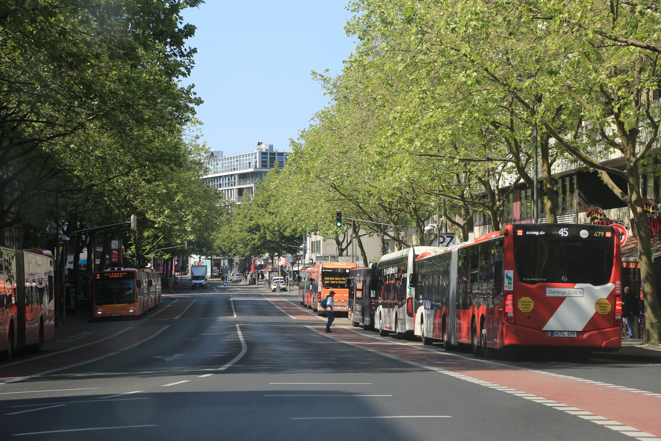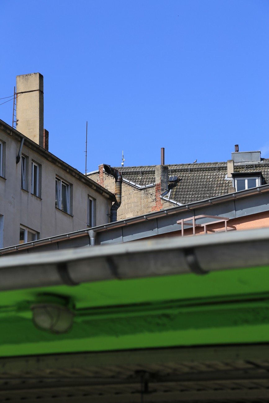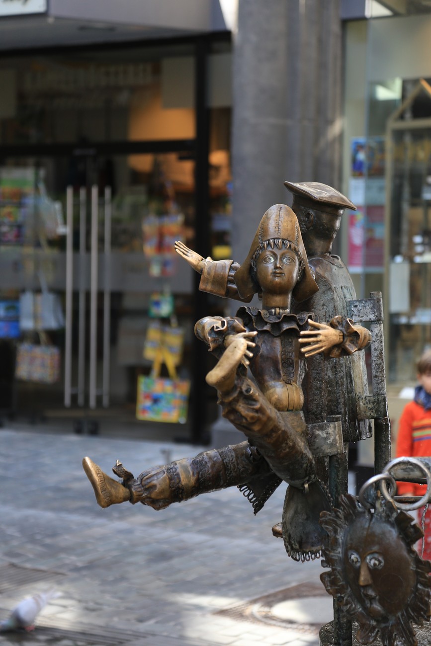 Kämpän haltuunoton jälkeen nautin miedosti epäilyttävän mikroaterian jonka kylmäketju oli taatusti katkennut ja pakenin sitten mäkeä alas ja kaupungille. Tarkoitus oli kävellä vain pari korttelia, mutta alaspäin meno olikin yllättävän helppoa. Bongasin muutamia hienoja katutaiteita ja paljon kivoja näkymiä; aurinko oli parhaassa asemassa, samassa josta eilen kipuilin. Keskustassa näin muutaman eri kirkon, raatihuoneen, epäilyttäviä hahmoja sisältävän suihkulähteen, suljetut markkinat, todella kuppaisen astronomisen kellon mallia tee-se-itse-80-luvulla, muhkuraisella ja kourumaisella asfaltilla päällystetyn kävelykeskustan (ehkä se oli kesken) ja lopulta sen mitä tulin katsomaan: Wuppertaler Schwebebahnin eli yläpuolisista raiteista roikkuvan, yksikiskoisen junan. Kummallinen laitos, täysin toisesta ajasta ja vielä ripustettuna matalana virtaavan Wupper-joen päälle.