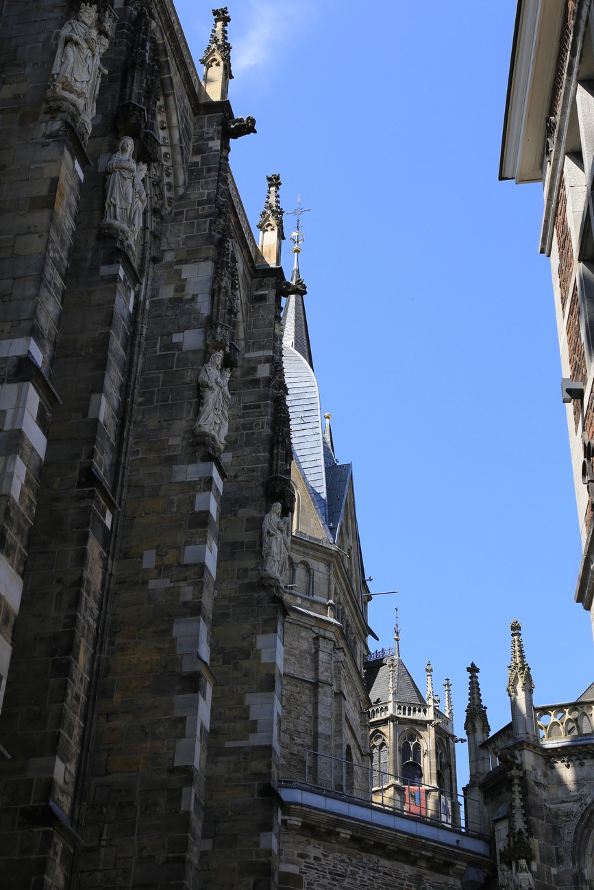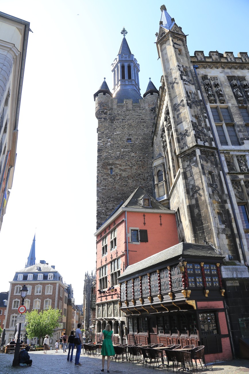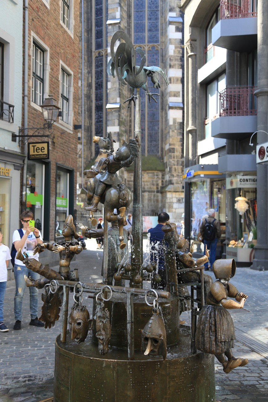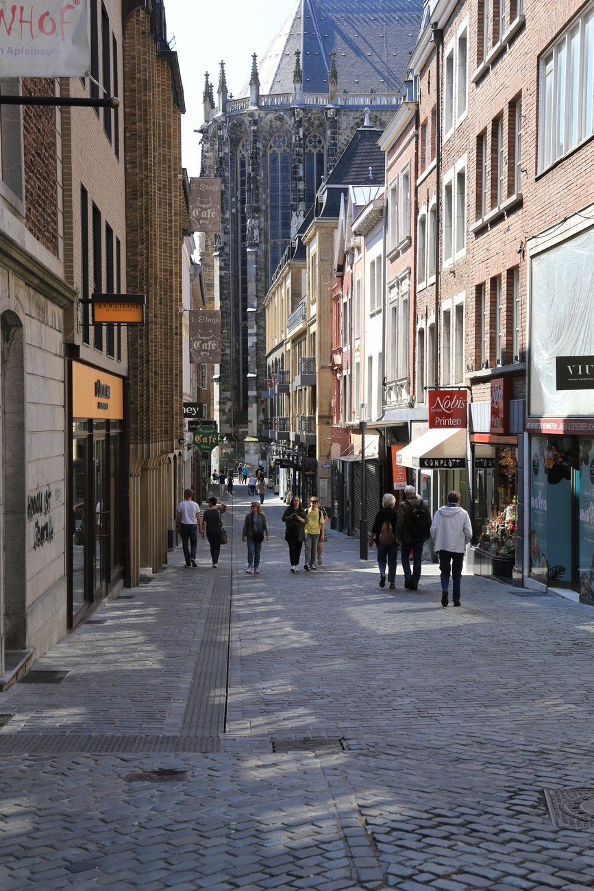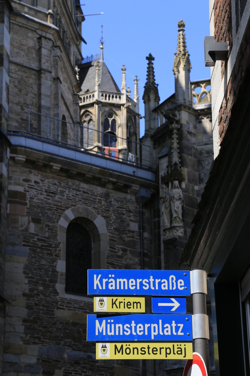 Ajelimme muutaman korttelin keskustaan, auto sai jäädä kalliiseen parkkiin. Kyseinen luola kun ei ollut tuttu, en tiennyt minne kannattaa jättää että on uloskäynnin lähellä - ja että hissikin löytyy. Nähdessän portaat Krista sai jonkinlaisen eksistentialistisen kriisin tai paniikkikohtauksen ja päätti mennä autoon murjottamaan. Pakotin sen kiipeämään yhden kerroksen ylöspäin ja ulkoilmaan, mutta pidemmälle se ei suotunut. Hääti minut kaupungille puoliväkisin, että mene nyt katsomaan. Ja koska aikuisen sanaan kuuluu voida luottaa, etenkin jos on jo monta kertaa kysynyt, minähän menin. Yleiskuva Aachenista on hieman suttuinen, mutta vehreä ja viihtyisä. Tähän asti ajetut keskustan iso kadut ovat poikkeuksetta isojen puiden varjostamia ja viileitä ja niiden mutkat soljuvat kuin suunniteltuina - toisin kuin Ranskassa, jossa pitää välillä mahtua mahdottomista rakosista tai kääntyä melkeinpä itsensä ympäri. Aachenin kadut eivät kuitenkaan olleet vastalakaistut, eikä ruohoa ollut ajettu oikein mistään. Ja nyt vanhassa keskustassa pisti silmään pummien, krustipunkkareiden ja kerjäävien nistien suuri määrä - ihan kuin Berliinin huonoilla (eli hyvillä) alueilla tai Hampurissa. Näin pienessä ja pikkusievässä paikassa moinen touhu erottuu jotenkin erityisen hyvin.