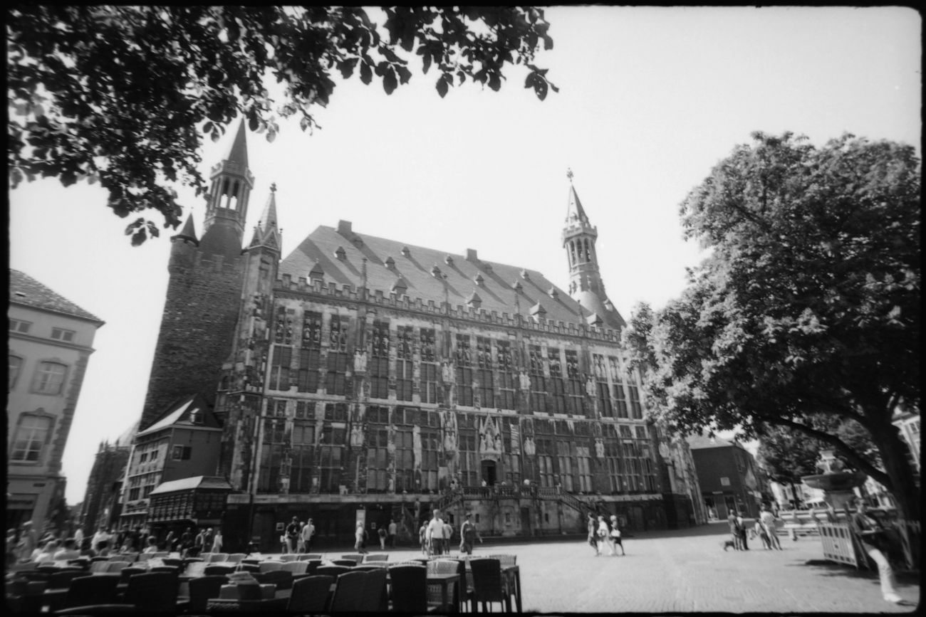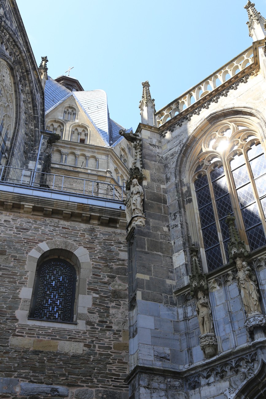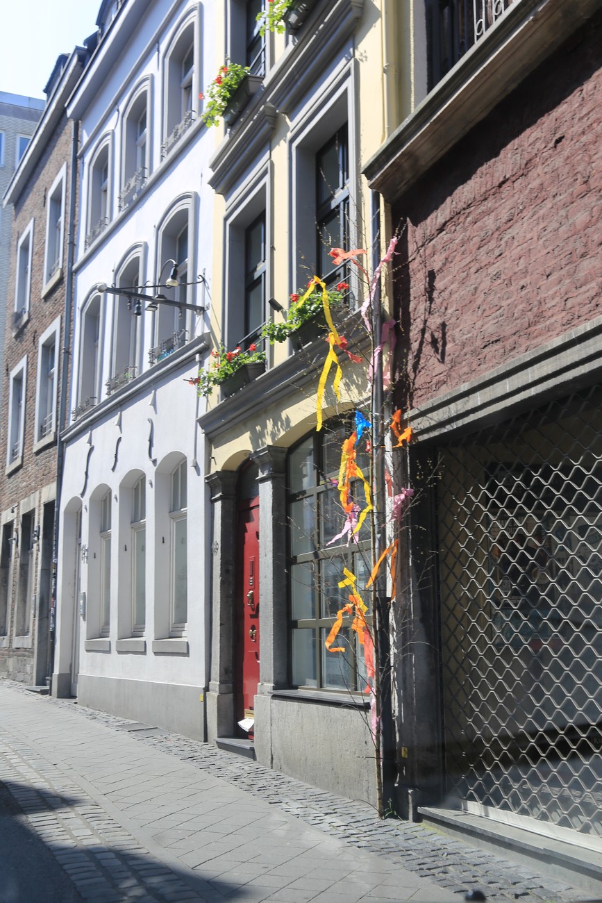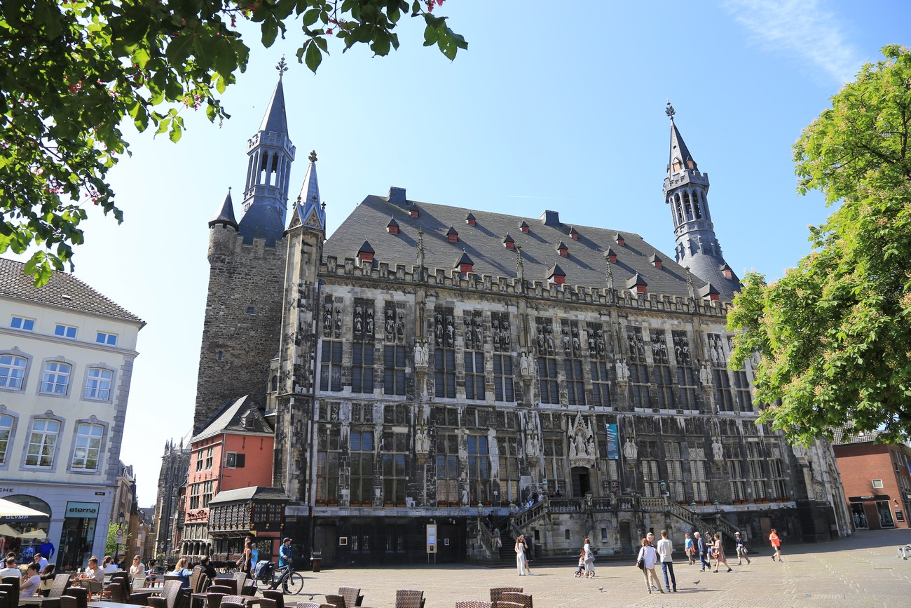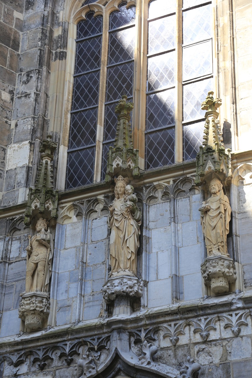 Ajelimme muutaman korttelin keskustaan, auto sai jäädä kalliiseen parkkiin. Kyseinen luola kun ei ollut tuttu, en tiennyt minne kannattaa jättää että on uloskäynnin lähellä - ja että hissikin löytyy. Nähdessän portaat Krista sai jonkinlaisen eksistentialistisen kriisin tai paniikkikohtauksen ja päätti mennä autoon murjottamaan. Pakotin sen kiipeämään yhden kerroksen ylöspäin ja ulkoilmaan, mutta pidemmälle se ei suotunut. Hääti minut kaupungille puoliväkisin, että mene nyt katsomaan. Ja koska aikuisen sanaan kuuluu voida luottaa, etenkin jos on jo monta kertaa kysynyt, minähän menin. Yleiskuva Aachenista on hieman suttuinen, mutta vehreä ja viihtyisä. Tähän asti ajetut keskustan iso kadut ovat poikkeuksetta isojen puiden varjostamia ja viileitä ja niiden mutkat soljuvat kuin suunniteltuina - toisin kuin Ranskassa, jossa pitää välillä mahtua mahdottomista rakosista tai kääntyä melkeinpä itsensä ympäri. Aachenin kadut eivät kuitenkaan olleet vastalakaistut, eikä ruohoa ollut ajettu oikein mistään. Ja nyt vanhassa keskustassa pisti silmään pummien, krustipunkkareiden ja kerjäävien nistien suuri määrä - ihan kuin Berliinin huonoilla (eli hyvillä) alueilla tai Hampurissa. Näin pienessä ja pikkusievässä paikassa moinen touhu erottuu jotenkin erityisen hyvin.