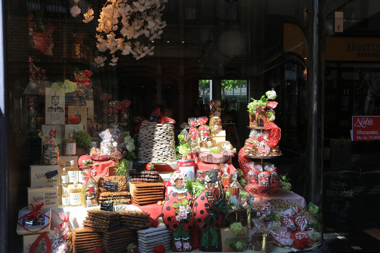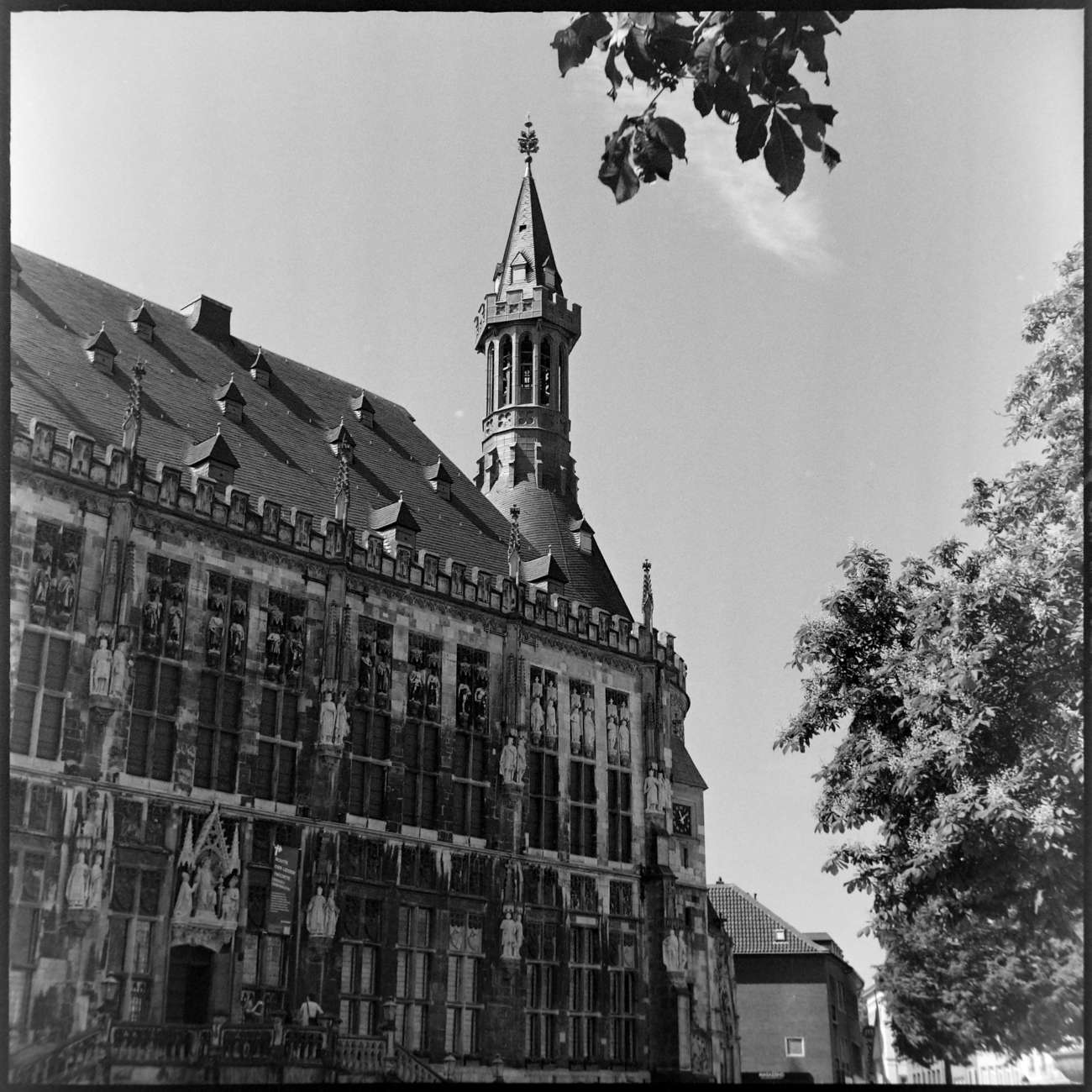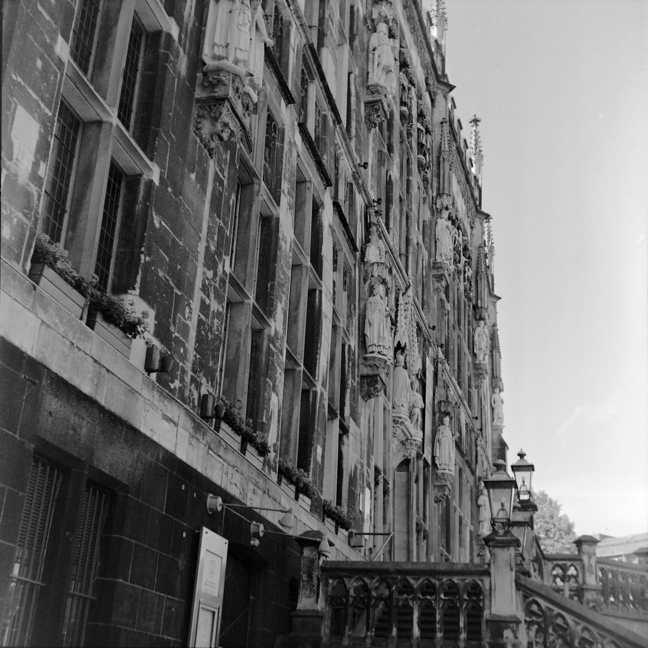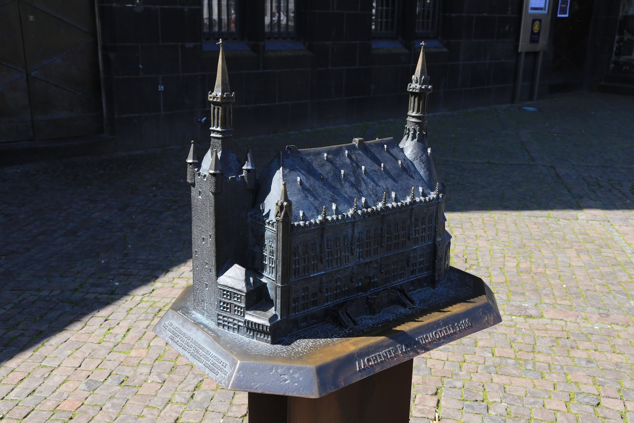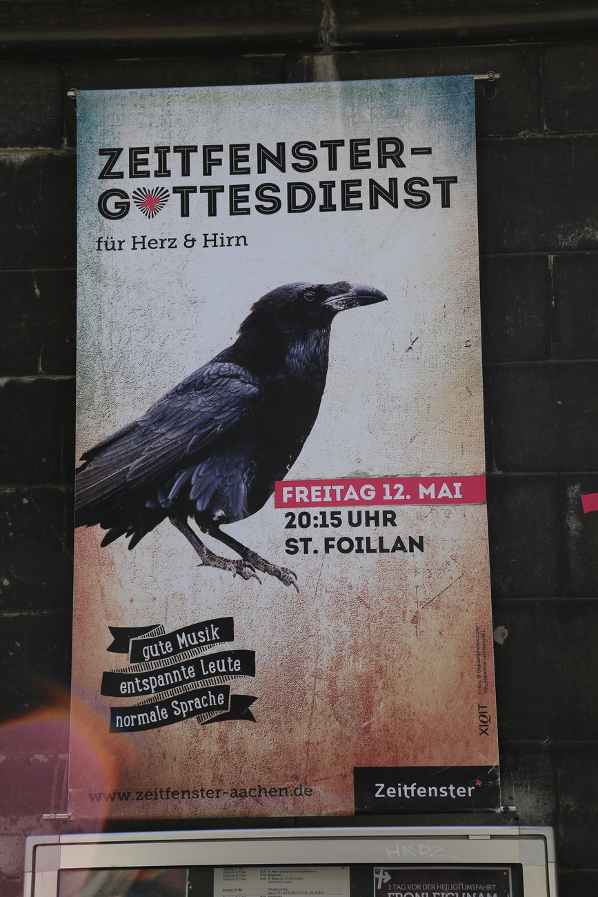 Ajelimme muutaman korttelin keskustaan, auto sai jäädä kalliiseen parkkiin. Kyseinen luola kun ei ollut tuttu, en tiennyt minne kannattaa jättää että on uloskäynnin lähellä - ja että hissikin löytyy. Nähdessän portaat Krista sai jonkinlaisen eksistentialistisen kriisin tai paniikkikohtauksen ja päätti mennä autoon murjottamaan. Pakotin sen kiipeämään yhden kerroksen ylöspäin ja ulkoilmaan, mutta pidemmälle se ei suotunut. Hääti minut kaupungille puoliväkisin, että mene nyt katsomaan. Ja koska aikuisen sanaan kuuluu voida luottaa, etenkin jos on jo monta kertaa kysynyt, minähän menin. Yleiskuva Aachenista on hieman suttuinen, mutta vehreä ja viihtyisä. Tähän asti ajetut keskustan iso kadut ovat poikkeuksetta isojen puiden varjostamia ja viileitä ja niiden mutkat soljuvat kuin suunniteltuina - toisin kuin Ranskassa, jossa pitää välillä mahtua mahdottomista rakosista tai kääntyä melkeinpä itsensä ympäri. Aachenin kadut eivät kuitenkaan olleet vastalakaistut, eikä ruohoa ollut ajettu oikein mistään. Ja nyt vanhassa keskustassa pisti silmään pummien, krustipunkkareiden ja kerjäävien nistien suuri määrä - ihan kuin Berliinin huonoilla (eli hyvillä) alueilla tai Hampurissa. Näin pienessä ja pikkusievässä paikassa moinen touhu erottuu jotenkin erityisen hyvin.