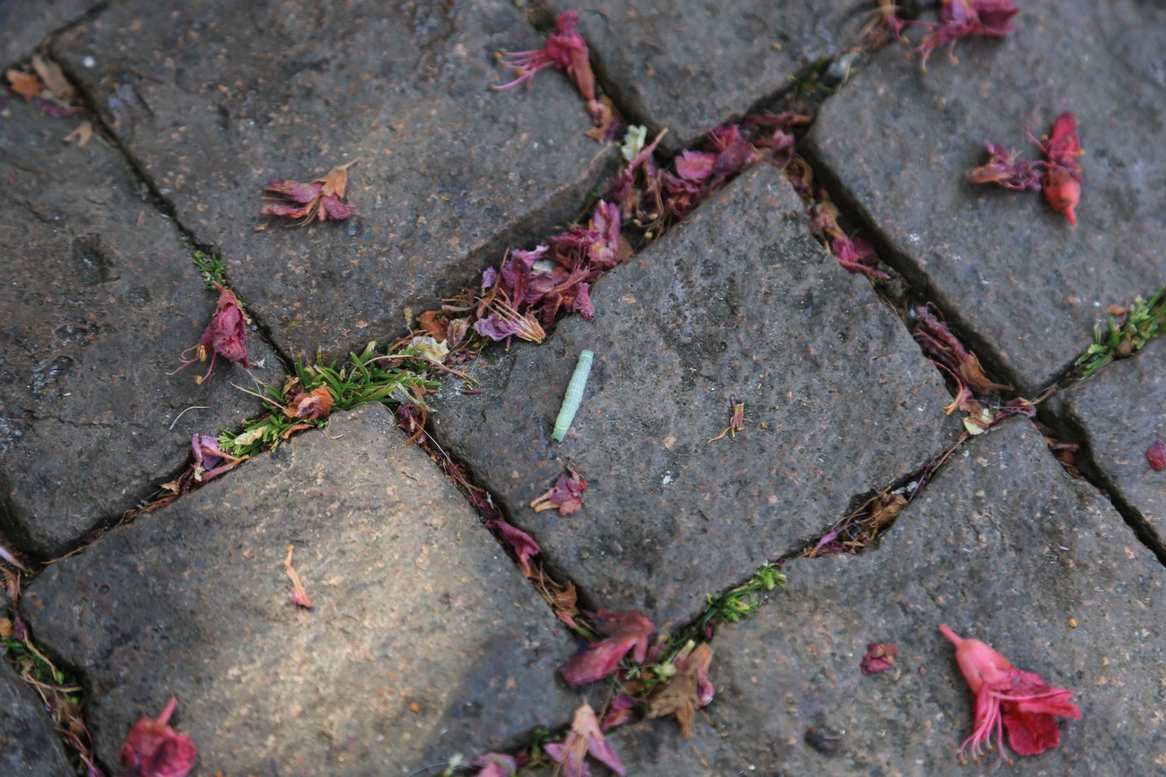 Puista putoilee punaisia kukkia, kuin jossain kirjassa