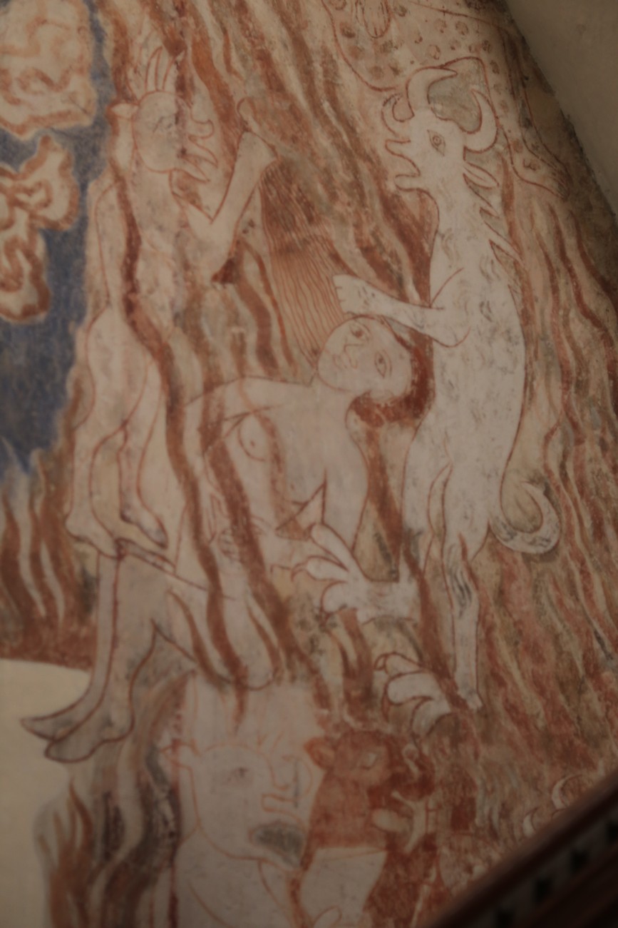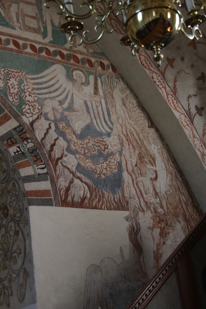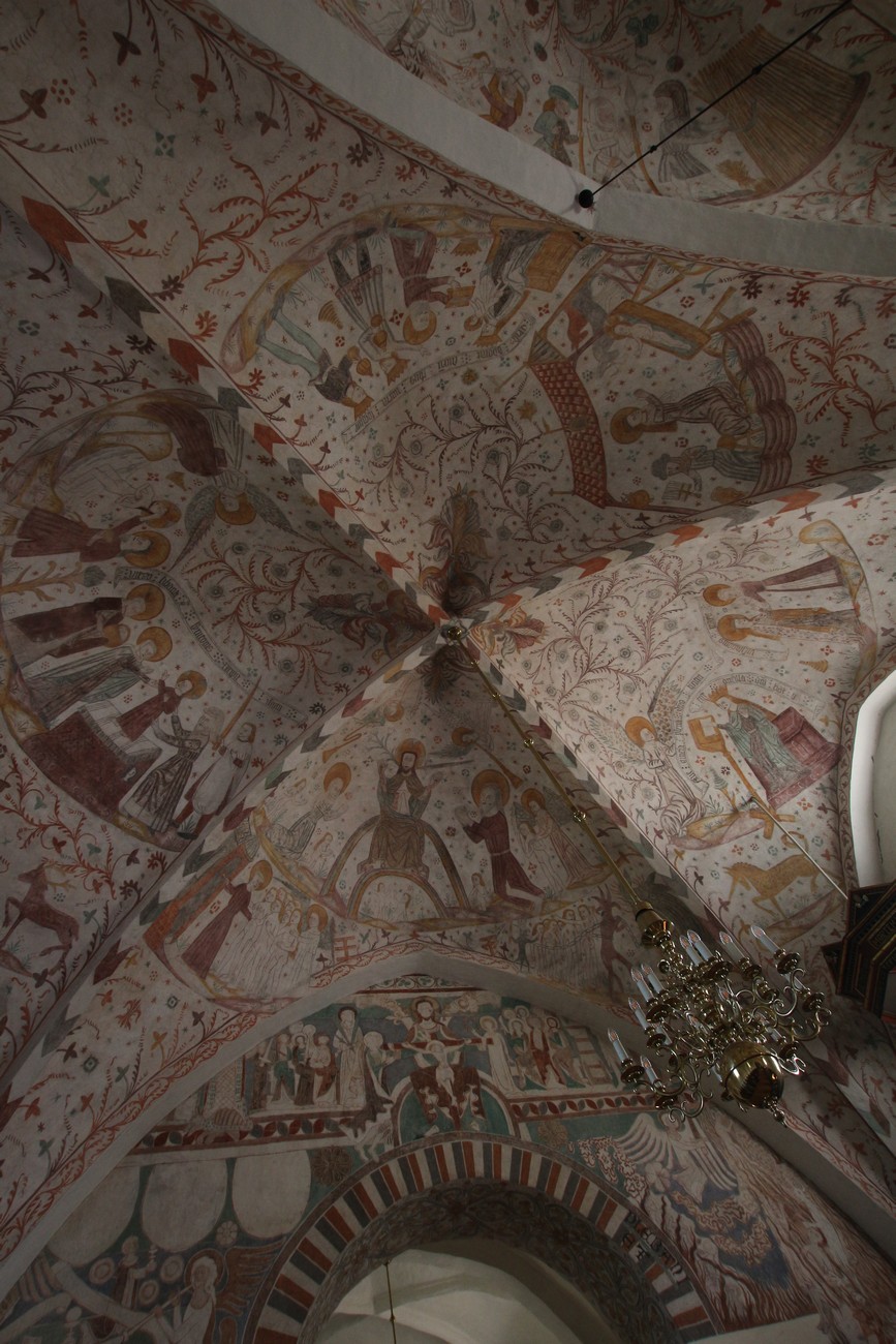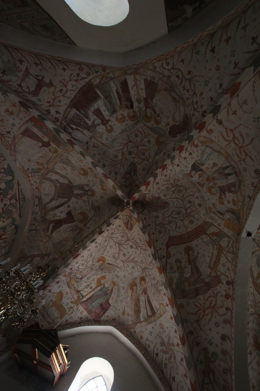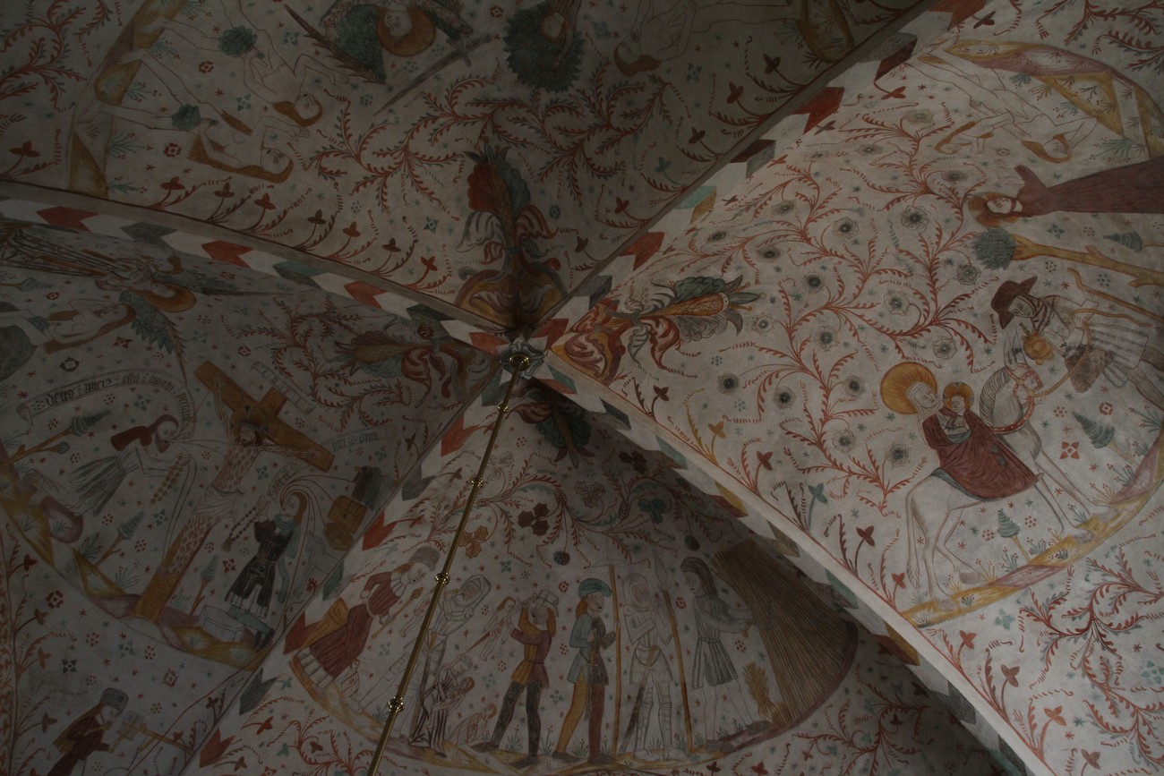 Auto käynnistyi iloisesti, tyhjäkäynti hieman röpötti mutta valot eivät palaneet ja matkaan päästiin. Kävimme heti alkajaisiksi huvittumassa ihan liikaa Keldbyn kirkon keskiaikaisista seinämaalauksista ja puuveistoksista. Niitä on kirjaimellisesti seinät ja katto täynnä, toinen toistaan mahtavampaa naivismia. Juu, olen minä hevosen nähnyt, eikös se piirretä vähän kuin iso koira? Ja crowdsurffaava jesse, se me laitetaan alttaritauluun. Meinasi naurattaa ääneen, mutta muiden läsnäolijoiden vuoksi hillitsimme itsemme - etenkin halusimme suojella yli-ikäisen sivarin näköistä, ilmeisesti suntiota, joka tomutti virsikijoja ahkerasti.