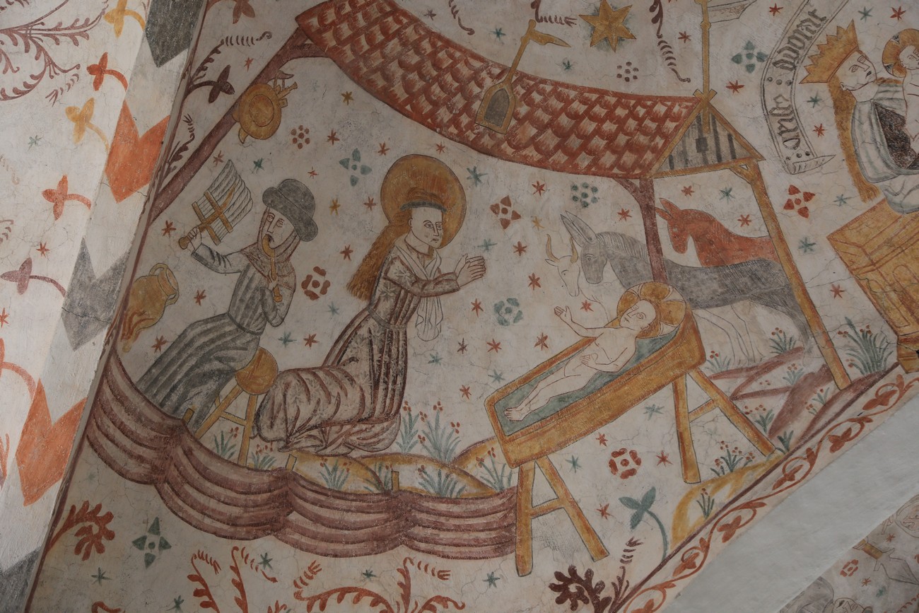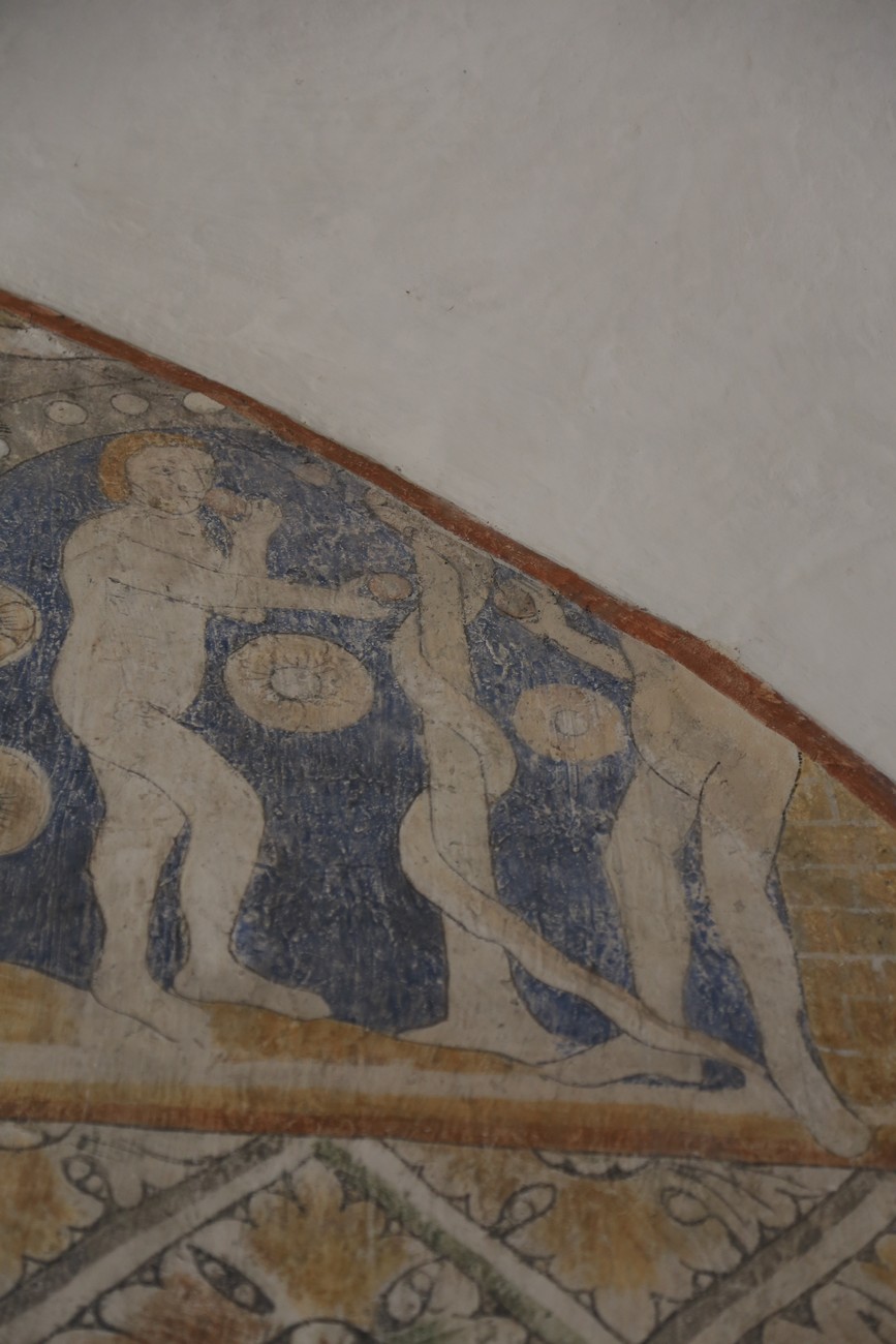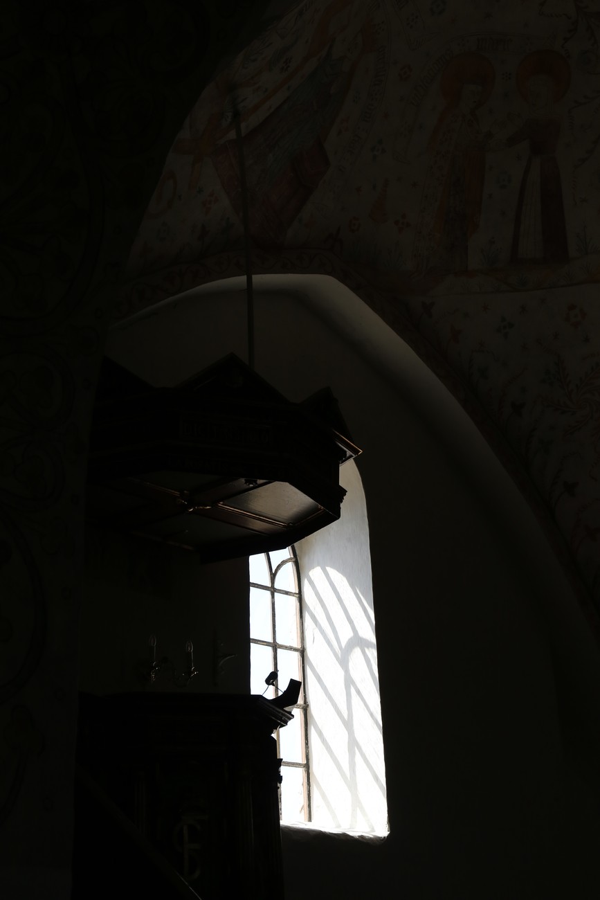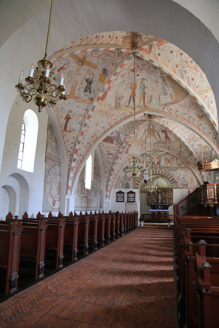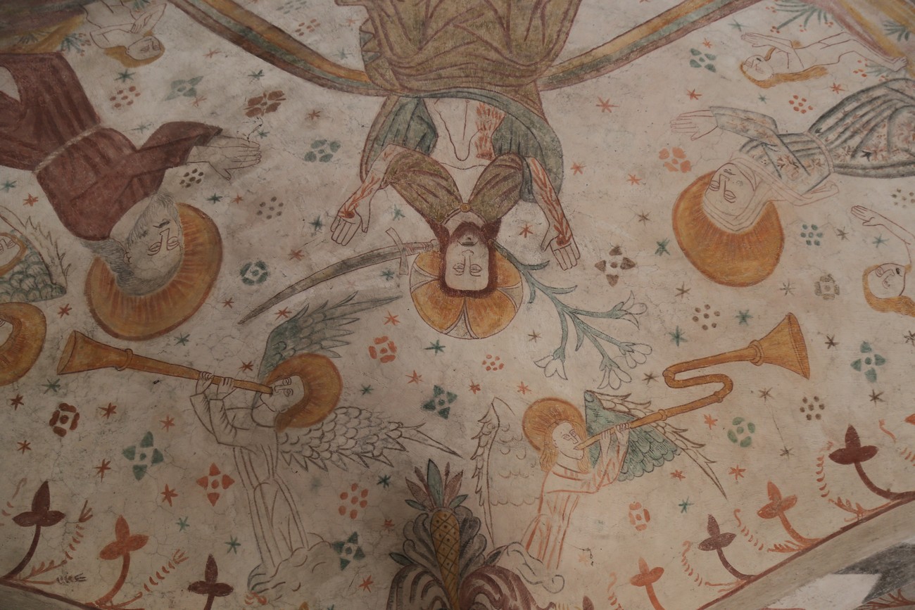 Auto käynnistyi iloisesti, tyhjäkäynti hieman röpötti mutta valot eivät palaneet ja matkaan päästiin. Kävimme heti alkajaisiksi huvittumassa ihan liikaa Keldbyn kirkon keskiaikaisista seinämaalauksista ja puuveistoksista. Niitä on kirjaimellisesti seinät ja katto täynnä, toinen toistaan mahtavampaa naivismia. Juu, olen minä hevosen nähnyt, eikös se piirretä vähän kuin iso koira? Ja crowdsurffaava jesse, se me laitetaan alttaritauluun. Meinasi naurattaa ääneen, mutta muiden läsnäolijoiden vuoksi hillitsimme itsemme - etenkin halusimme suojella yli-ikäisen sivarin näköistä, ilmeisesti suntiota, joka tomutti virsikijoja ahkerasti.