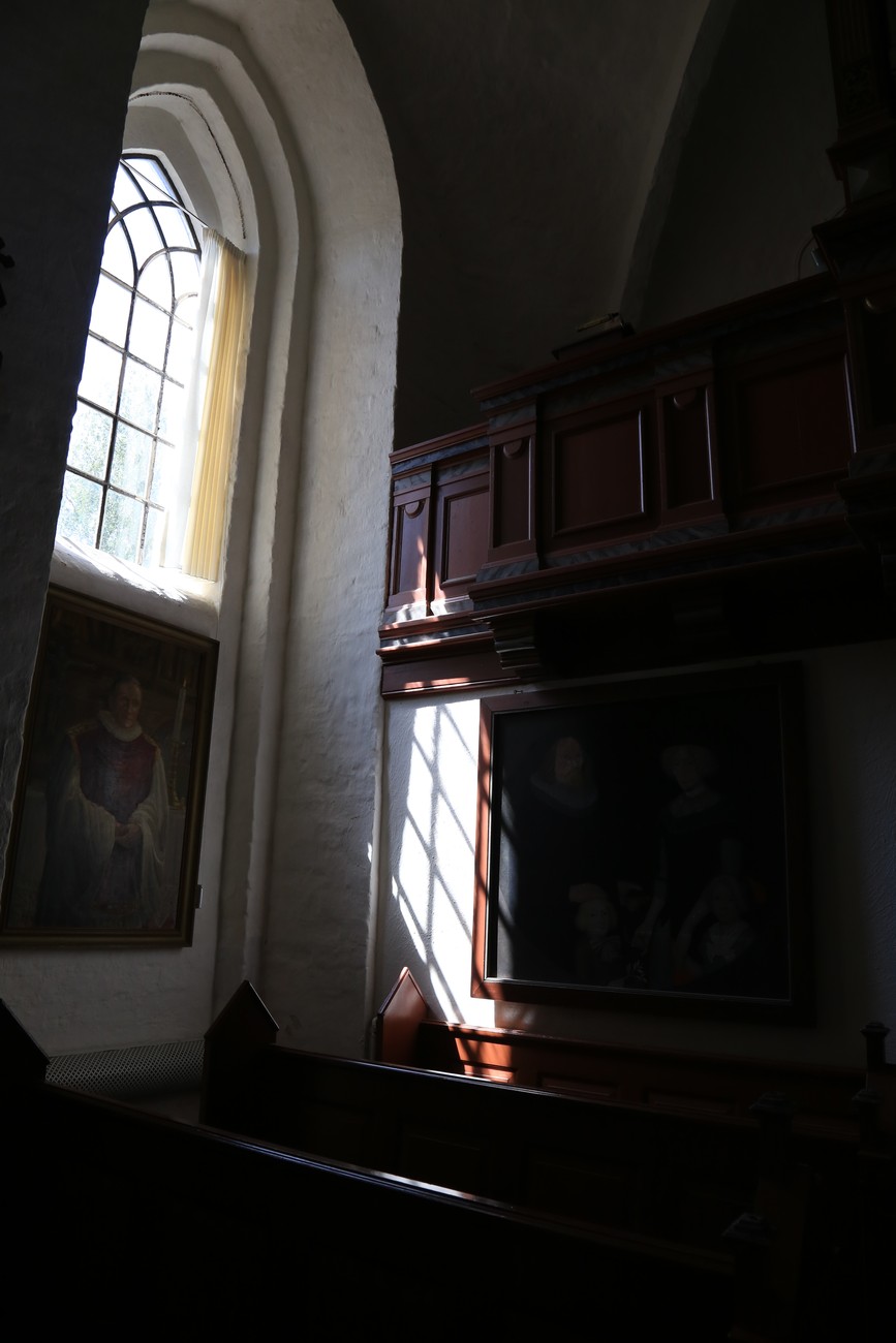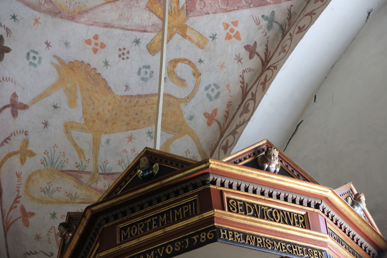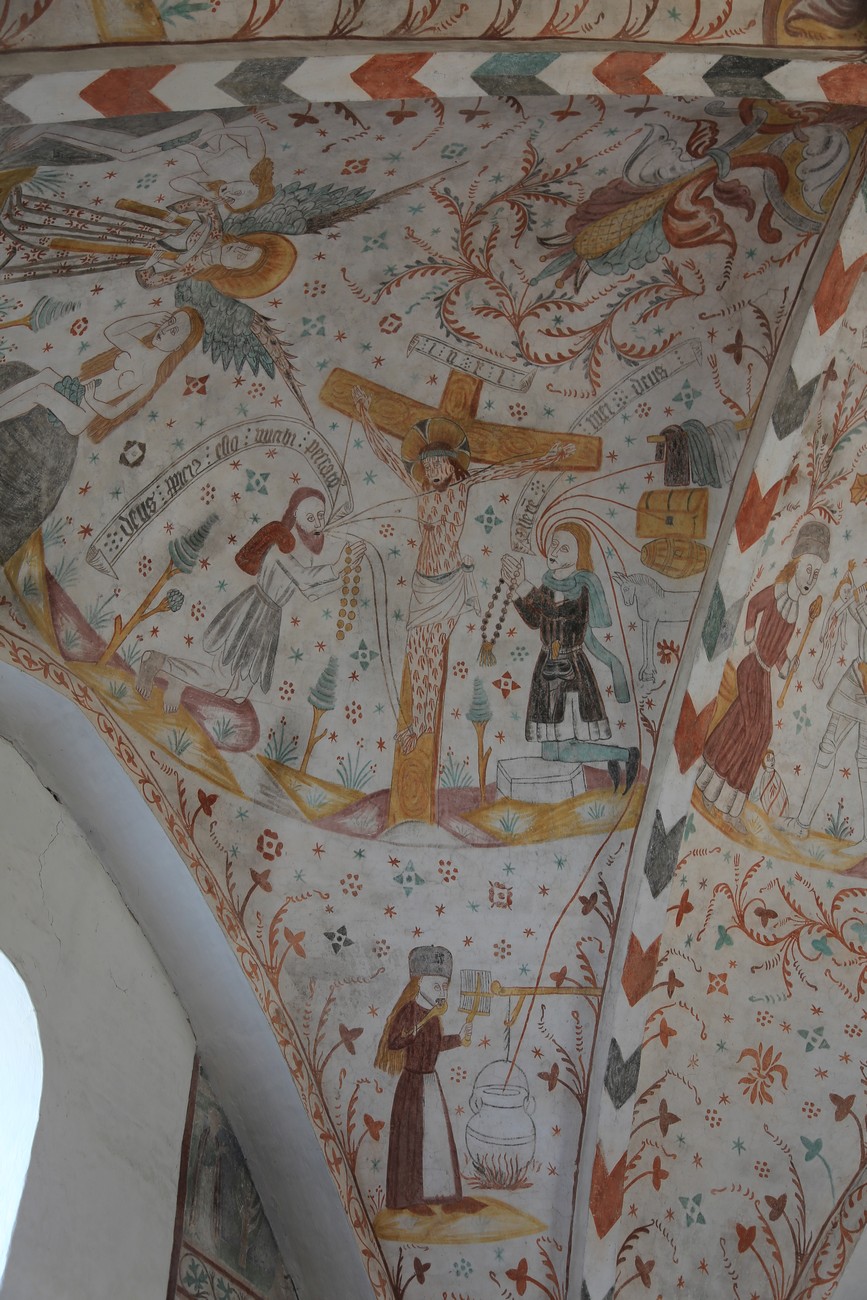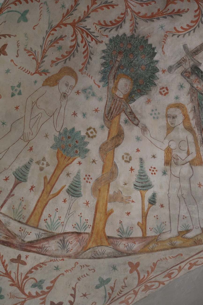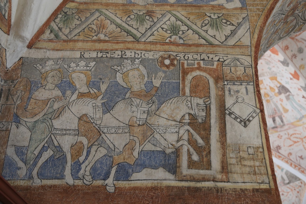 Auto käynnistyi iloisesti, tyhjäkäynti hieman röpötti mutta valot eivät palaneet ja matkaan päästiin. Kävimme heti alkajaisiksi huvittumassa ihan liikaa Keldbyn kirkon keskiaikaisista seinämaalauksista ja puuveistoksista. Niitä on kirjaimellisesti seinät ja katto täynnä, toinen toistaan mahtavampaa naivismia. Juu, olen minä hevosen nähnyt, eikös se piirretä vähän kuin iso koira? Ja crowdsurffaava jesse, se me laitetaan alttaritauluun. Meinasi naurattaa ääneen, mutta muiden läsnäolijoiden vuoksi hillitsimme itsemme - etenkin halusimme suojella yli-ikäisen sivarin näköistä, ilmeisesti suntiota, joka tomutti virsikijoja ahkerasti.