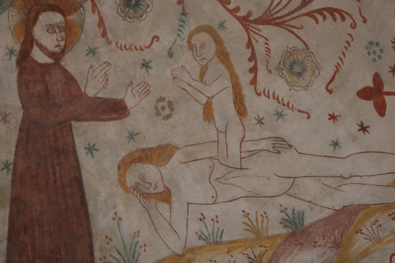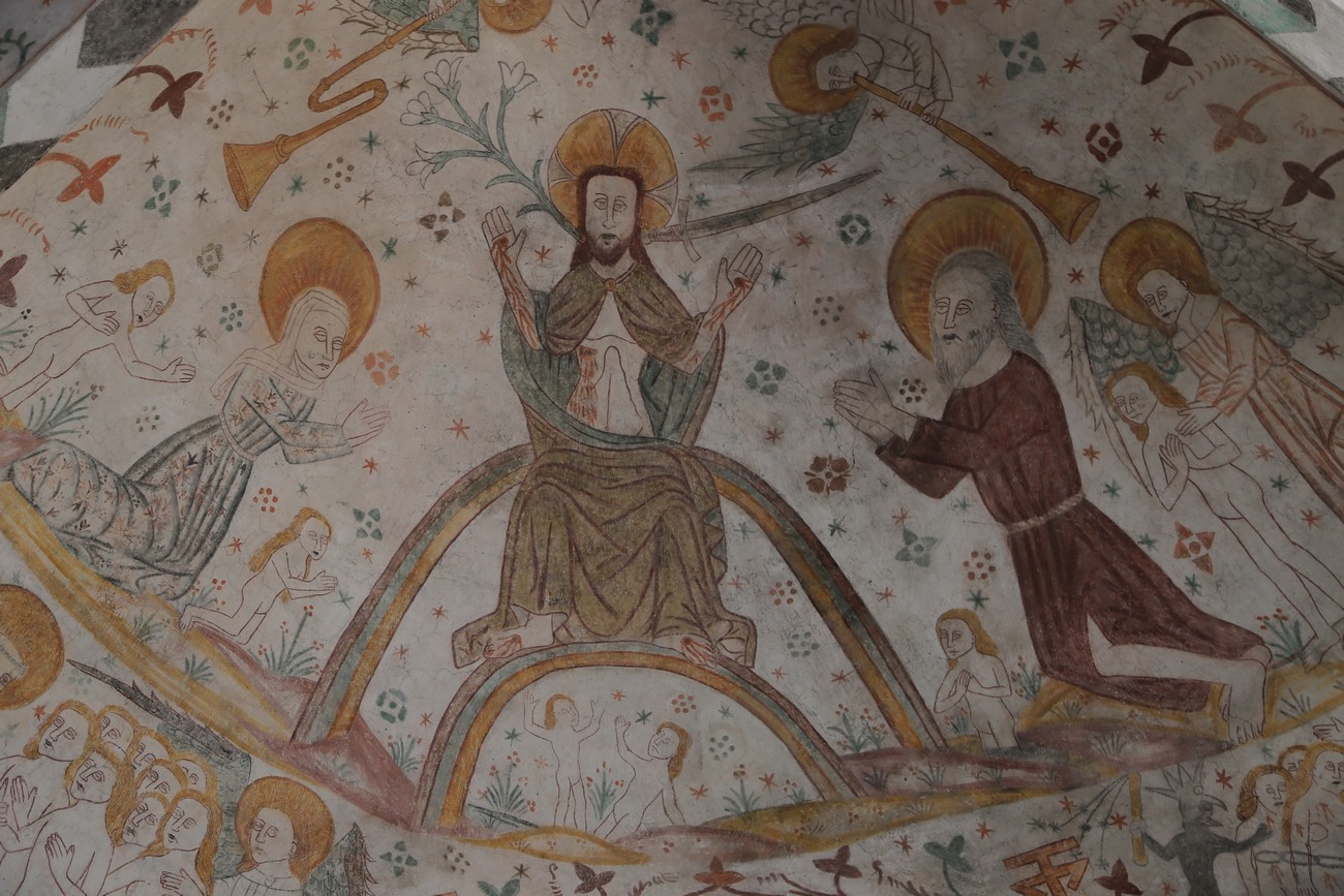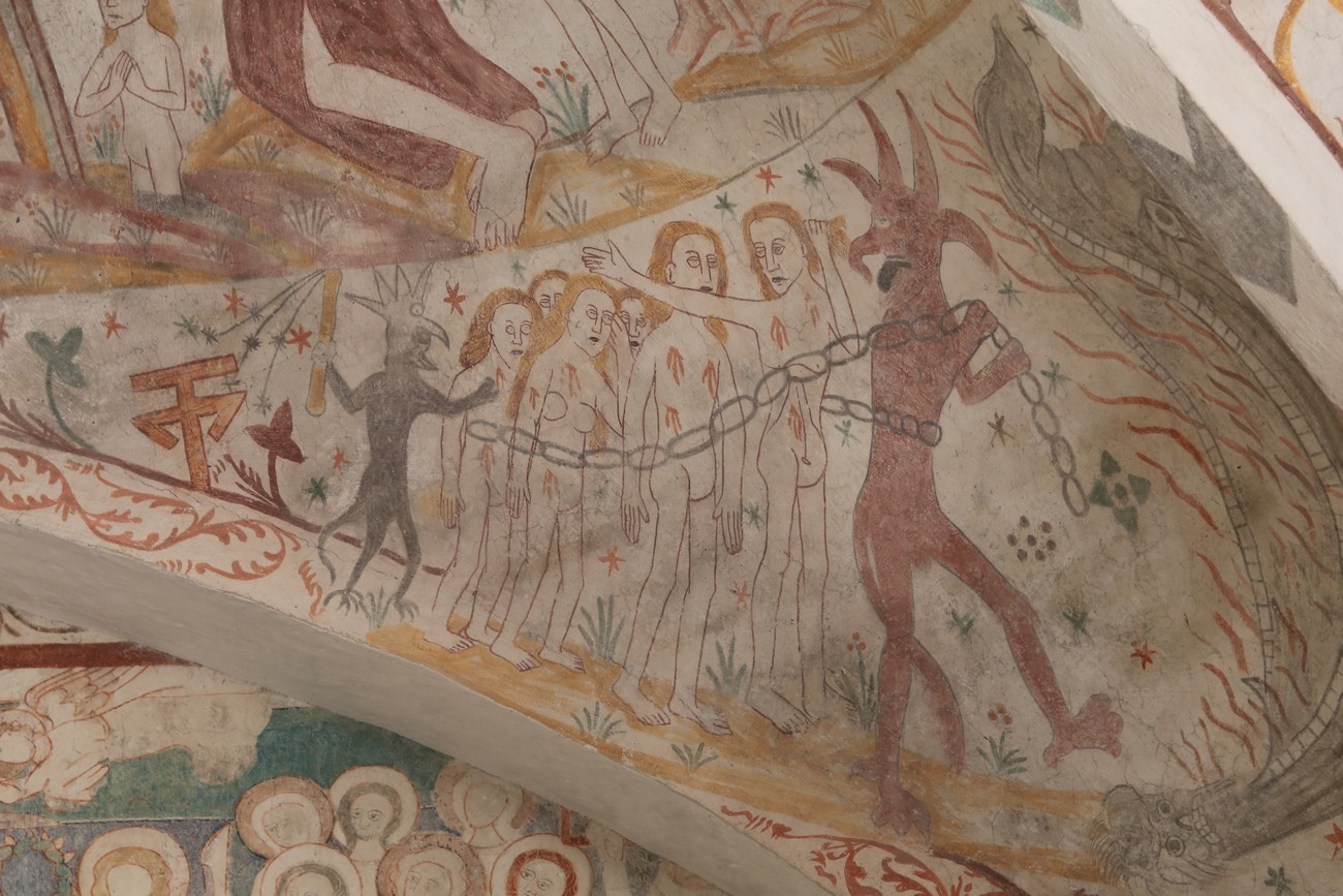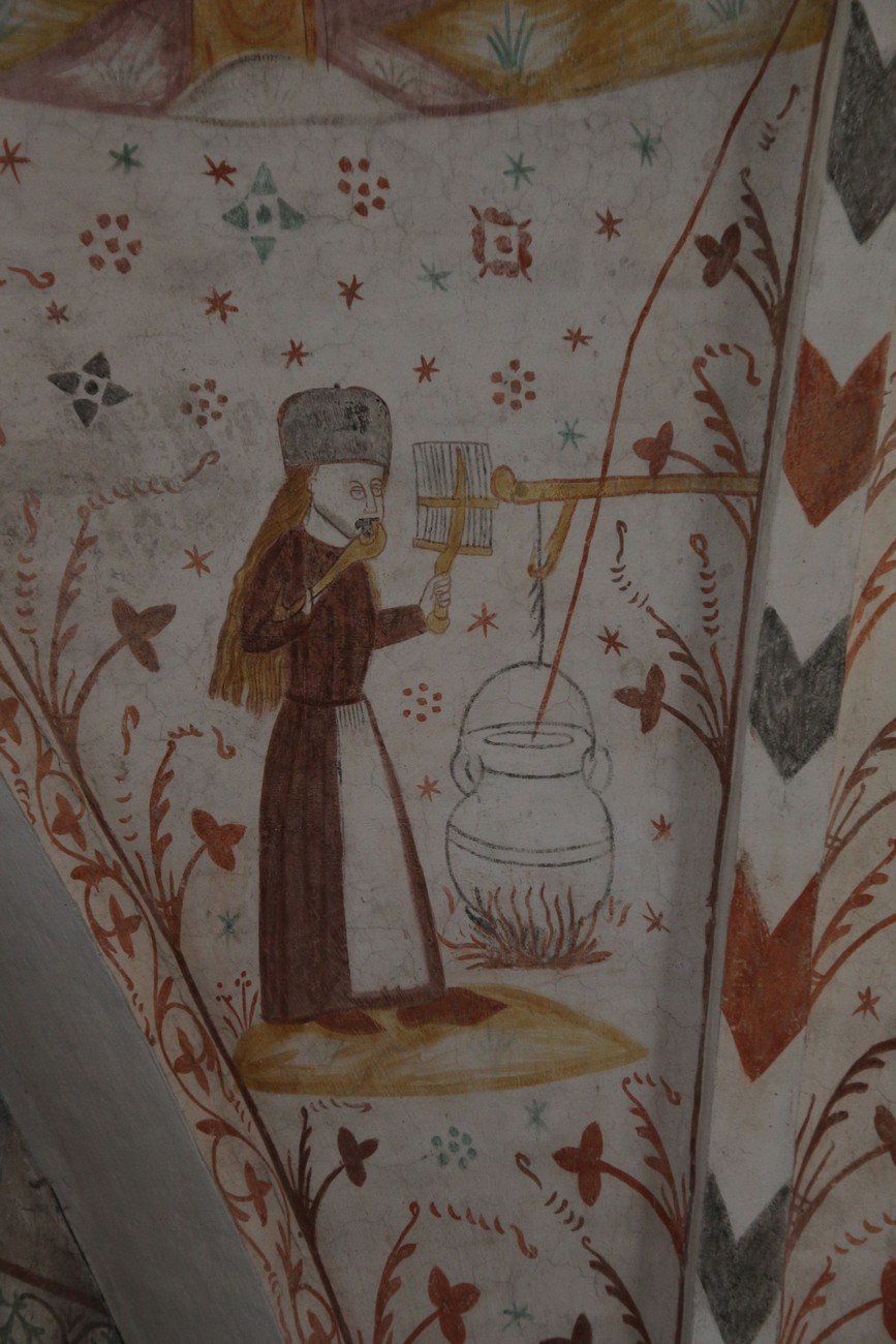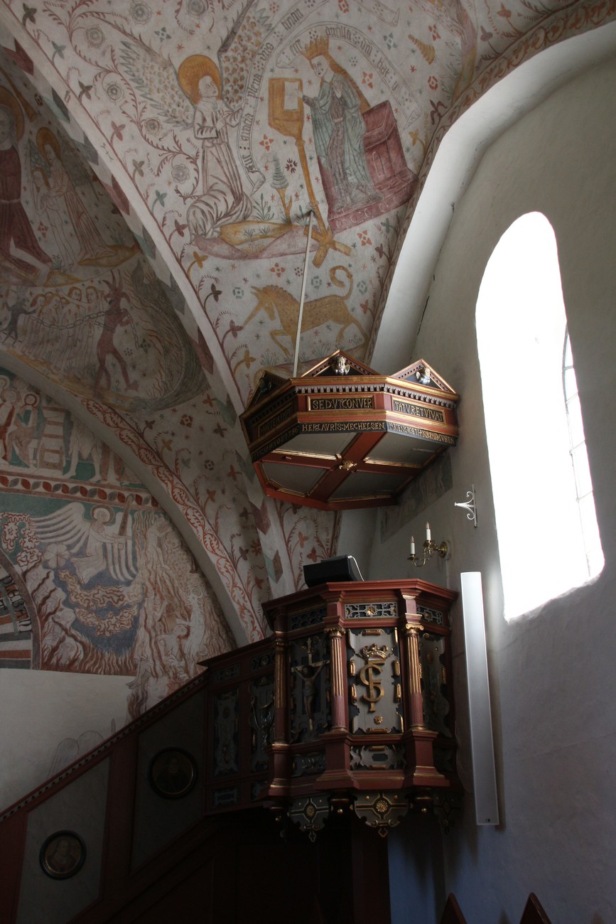 Auto käynnistyi iloisesti, tyhjäkäynti hieman röpötti mutta valot eivät palaneet ja matkaan päästiin. Kävimme heti alkajaisiksi huvittumassa ihan liikaa Keldbyn kirkon keskiaikaisista seinämaalauksista ja puuveistoksista. Niitä on kirjaimellisesti seinät ja katto täynnä, toinen toistaan mahtavampaa naivismia. Juu, olen minä hevosen nähnyt, eikös se piirretä vähän kuin iso koira? Ja crowdsurffaava jesse, se me laitetaan alttaritauluun. Meinasi naurattaa ääneen, mutta muiden läsnäolijoiden vuoksi hillitsimme itsemme - etenkin halusimme suojella yli-ikäisen sivarin näköistä, ilmeisesti suntiota, joka tomutti virsikijoja ahkerasti.