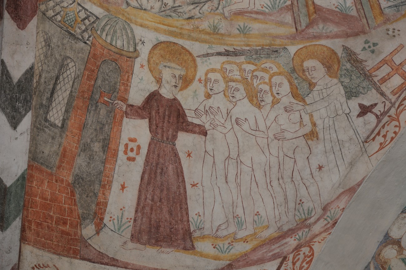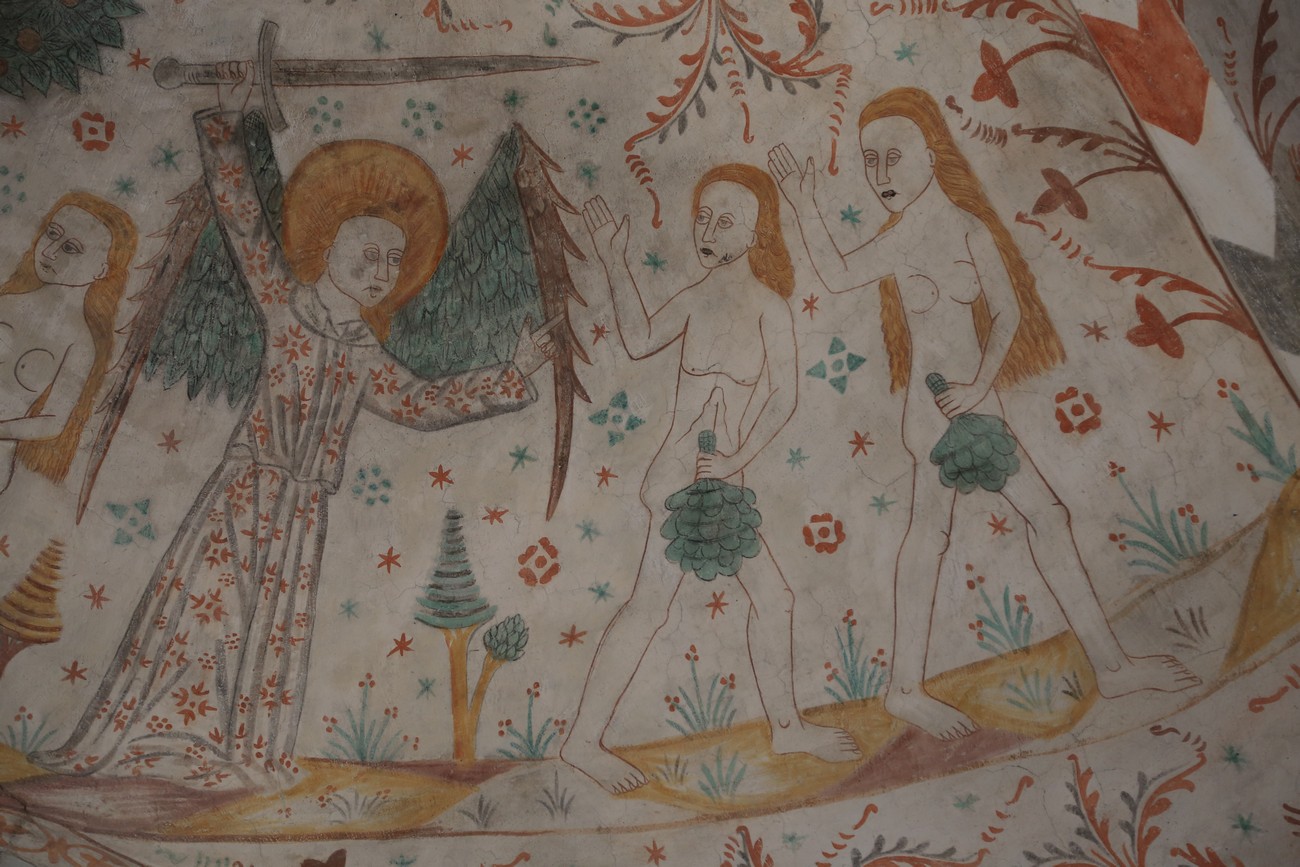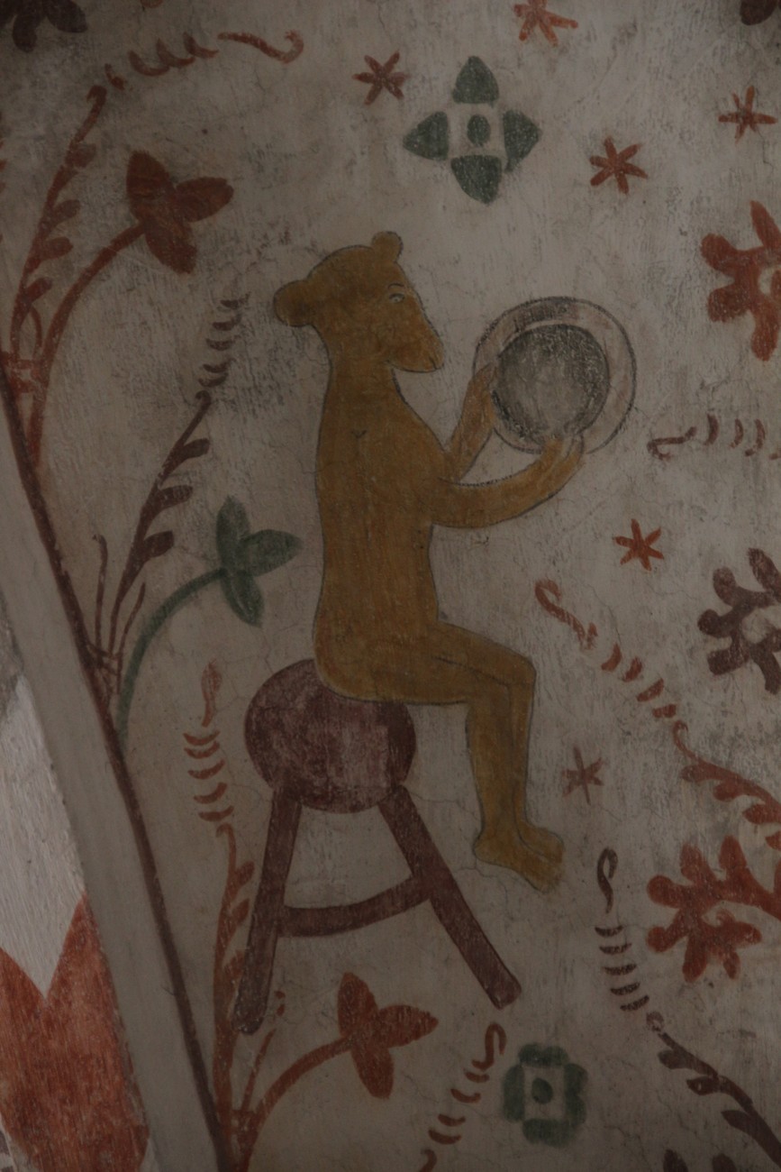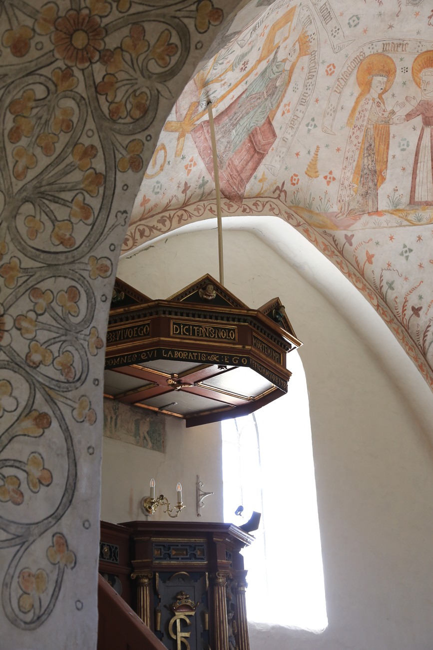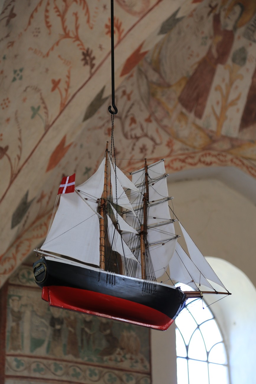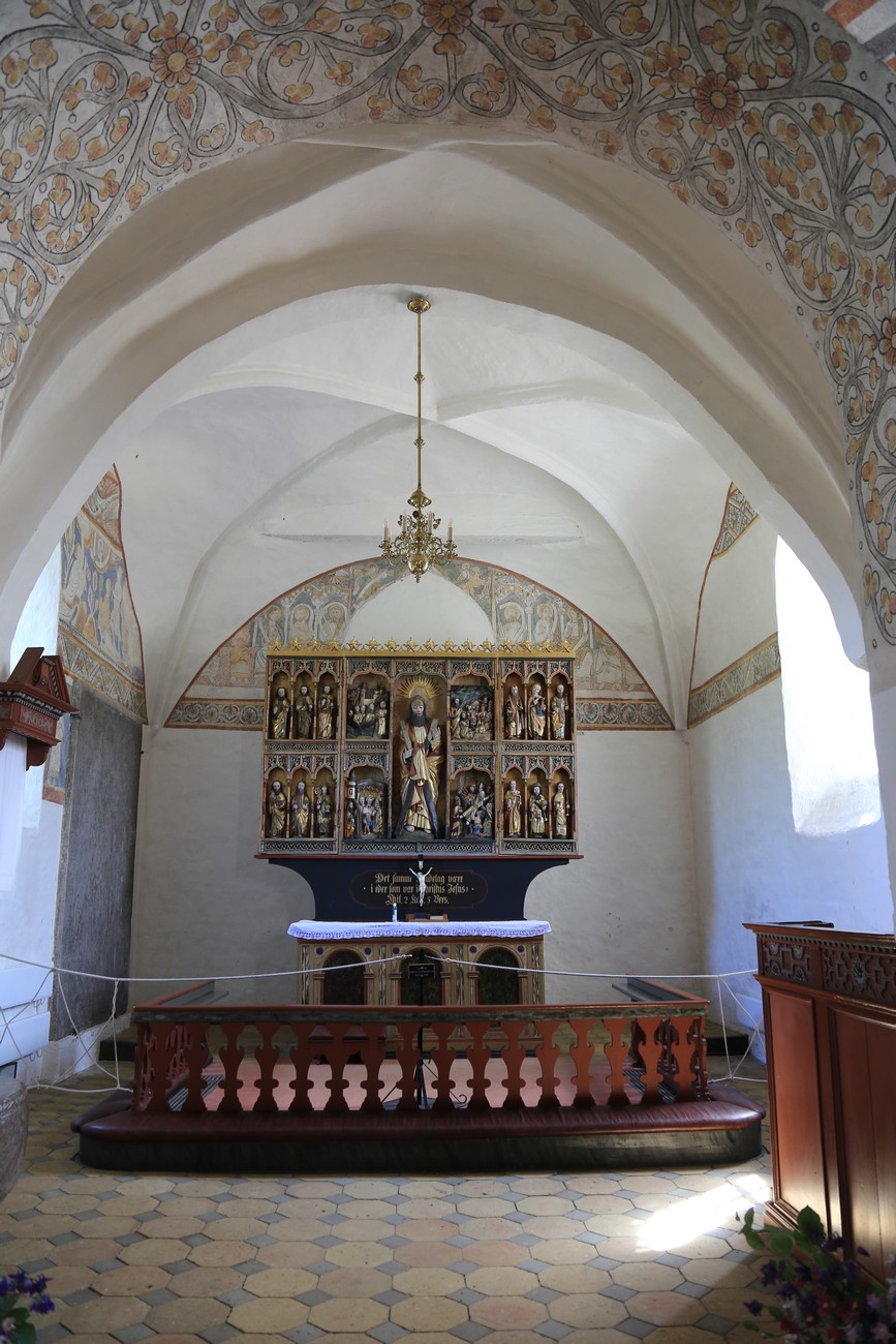 Auto käynnistyi iloisesti, tyhjäkäynti hieman röpötti mutta valot eivät palaneet ja matkaan päästiin. Kävimme heti alkajaisiksi huvittumassa ihan liikaa Keldbyn kirkon keskiaikaisista seinämaalauksista ja puuveistoksista. Niitä on kirjaimellisesti seinät ja katto täynnä, toinen toistaan mahtavampaa naivismia. Juu, olen minä hevosen nähnyt, eikös se piirretä vähän kuin iso koira? Ja crowdsurffaava jesse, se me laitetaan alttaritauluun. Meinasi naurattaa ääneen, mutta muiden läsnäolijoiden vuoksi hillitsimme itsemme - etenkin halusimme suojella yli-ikäisen sivarin näköistä, ilmeisesti suntiota, joka tomutti virsikijoja ahkerasti.