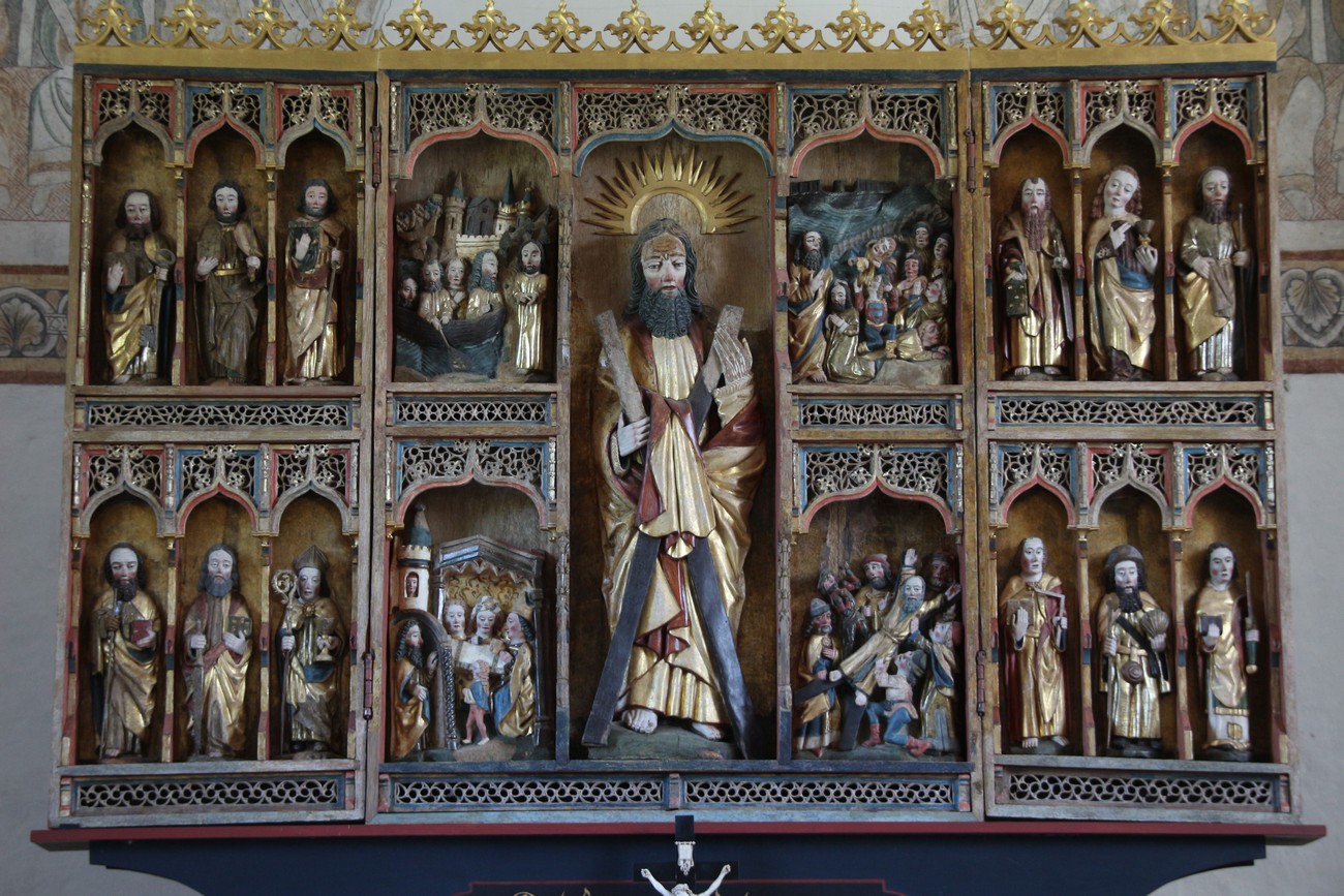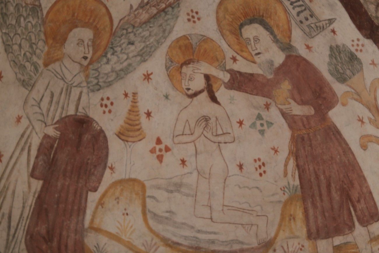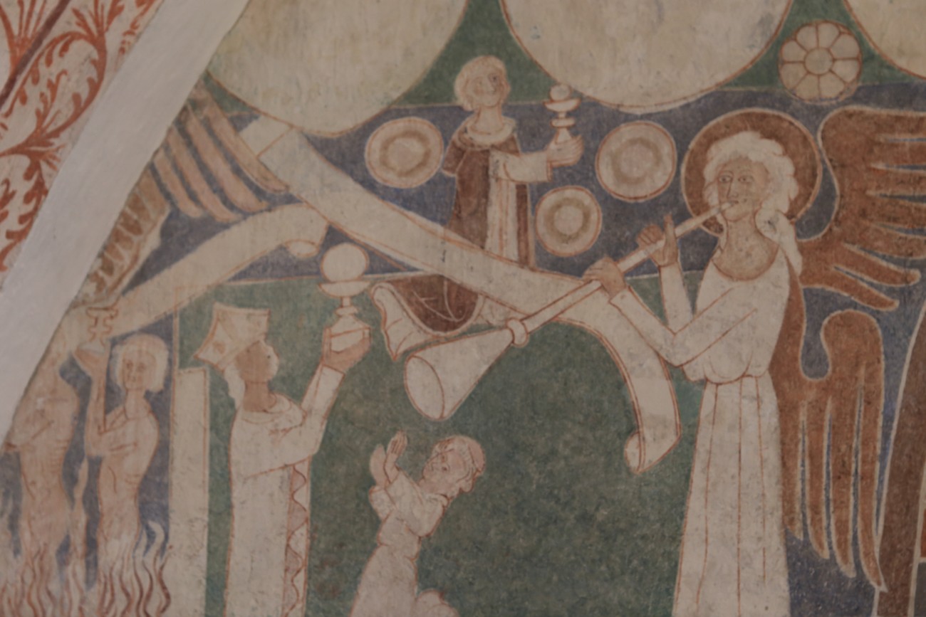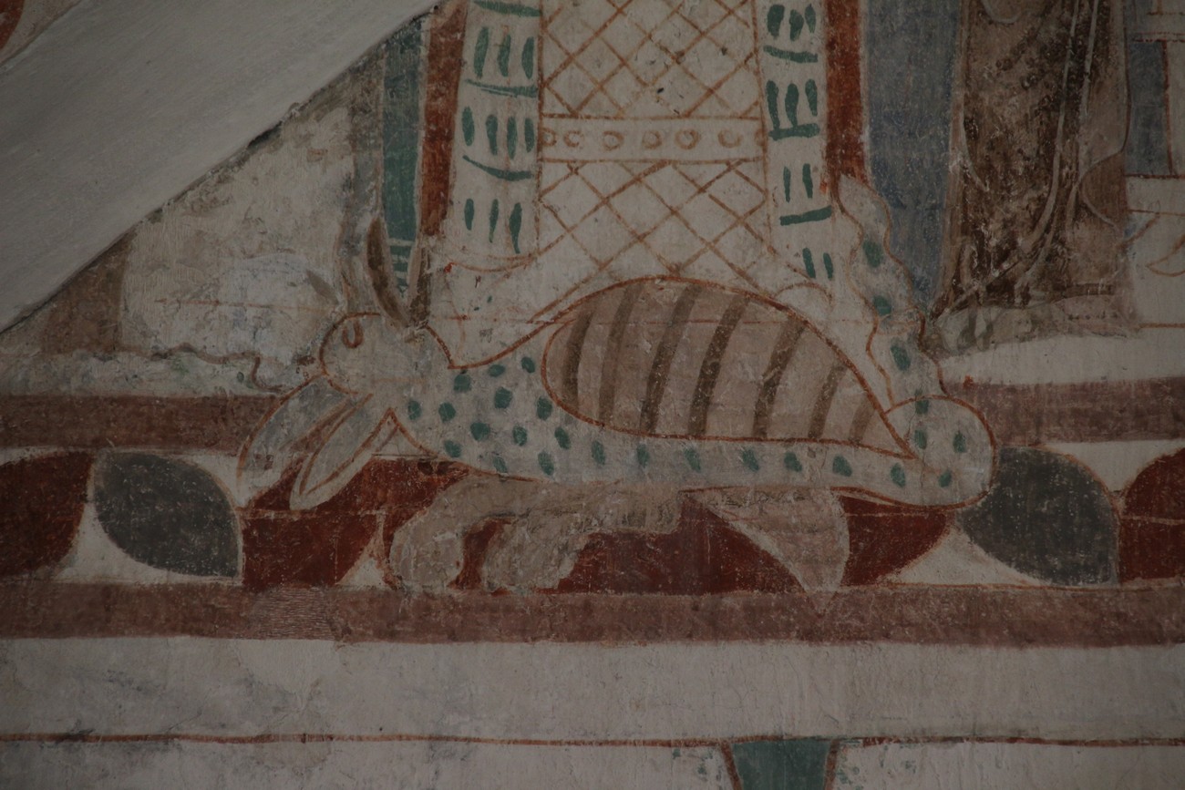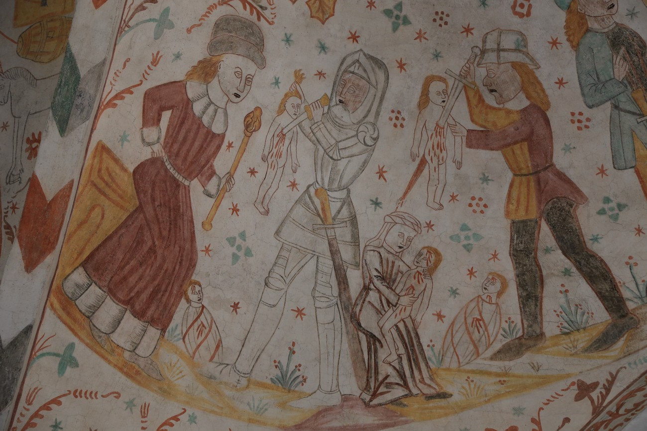 Auto käynnistyi iloisesti, tyhjäkäynti hieman röpötti mutta valot eivät palaneet ja matkaan päästiin. Kävimme heti alkajaisiksi huvittumassa ihan liikaa Keldbyn kirkon keskiaikaisista seinämaalauksista ja puuveistoksista. Niitä on kirjaimellisesti seinät ja katto täynnä, toinen toistaan mahtavampaa naivismia. Juu, olen minä hevosen nähnyt, eikös se piirretä vähän kuin iso koira? Ja crowdsurffaava jesse, se me laitetaan alttaritauluun. Meinasi naurattaa ääneen, mutta muiden läsnäolijoiden vuoksi hillitsimme itsemme - etenkin halusimme suojella yli-ikäisen sivarin näköistä, ilmeisesti suntiota, joka tomutti virsikijoja ahkerasti.