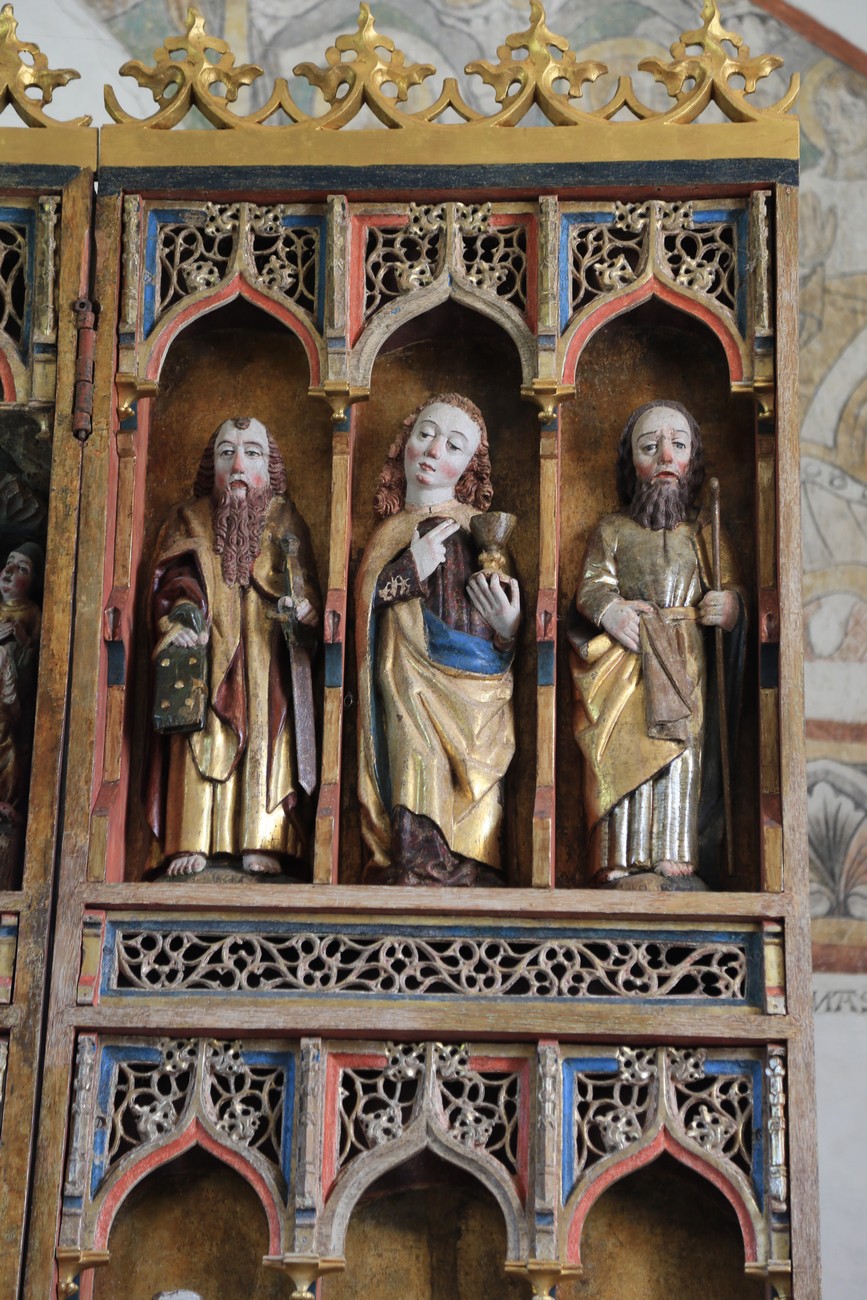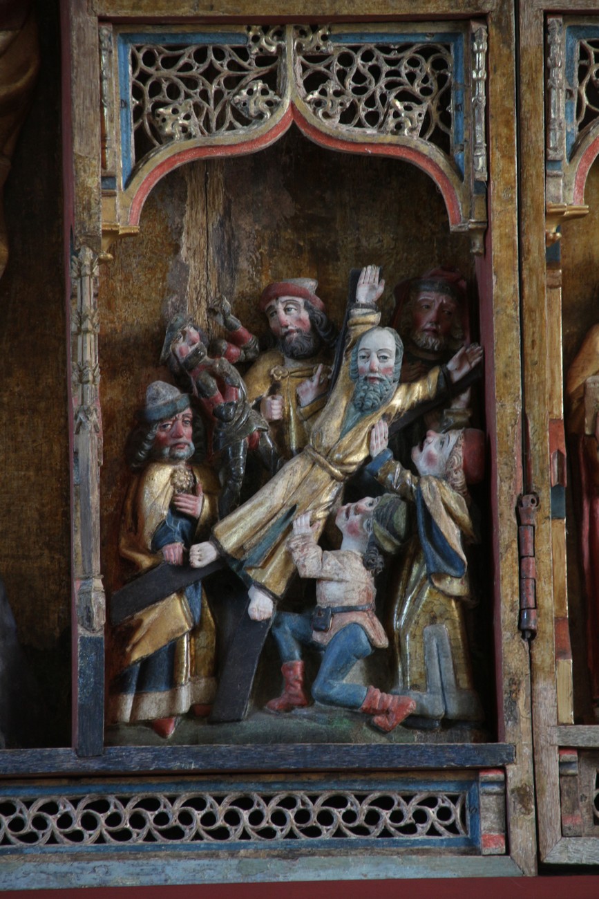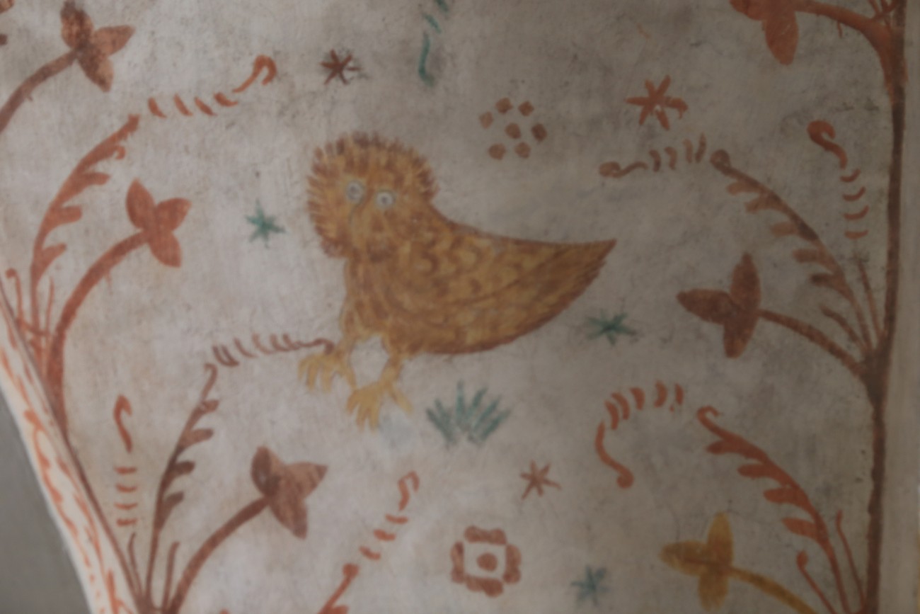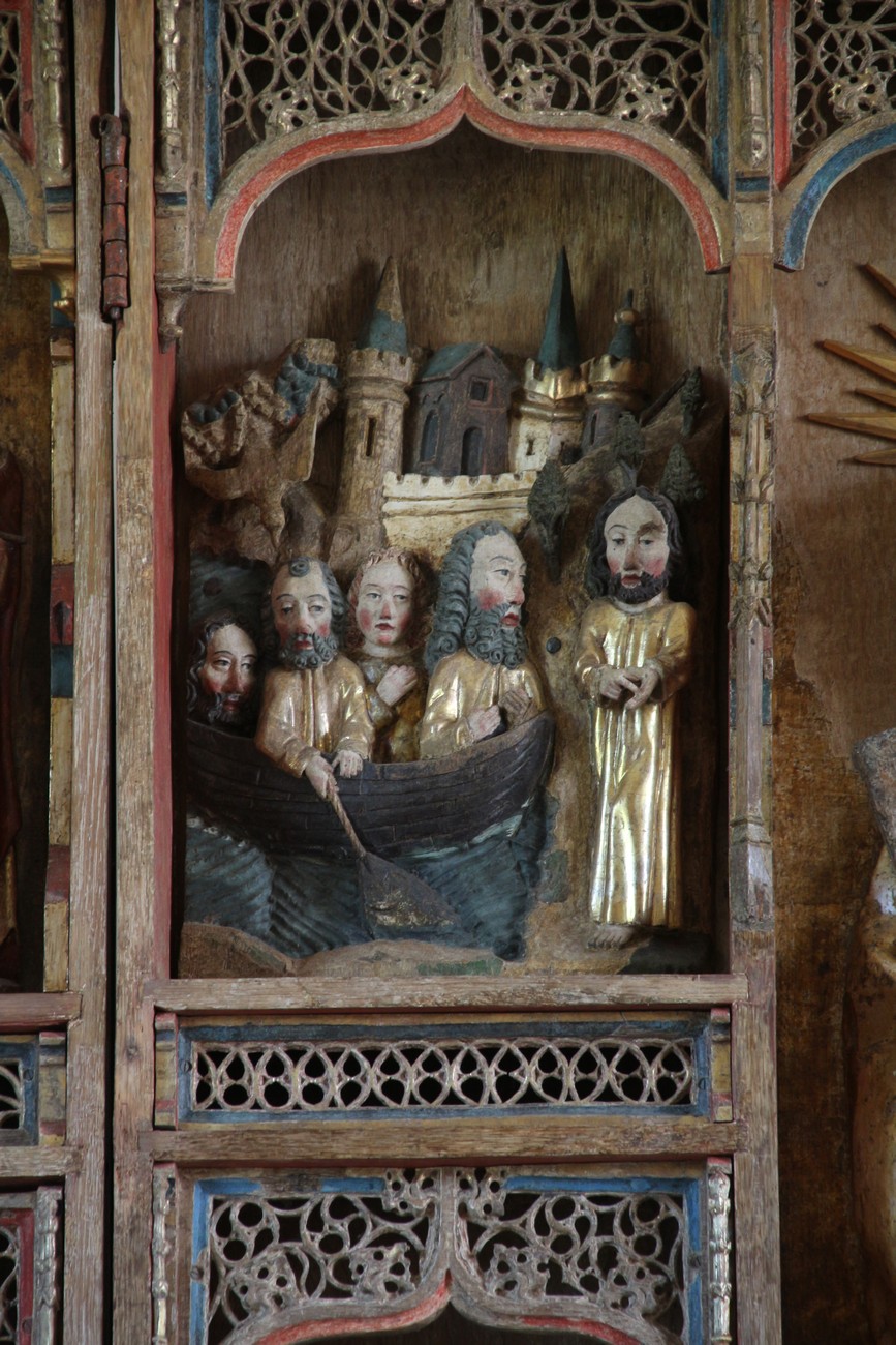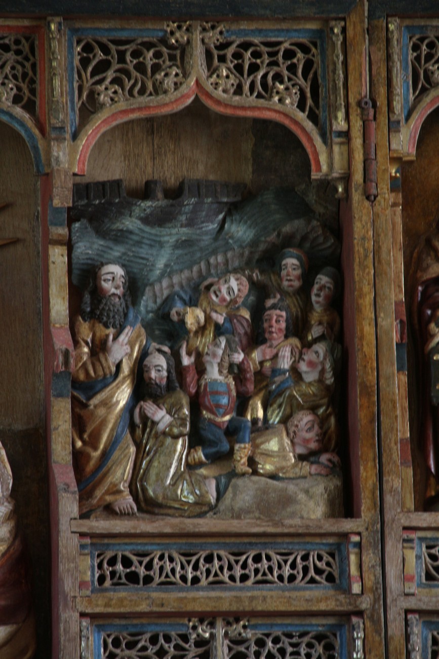 Auto käynnistyi iloisesti, tyhjäkäynti hieman röpötti mutta valot eivät palaneet ja matkaan päästiin. Kävimme heti alkajaisiksi huvittumassa ihan liikaa Keldbyn kirkon keskiaikaisista seinämaalauksista ja puuveistoksista. Niitä on kirjaimellisesti seinät ja katto täynnä, toinen toistaan mahtavampaa naivismia. Juu, olen minä hevosen nähnyt, eikös se piirretä vähän kuin iso koira? Ja crowdsurffaava jesse, se me laitetaan alttaritauluun. Meinasi naurattaa ääneen, mutta muiden läsnäolijoiden vuoksi hillitsimme itsemme - etenkin halusimme suojella yli-ikäisen sivarin näköistä, ilmeisesti suntiota, joka tomutti virsikijoja ahkerasti.