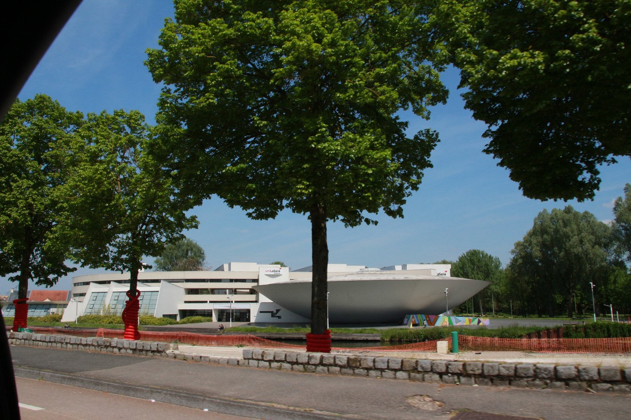 Kämpille päästyä ilta oli vielä nuori, joten kamera kantoon ja kaupungille. Krista hyytyi päivän ylämäkiharjoituksiin ja jäi pakkailemaan, itse kävelin pari korttelia vanhempaan ja köyhempään osaan Amiensia, työläisten puolelle. Siellä kanavat ja kadut risteilevät, talot ovat pieniä, värikkäitä ja vähän vinoja, osa viimeisen päälle kunnostettu ja osa tyhjillään ja huonommassa hapessa. Teema näyttää siis jatkuvan maasta toiseen, pienillä vivahde-eroilla. Baareja ja ravintoloita riittää etenkin isomman kanavan varrella ja hälinä on perjantai-iltana auringonaskun aikaan melkoisen tiheä. Kävelin syvemmälle naapurustoon, baarit vähenivät mutta laadukas katutaide lisäntyi. Tuli vastaan yliopiston modernimpia rakennelmia, ne antoivat hyvän kontrastin vanhemmalle rakennuskannalle - ja sopivat kerrankin paikkaansa.