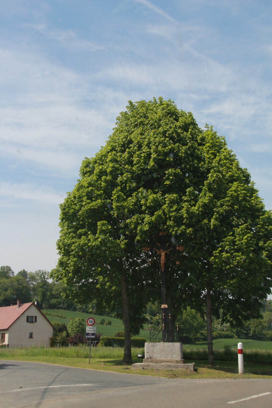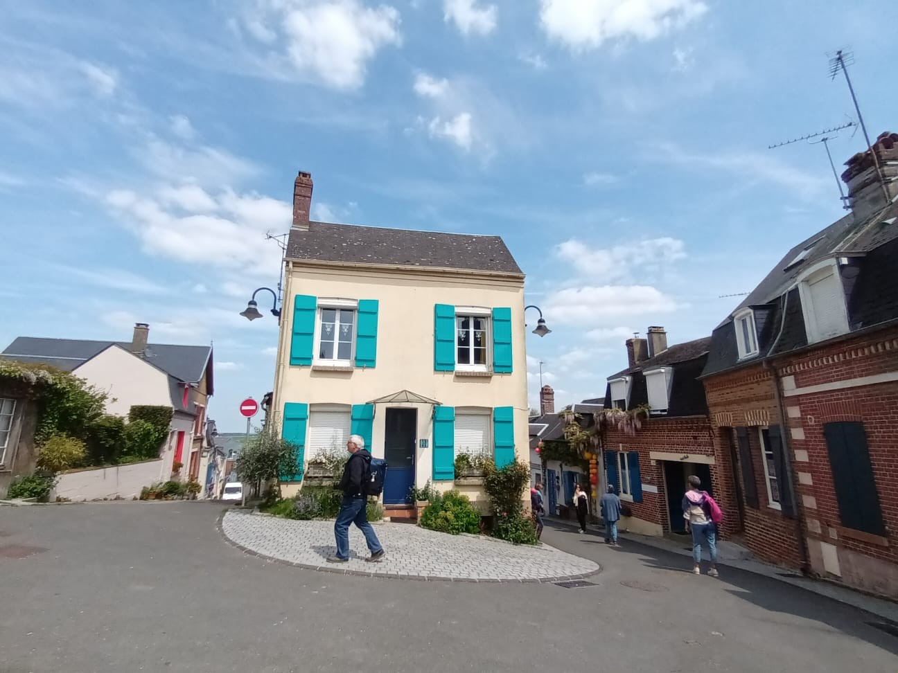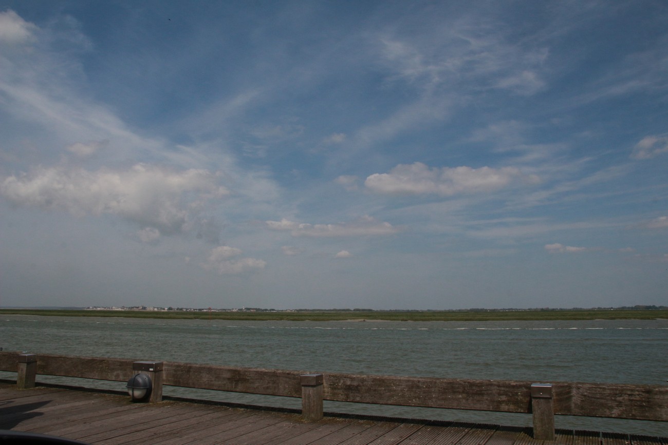 Tie kumpuili alkuun, mutta tasoittui sitten jokisuiston ja marskimaan lähestyessä. Pellot ja metsälaikut vuorottelivat - usein kuljettiin aika korkealla, mäkien päältä näki avarassa maisemassa kauas. Ruoho vihersi lähes koomisen kirkkaana, isot pilvet kiirehtivät tummansinisellä taivaalla ja usva nousi aika piankin sinertämään lähimpiäkin kukkuloita. Tuuli vei auringolta terän, oli sopivan lämmin. Kohteen lähestyessä liikenne lisääntyi, itse kylä oli jo totaalisen tukossa. Ensimmäiselle parkkipaikalle ei tahtonut edes päästä, niin paljon jumitavia turisteja palloili edessä - ja täynnähän se tietenkin oli. Toisella parkkiksella sama juttu, mutta tällä kertaa tien tukkona mopokerhon ikämiesjaosto. Toisaalta hyvä niin, koska muuan belgialaistäti ehti nähdä ahdinkomme ja vinkkasi, että he lähtevät ihan kohta, ruutu vapautuu. Ja vaikka maa olikin tässä kohtaa väärä, on todettava, että ranskalaisten tylyys ja ylimielisyys on kovaa vauhtia osoittautumassa myytiksi.