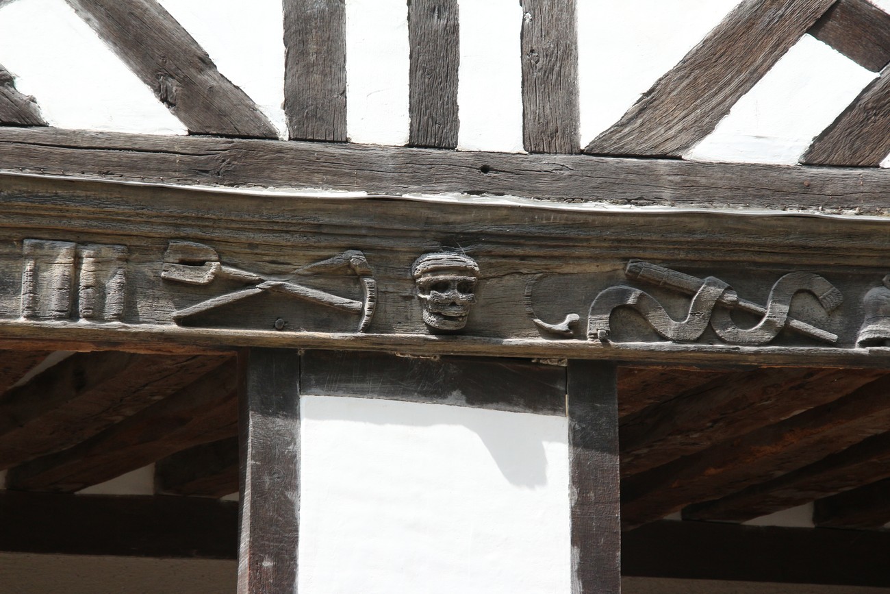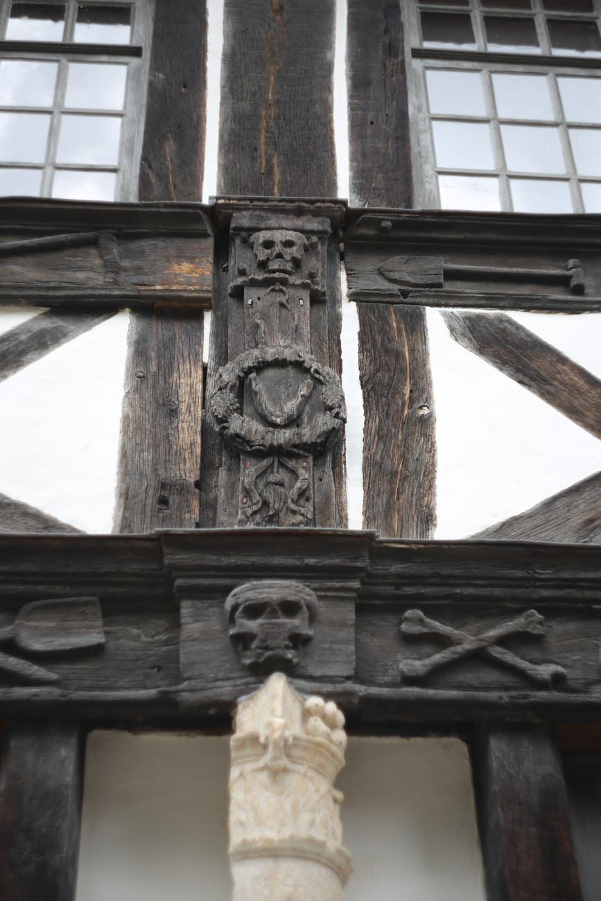 Pihalla kasvaa isoja puita ja seinien palkkeihin on kaiverrettu luita