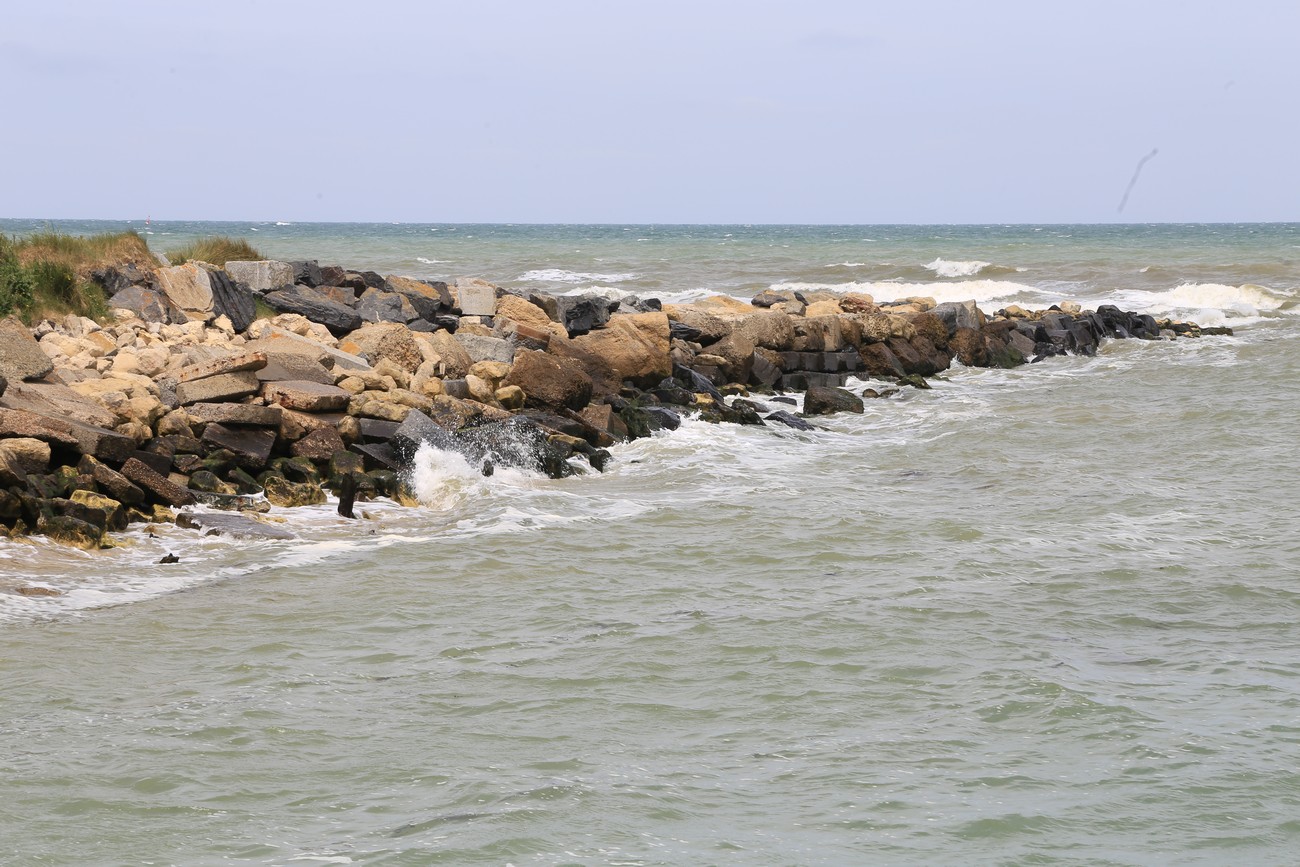 Seuraavana Arromanches-les-Bains ja nopeasti pysytyynpolkaistu väliaikainen satama, Port Mulberry. Ponttoonilaitureiden ja aallonmurtajien ruostuneita rankoja lojuu rannalla ja meressä siellä täällä, laajan puolikaaren muodossa - näky on jotenkin apokalyptinen, kuin katselisi jonkin muinaisen sivilisaation viimeisten hetkien jäänteitä. Katselimme näkyä kahdeltakin eri luiskalta, joilta olisi voinut ajaa suoraan rannalle. Vesi oli kuitenkin sen verran ylhäällä, ettei uskaltanut - kiinni jos jäisi, niin siellähän olisi - ja paikalliset nauraisivat, ainakin paikalliset lokit.