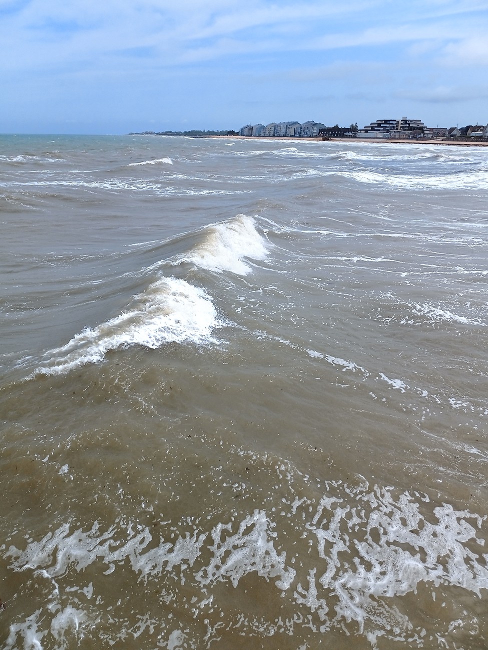 Rannan läheisyydessä tuuli kävi jo naurettavaksi, piti laittaa taas hattu laukkuun ja kiristää nutturaa. Katselin murtuvia aaltoja ja Juno Beachia laiturin nokasta. Näytti paljon helpommalta ja järkevämmältä paikalta nousta maihin kuin vaikka Omaha Beach: lyhyempi ranta, vain muutamia bunkkereita - ja, ennen kaikkea - ei kalkkikivijyrkännettä, jonka laelta jauhaa konekiväärillä. Kaksipuinen risti merkitsi paikan, jossa herra Charles de Gaule nousi maihin kuin joku ihmeentekijä tai tuleva presidentti.