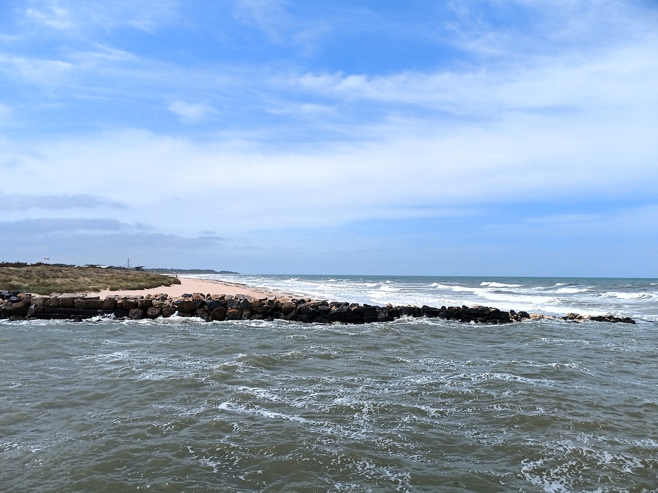 Ajoin vielä sataman toiselle puolelle, katsomaan vuorovettä pitkän laiturin kärjestä. Meri oli tosiaan paljon alempana kuin aamulla, mutta joen virtaus kulki väärään suuntaan. Laiturin pään jäkeen rakennelma jatkui aallonmurtajana pitkälle mereen, loistot vilkuttivat punaista ja vihreä, taivas hehkui punaista ja keltaista. Sitten sammuivat katuvalot, ihan muutamaa lukuunottamatta. Aika mennä kotiin.