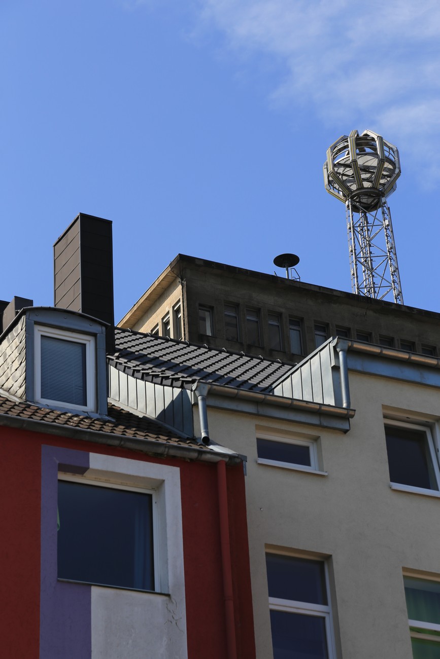 Kämpän haltuunoton jälkeen nautin miedosti epäilyttävän mikroaterian jonka kylmäketju oli taatusti katkennut ja pakenin sitten mäkeä alas ja kaupungille. Tarkoitus oli kävellä vain pari korttelia, mutta alaspäin meno olikin yllättävän helppoa. Bongasin muutamia hienoja katutaiteita ja paljon kivoja näkymiä; aurinko oli parhaassa asemassa, samassa josta eilen kipuilin. Keskustassa näin muutaman eri kirkon, raatihuoneen, epäilyttäviä hahmoja sisältävän suihkulähteen, suljetut markkinat, todella kuppaisen astronomisen kellon mallia tee-se-itse-80-luvulla, muhkuraisella ja kourumaisella asfaltilla päällystetyn kävelykeskustan (ehkä se oli kesken) ja lopulta sen mitä tulin katsomaan: Wuppertaler Schwebebahnin eli yläpuolisista raiteista roikkuvan, yksikiskoisen junan. Kummallinen laitos, täysin toisesta ajasta ja vielä ripustettuna matalana virtaavan Wupper-joen päälle.