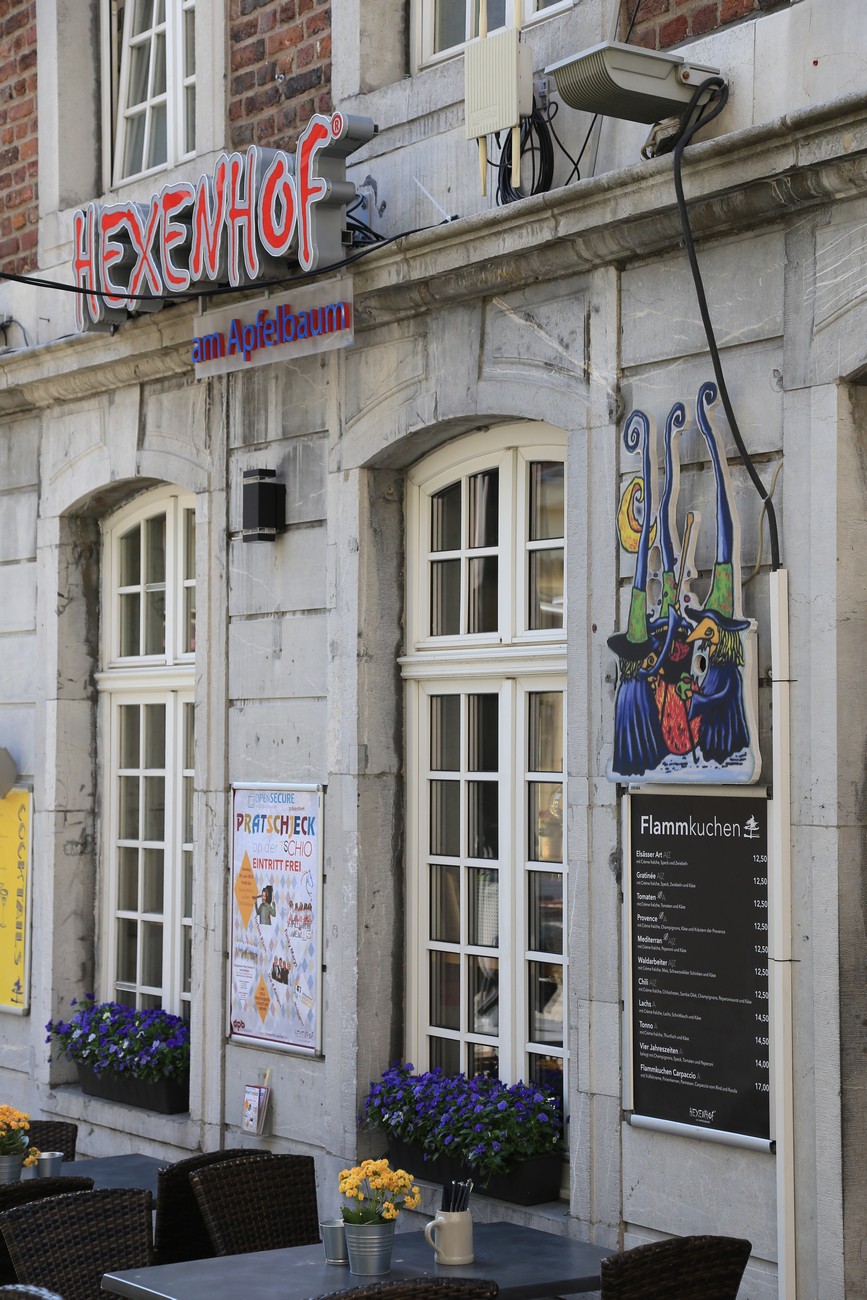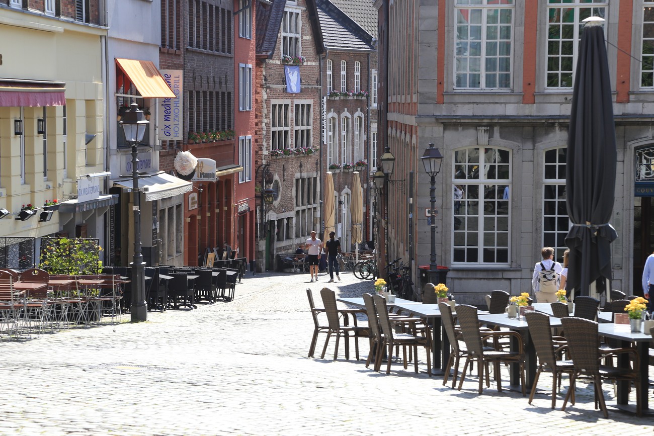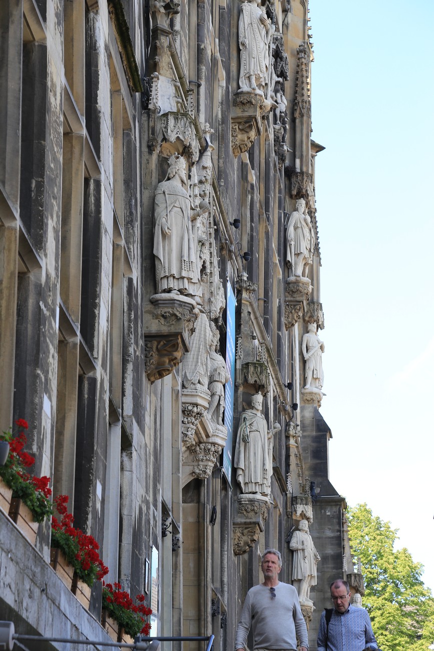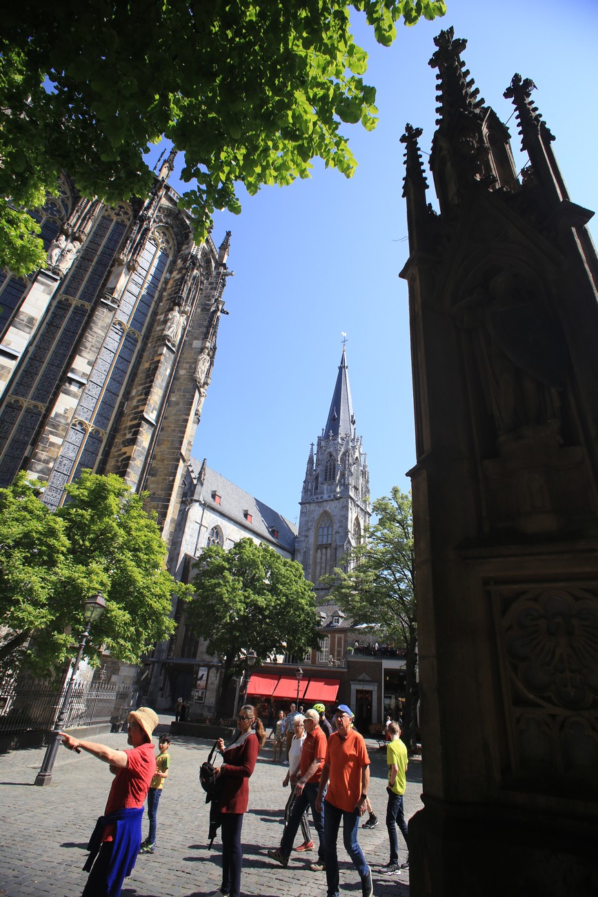 Ajelimme muutaman korttelin keskustaan, auto sai jäädä kalliiseen parkkiin. Kyseinen luola kun ei ollut tuttu, en tiennyt minne kannattaa jättää että on uloskäynnin lähellä - ja että hissikin löytyy. Nähdessän portaat Krista sai jonkinlaisen eksistentialistisen kriisin tai paniikkikohtauksen ja päätti mennä autoon murjottamaan. Pakotin sen kiipeämään yhden kerroksen ylöspäin ja ulkoilmaan, mutta pidemmälle se ei suotunut. Hääti minut kaupungille puoliväkisin, että mene nyt katsomaan. Ja koska aikuisen sanaan kuuluu voida luottaa, etenkin jos on jo monta kertaa kysynyt, minähän menin. Yleiskuva Aachenista on hieman suttuinen, mutta vehreä ja viihtyisä. Tähän asti ajetut keskustan iso kadut ovat poikkeuksetta isojen puiden varjostamia ja viileitä ja niiden mutkat soljuvat kuin suunniteltuina - toisin kuin Ranskassa, jossa pitää välillä mahtua mahdottomista rakosista tai kääntyä melkeinpä itsensä ympäri. Aachenin kadut eivät kuitenkaan olleet vastalakaistut, eikä ruohoa ollut ajettu oikein mistään. Ja nyt vanhassa keskustassa pisti silmään pummien, krustipunkkareiden ja kerjäävien nistien suuri määrä - ihan kuin Berliinin huonoilla (eli hyvillä) alueilla tai Hampurissa. Näin pienessä ja pikkusievässä paikassa moinen touhu erottuu jotenkin erityisen hyvin.