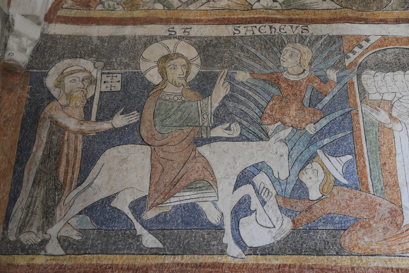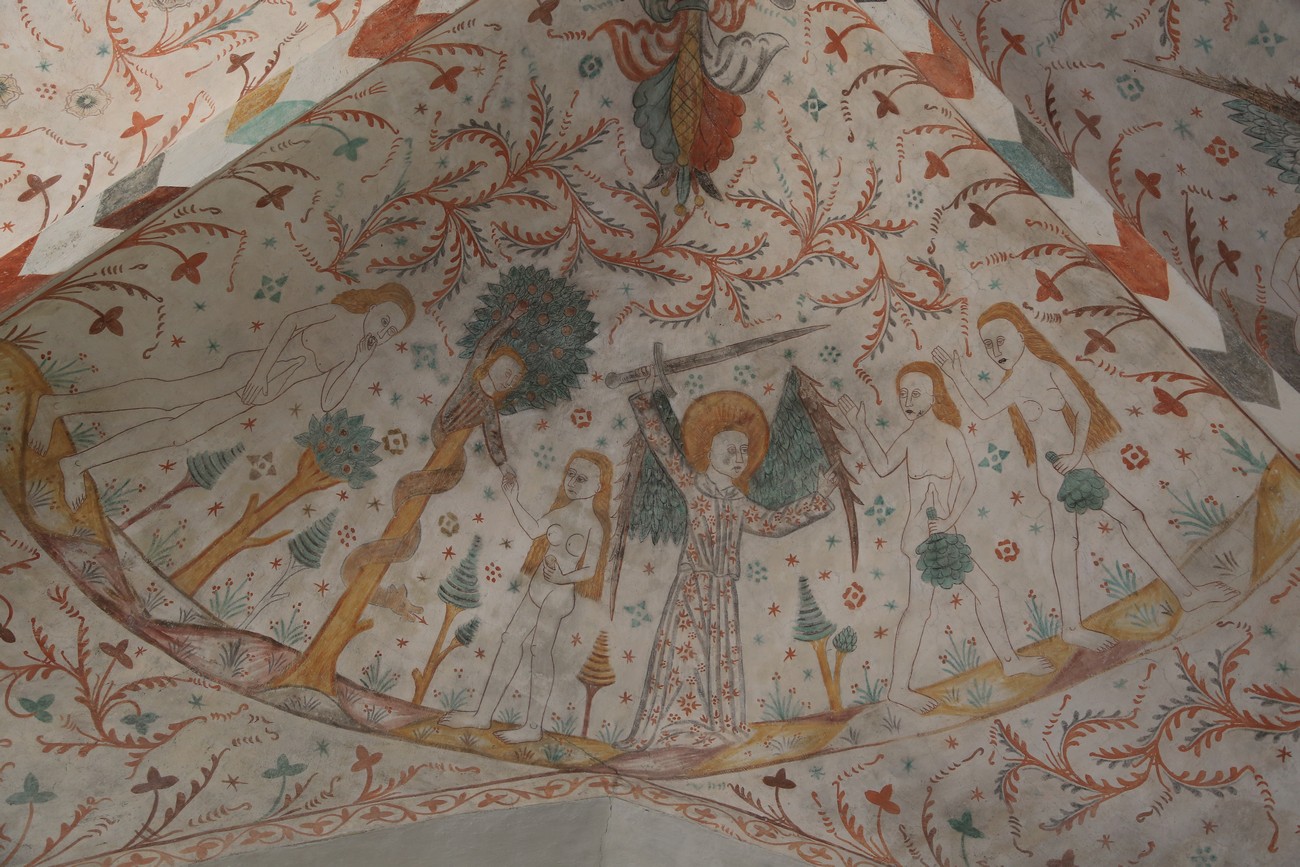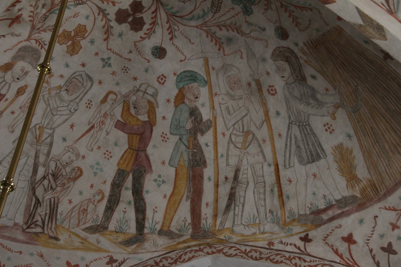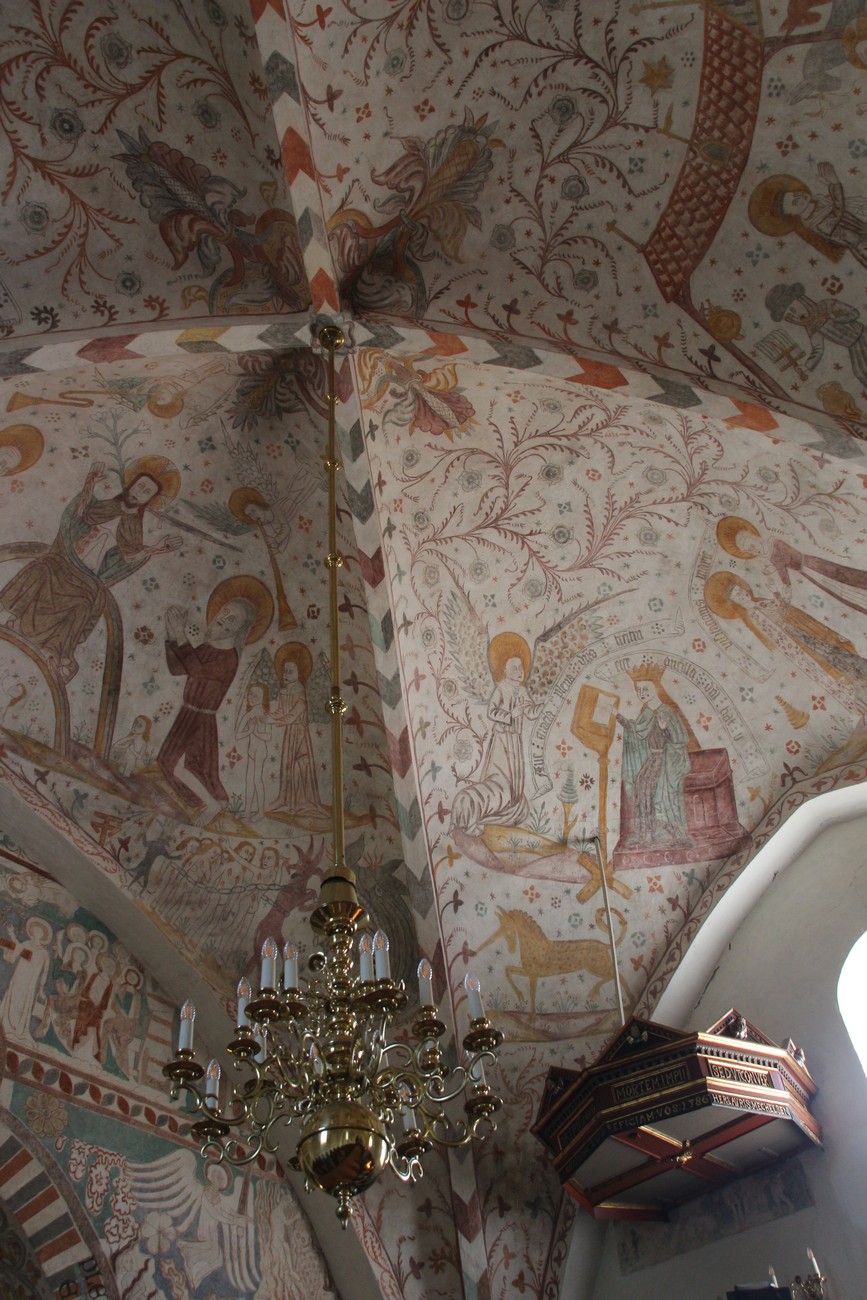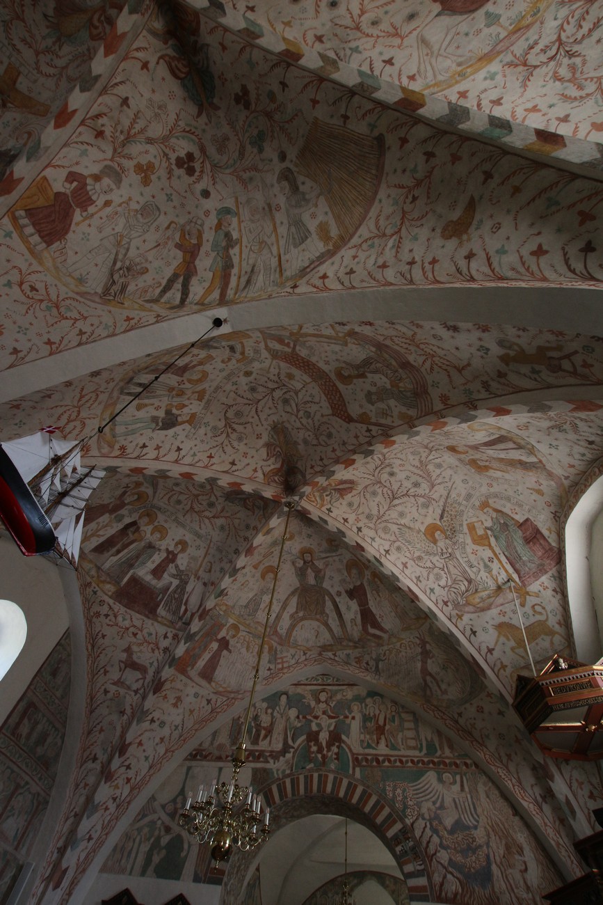 Auto käynnistyi iloisesti, tyhjäkäynti hieman röpötti mutta valot eivät palaneet ja matkaan päästiin. Kävimme heti alkajaisiksi huvittumassa ihan liikaa Keldbyn kirkon keskiaikaisista seinämaalauksista ja puuveistoksista. Niitä on kirjaimellisesti seinät ja katto täynnä, toinen toistaan mahtavampaa naivismia. Juu, olen minä hevosen nähnyt, eikös se piirretä vähän kuin iso koira? Ja crowdsurffaava jesse, se me laitetaan alttaritauluun. Meinasi naurattaa ääneen, mutta muiden läsnäolijoiden vuoksi hillitsimme itsemme - etenkin halusimme suojella yli-ikäisen sivarin näköistä, ilmeisesti suntiota, joka tomutti virsikijoja ahkerasti.