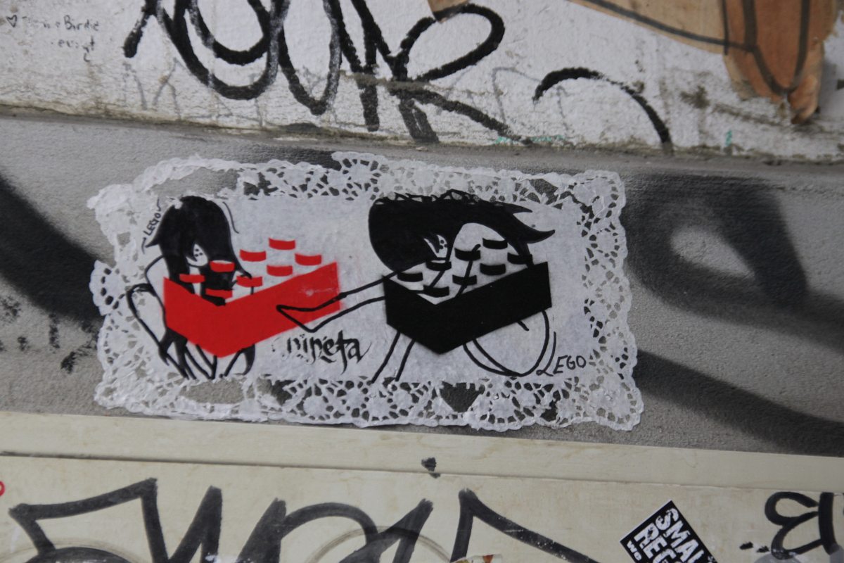 Katutaide toistaa itseään ulkoistetun sohvan luona.