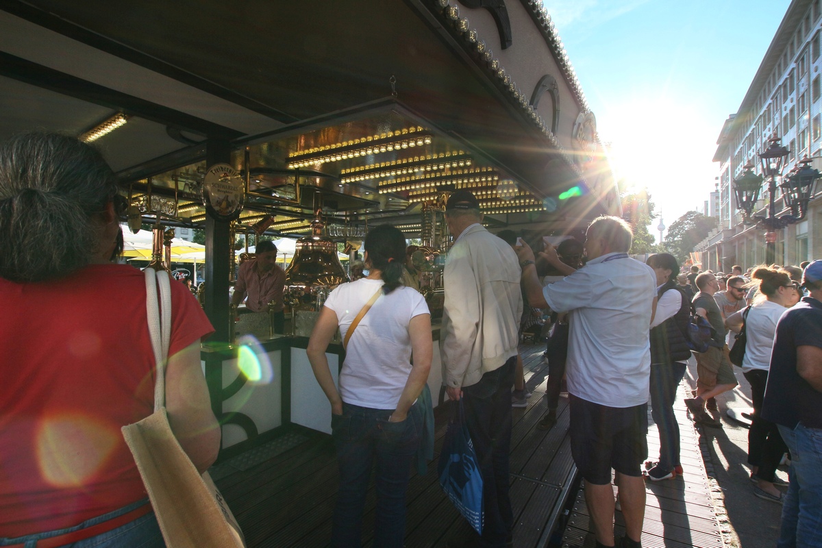 Berliinin kansainvälisten olutmessujen tapahtuma Berliner Biermeile. Monta kilometriä panimoja. Kai täälläkin syödäkseen saa.