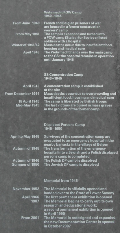 Pysähdys Bergen-Belsenin keskitysleirillä. Ölisevä teinilauma lähtee juuri, mummoja kärrätään bussista. Vierailijakeskus on yksinkertaista harmaata betonia ja näyttää kokoaan suuremmalta, järkälemäisen massiiviselta jopa. Sisällä lyö vastaan ihmisyyden mielettömyys: entisten vankien yhä miedon katkeria ja järkyttyneitä kertomuksia videolla, löytynyttä esineistöä, vankien piirroksia; filmejä vapautuksen päivistä, kun liittoutuneet laittoivat natsit hautaamaan kertyneitä kuolleita - ja kuinka lopulta oli pakko käyttää puskutraktoria. Siirrymme ulos, alkaa tihuttaa. Itse leiristä ei ole jäljellä mitään, vain hiljalleen metsittyvä ruohokenttä, siellä täällä kylttejä. Ohitamme hautakumpuja. "Tässä lepää 1000 ihmistä" "Tässä lepää 5000 ihmistä" ja lopulta "Tässä lepää tuntematon määrä ihmisiä."