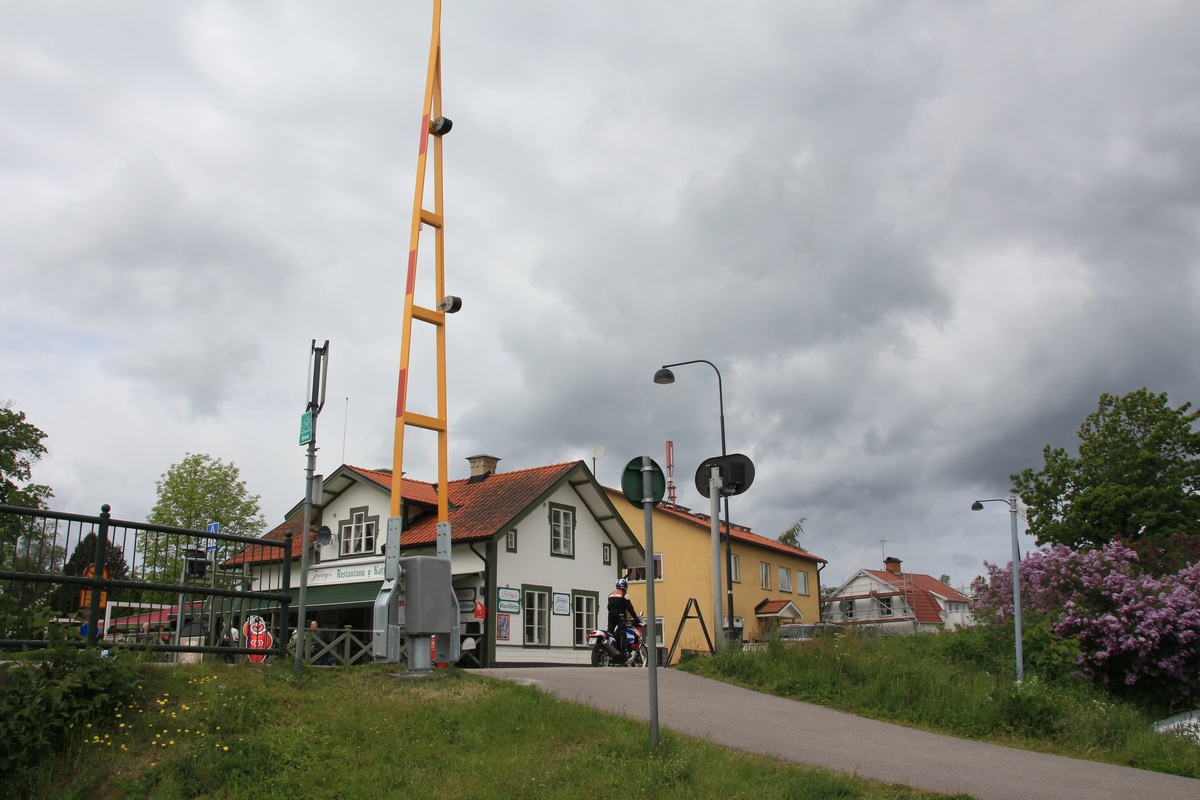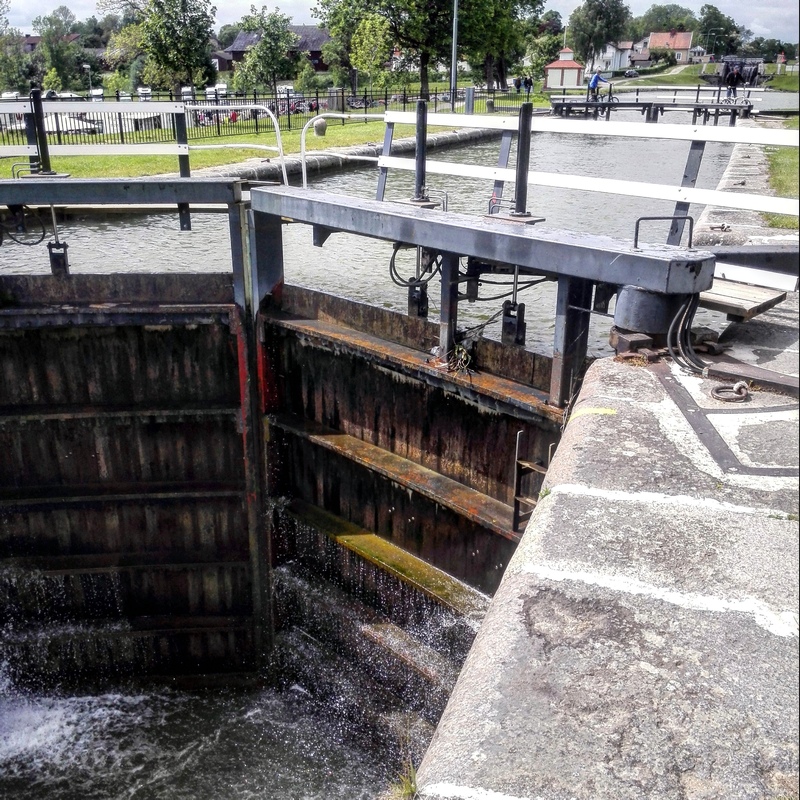 Ruotsinläpiajosyndrooman välttely alkoi Götan kanavalla, Bergs Slussarin eli vuoren sulkujen kohdalla. Kivasti se purjevene näytti kiipeävän ylämäkeen, pienellä avustuksella toki. Sulkuportit avautuivat äänettömästi, vesi ryöppysi vähemmän hiljaa, kanavoitsija veti venettä narussa, saksalaiset kuvasivat. Ja mikä parasta, tätä outoa näytelmää pääsi katsomaan aivan vierestä, ilman mitään turvakaiteita tai vouhotuksia. Ympäröivä kylä oli hyvin vauraan näköinen, on varmaankin muutama tullimaksu kerätty joskus 1800-luvulla.