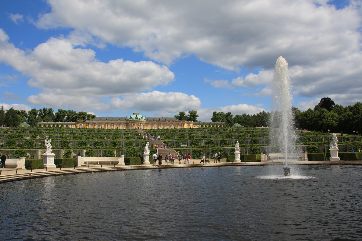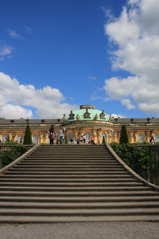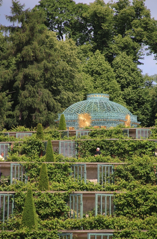 Aamulla ratikoitiin ja patikoitiin laukut ranskikselle ja suunnattiin linnoille. Niitä on täällä vähintään neljä, pienempiä sitten enemmän. Tällä kertaa ohjelmassa oli Schloss Sans Souci eli linna no worries, man. Heti portilla joku ukko, pukeutuneena menuettiperuukkiin ja samettiseen hännystakkiin, solkikenkiä unohtamatta, soiti huilulla Vivaldin vuodenaikoja. Olisi halunnut euron palkaksi, en antanut. Joku roti.