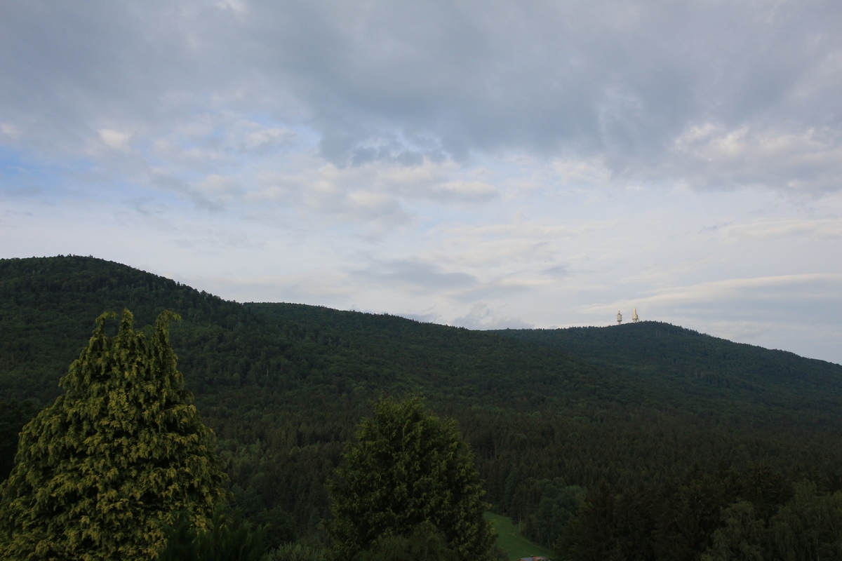 Hoher Bogen. Oikealla TV-lähetin, vasemmalla kylmän sodan aikainen kuunteluasema.