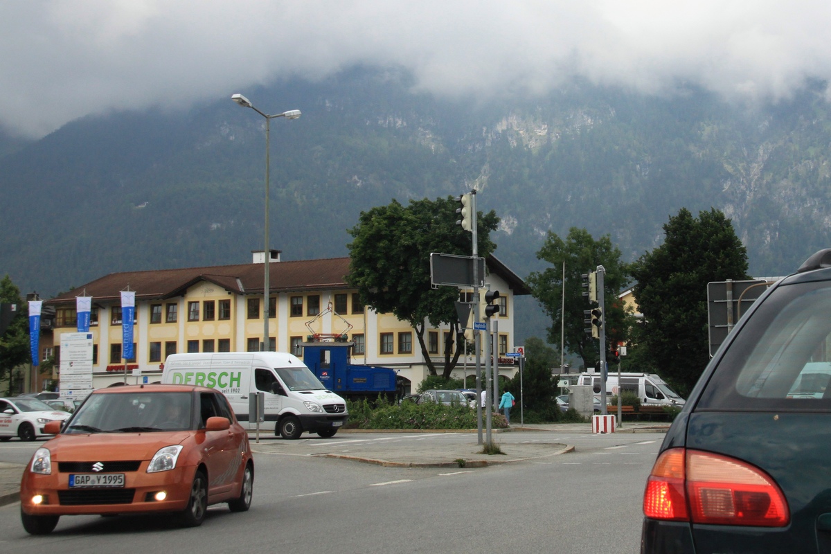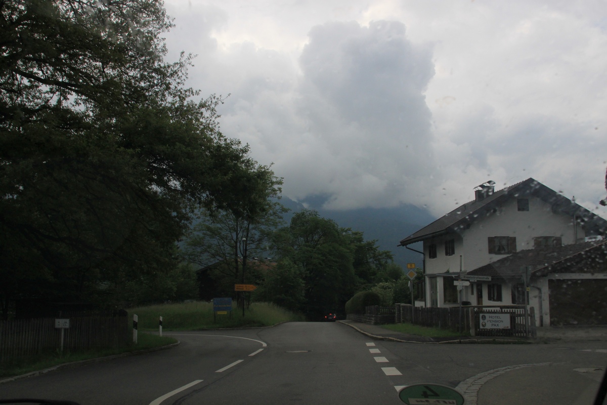 Tie laskee ja nousee, lehmät tuijottavat sieltä sun täältä, niiden kahden nyrkin levyiset kellot kolisevat. Lähestymme Garmisch-Partenkicheniä, hyppyrimäki näkyy jo. Itse kaupungissa ei ole oikein mitään nähtävää, mutta nyt voi sanoa käyneensä. Seuraamme viitoitusta legendaarisen Zugspitzen huipun köysirata-asemalle. Tie käy pieneksi, lehmiä märehtii liikenteenjakajassa, jotkut niistä tuijottavat, tuijotan takaisin. Hissitornin juurella tuijotan, kuinka gondoli katoaa sumuun - tai ehkä pilveen. Huippua ei näy. Matka sinne ja takaisin maksaisi päälle neljäkymppiä per henkilö, enemmänkin, jos tahtoisi myös jäädä ylhäällä pois. Ehkä ihan hyvä niin, voi perustella budjetilla ettei lähtenyt. Modernin hissiaseman vieressä on hylätty alppihotelli, jonka kanssa samassa talossa lahoaa käytöstä poistettu, vanhempi asema. Maassa lojuu hissivaijeria, kahden ranteen paksuista pötkylää.