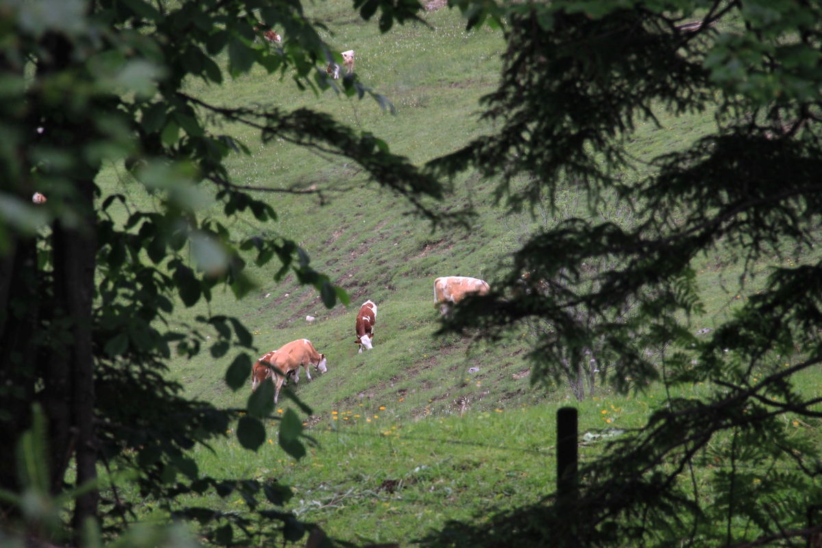 Tie, jonka nimi on Deutsche Alpenstrasse on todellakin nimensä mukainen. Vuorenseinämät muuttuvat melkein pystysuoriksi, ylhäällä näkyy jo lunta - tai ehkä ne ovat valkoisia kiviä, en ole käynyt katsomassa. Pilvet roikkuvat matalalla, niiden näkee etsivän sopivaa reittiä vuorten yli. Käymme välillä Itävallan puolella, asennemuutoksen huomaa heti; täälläkin on koristeita ja kukkia, mutta kaikki on hillitympää ja tyylikkäämpää. Ihmisten puhe kuulostaa kummalliselta, ihan kuin suomalaiset puhumassa saksaa - lausumisesta ei tietoakaan. Lehmiä on kaikkialla, mutta vain pienissä laumoissa - ihan kuin joka talolla olisi omiksi tarpeiksi ja vielä vähän myyntiin. Joku pitää lehmiä etupihallaan, tai ehkä ne ovat karanneet - mansikki järsii tyytyväisenä kukkia omenapuusta. Tienvarsilla on siellä täällä kaappeja ja suojakatoksia, joissa jesuli roikkuu ristillä - kärsimystä on kai jo riittämiin, kastuminen olisi liikaa.