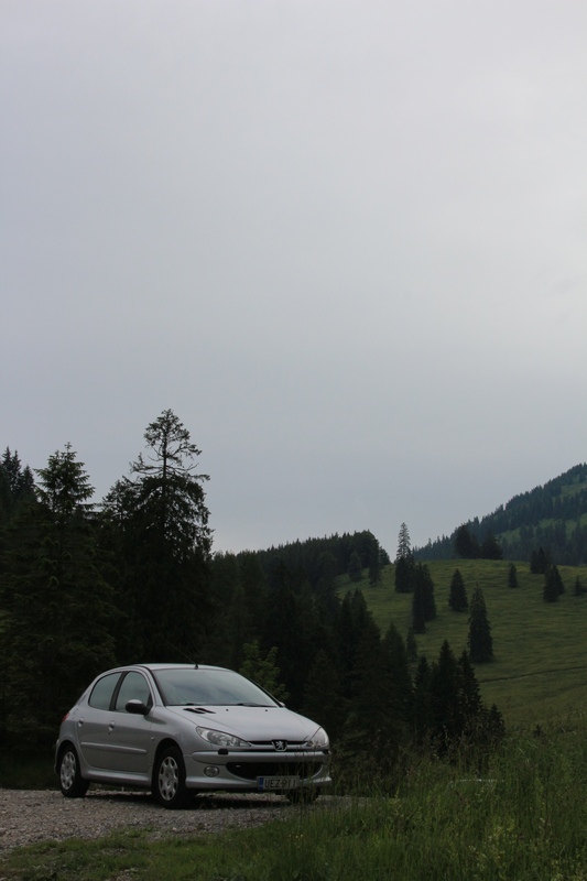 Saavumme Berchtegadeniin, kotkanpesän pikkukaupunkiin. Joku on suunnitellut ihan keskelle, siihen joen päälle, kuusiliittymäisen liikenneympyrän. Jääpä ainakin mieleen - sinivihreä vesi näkyy keskiympyrästä. Ohitamme lihakaupan, jonka mainoslipussa kivinen dorkaleijona jahtaa karkuunjuoksevaa nakkia. Tyylikästä. Tie kääntyy ylämäkeen, jyrkkyysprosentiksi luvataan nyt 24. Risteyksessä haisee palanut kytkin ja ylikuumentuneet jarrut. Mitähän tästä tulee? Muutaman mutkan jälkeen tie näyttää todellakin nousevan pystyyn - ranskis murisee kakkosella, kaasu on pohjassa eikä vauhti huimaa. Sitten tie jyrkkenee lisää; joudun vaihtamaan ykköselle. Pyörät sutaisevat tyhjää, jäljistä päätellen niin on käynyt myös muille. Onwards and upwards! Taakse ilmestyy nahka-asuisia henkilöitä kyykkymopoilla. Ne painavat ohi täysin sokkona - hyvähän se on, tuollaisella teho-painosuhteella. Nelipyörämopo, jossa on kromiset pölykapselit ja tribaaliliekit ei vaan mahdu ohi, vaikka miten kaasuttelee - mahtaa siellä The Stigin näköisen haalarin sisällä harmittaa.