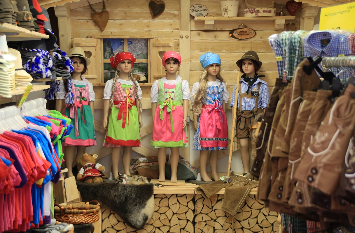 Perinteisen lihakaupan mainos Berchtesgadenissa. Perinteinen leijona jahtaa perinteistä makkaraa.