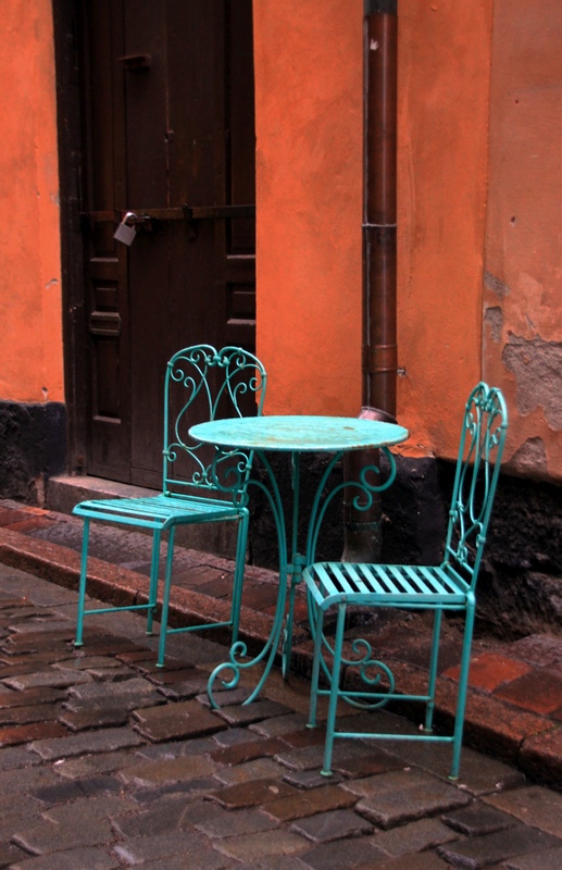 Laivoja menee. Terassin kaiteena ratakiskoa.
