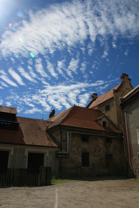 Pikkuteitä pitkin rajalle päin. Tsekkilinen maaseutu oli edelleen kaunista, maasto kumpuilevaa ja metsät tiheitä - ja kylissä näkyi historian kerroksellisuus. Ohitimme muinaisen luostarin, joka seisoi keskellä kylää kuin valkoinen huutomerkki.