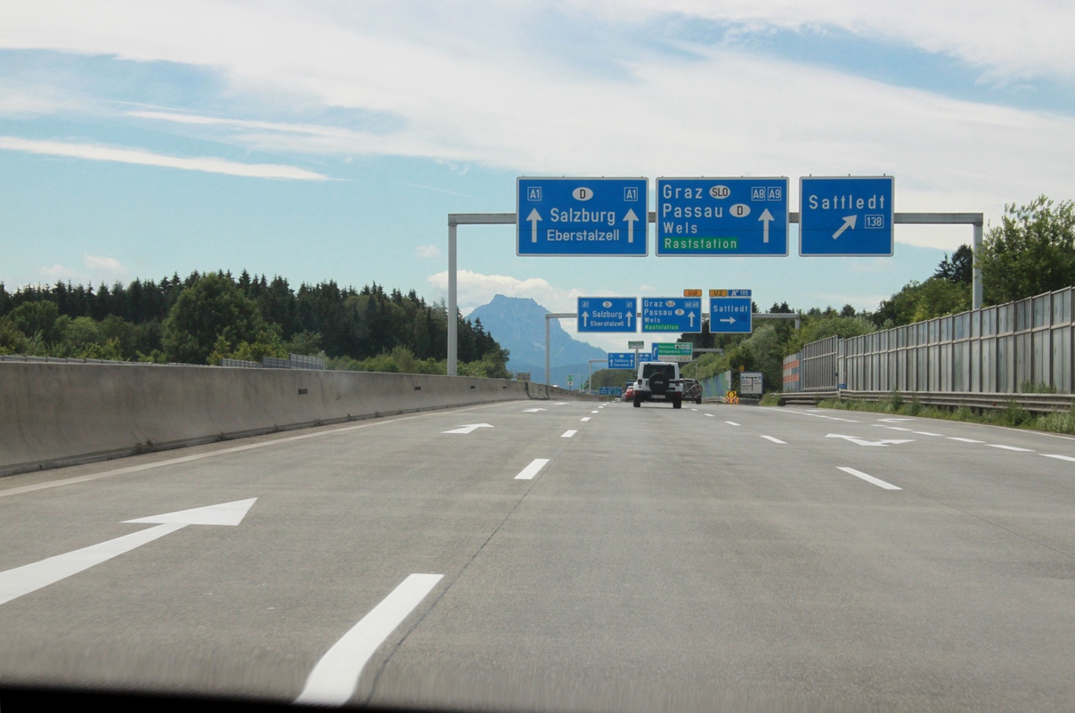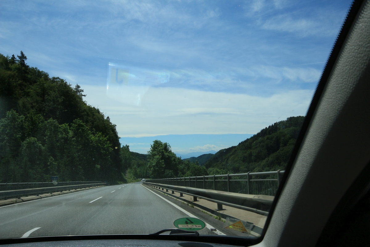 Itävallan raja-aseman, joka oli kiinni aidattu ja hyvin suljetun näköinen, jälkeen maisema muuttui kuin veitsellä. Isot kukkulat vaihtuivat ihan oikeisiin vuoriin ja näkökenttä leveni laajakuvaksi. Sinertäviä vuoria horisontissa, jotkut lumihuippuisia. Hohoo.