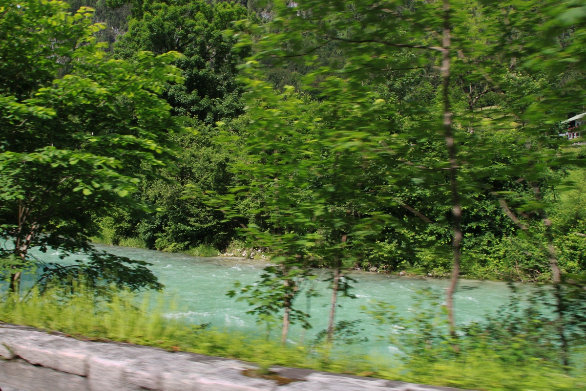 Vähän matkaa laiturilta meitä kutsui gasthaus, viiden minuutin kävelyn päässä taas maatila, josta olisi saanut tuoretta maitoa ja juustoa. Houkutuksista viis, jatkoimme kalkinvalkoista hiekkapolkua huikeissa maisemissa - vuoret kohosivat molemmin puolin muutamaan kilometriin, ruoho oli hyvin vihreää, puro pulputti ja solisi ihan tosissaan. Tuolla jossain, kahdenkymmenen minuutin päässä, oli Obersee - matkaan meni kuitenkin huomattavasti kauemmin, oli niin paljon nähtävää.