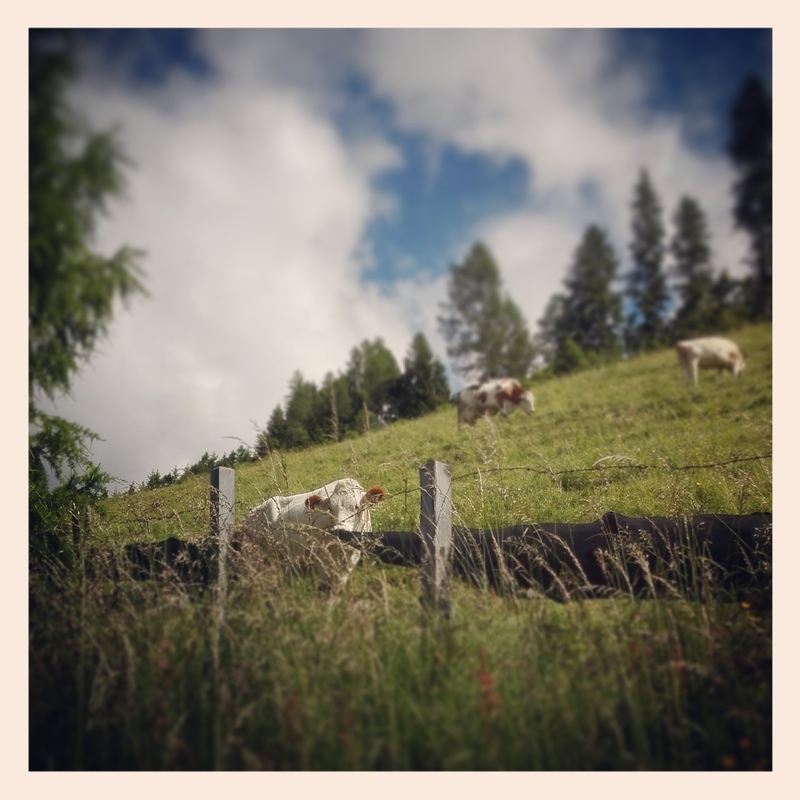 Matka vuorelta alas sujui hitaasti, välillä piti pysähtyä jäähdyttelemään jarruja. Moottorijarrutuksella toki mentiin, mutta tie oli hyvin jyrkkä; nousua pahimmillaan 20%. Ykkösellä ei kehdannut huudattaa kahdeksaa kilometriä, kakkosella taas mentiin liian lujaa. No, tulipa nähtyä tuijottavia alppilehmiä lähietäisyydeltä ja haisteltua aromaattista heinää sateenjälkeisessä auringossa.
