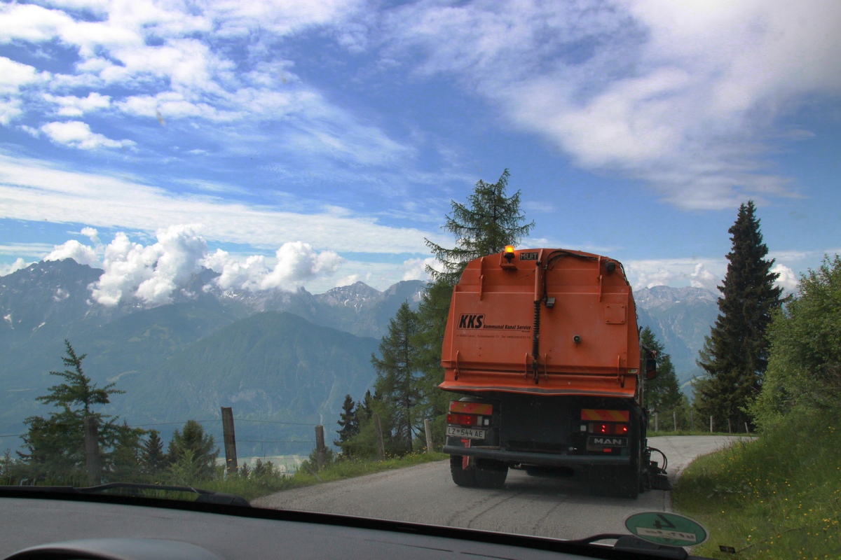 Italian raja koitti alle kilometrin päässä, lautatarhat vaihtuivat tukkikasoiksi ja bensan hinta nousi 1,17:stä 1,56:teen. Maiseman ja arkkitehtuurin muutos oli liukuvampi ja pidempikestoinen, mutta silti selkeä - vuoriin tuli enemmän pyöreyttä, heinäpeltojen käsinharavointi lisääntyi (Mitä järkeä siinä on?) ja talot vaihtuivat alppimajoista korkeampiin ja kivisiin. Katto niissä oli yhtä koomisen iso.