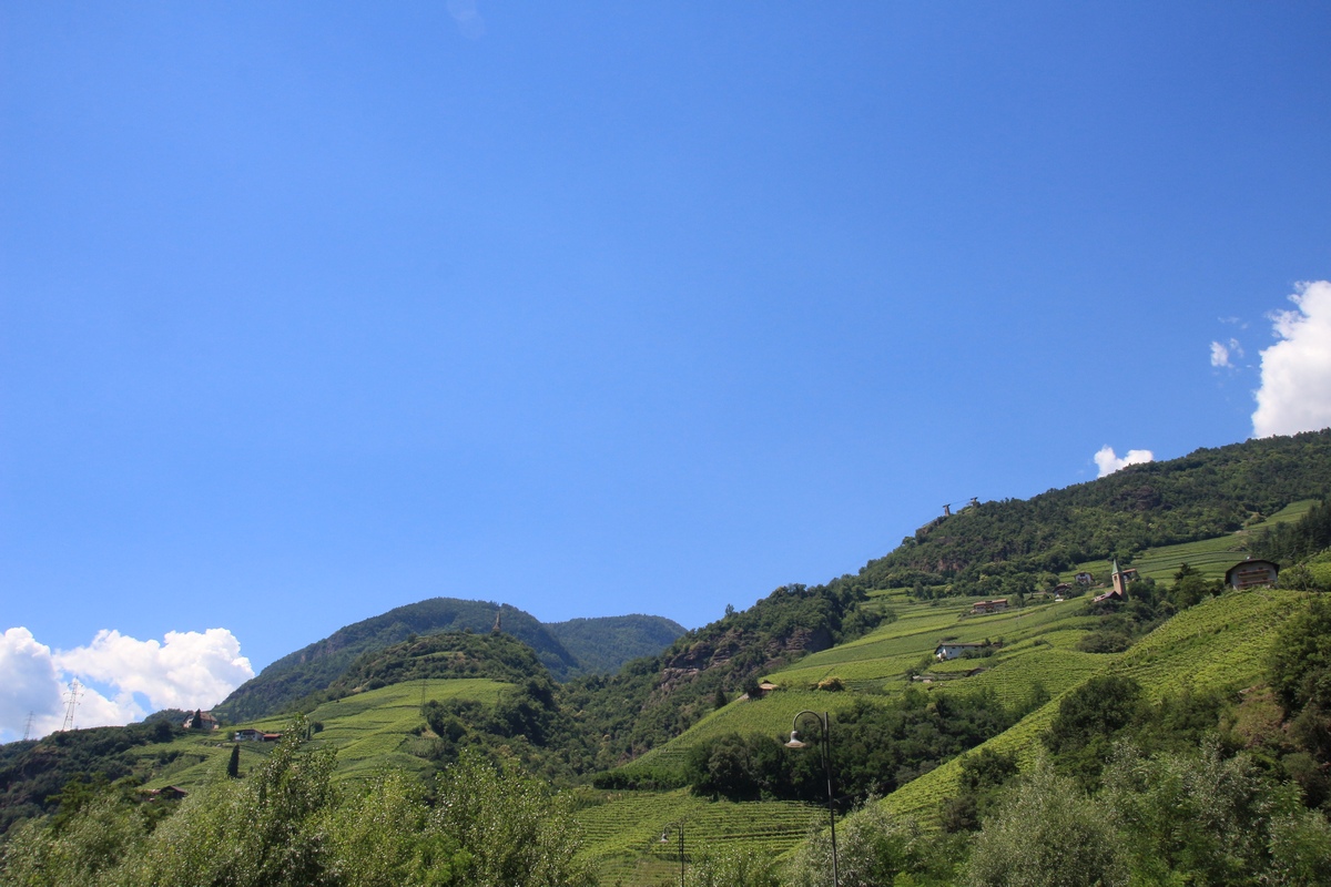 Vilpianon kylä on puolessa välissä Bolzanoa ja Meranoa - ei siis kaukana enää. Majoitus on italialaistyyppisen (tai, täällä ollaan mielummin Etelä-Tirolilaisia ja puhutaan saksaa) alppimajan yläkerrassa ja juuri remontoitu. Parvekkeella, jolla tätä kirjoitan, kasvaa viiniä - rypäleitäkin jo näkyy. Hieman kauempana on mäntypeitteisiä vuoria, seuraavaan linnaankin näköyhteys. Kuumuus väreili päivemmällä oikein kunnolla, vuoretkin muuttuivat udussa sinisiksi, vaikka eivät ole niin kaukana kuin sinisten vuorien kuuluu olla.