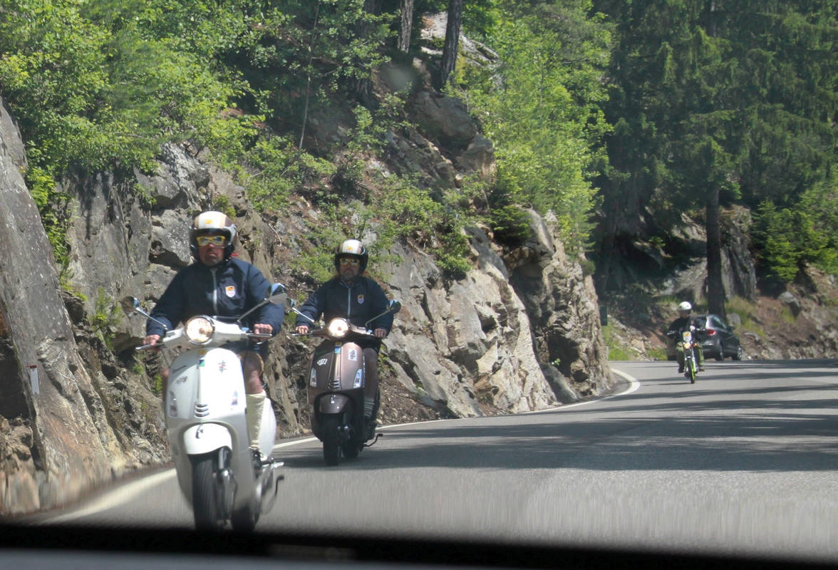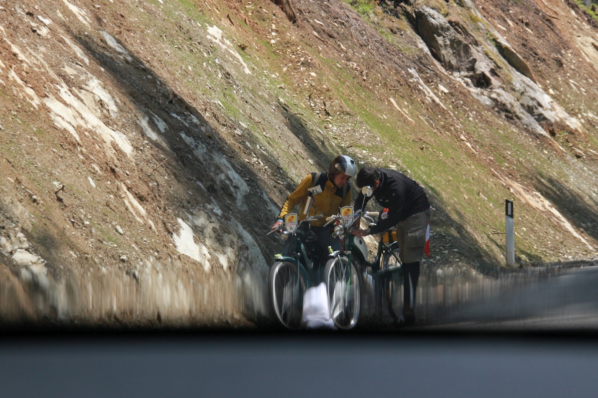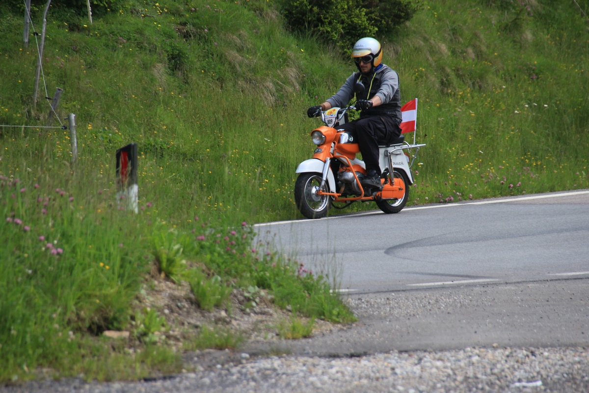 Jostain kumman syystä emme pysähdy Edelweisshütteen syömään - piha on mustanaan mopoja ja ilma sininen savusta. Tilanne on sama seuraavissakin taukopaikoissa, mopotiheys kasvaa selvästi. Nyt mennään jo alaspäin, eli he tulevat ylöspäin - härvelit ovat kovilla, moni polkee pappatunturi-tyyppisiin koneisiinsa lisää vauhtia polkimilla. Useat ovat myös pysähtyneet ns. ropaamaan, fiksaamaan, laittamaan ja säätämään. On onni, että tulimme tähän suuntaan - ylämäkeen ajaminen moisten öljyruiskujen kanssa ei olisi naurattanut ollenkaan näin paljon.
