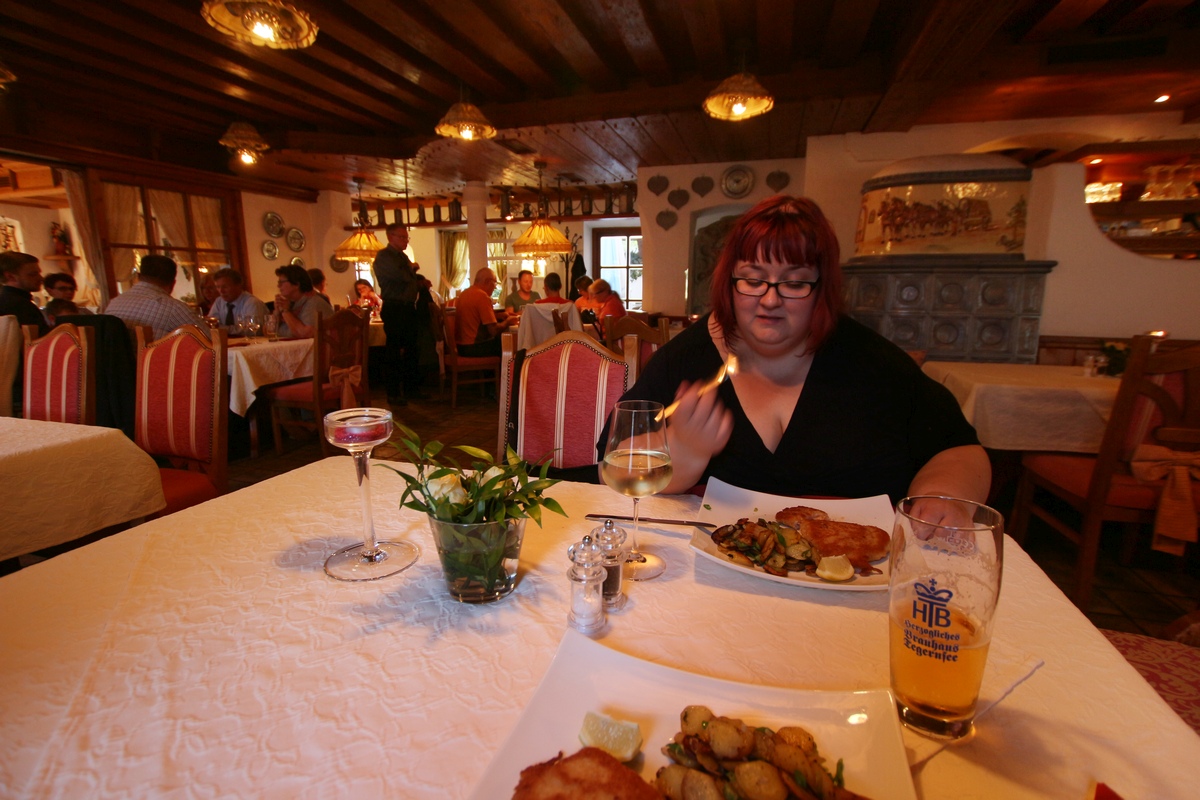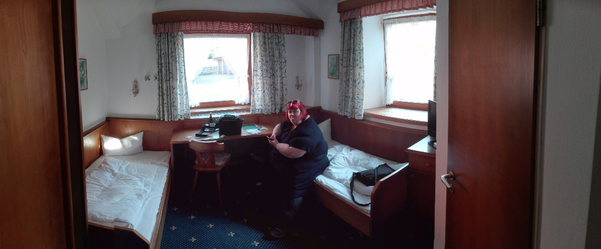 Bensa halpenee etelään mennessä ja maiseman kumpuilu lisääntyy samaa tahtia. Nyt näkyi jo vuoriakin. Siihen tunteeseen ei totu. Söimme hotellin perisaksalaisessa ravintolassa erittäin perinteiset täytetyt leikkeet. Sisustus oli juuri sellainen kuin kuvitella saattaa, paitsi överimpi - ja annoksissa varmaan 1000 kaloria per. Parasta. Myöhemmin ihmettelimme, tai ainakin minä, huoneen seinästä pistäviä vesihanoja. Putkea ei tule, hanat vain pönöttävät, sopivasti sängyn yläpuolella. En ole uskaltanut kääntää, vielä.