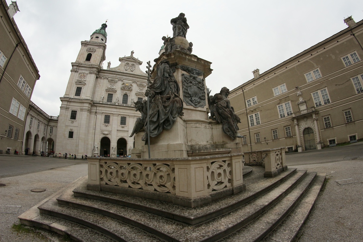 Säätila ei osannut päättää koko päivänä; vettä tihuutti kymmenisen minuuttia, sitten paistoi noin vartin. Kiertelimme katedraalia kuin hipit kylmää olutta, kuvattavaa riitti. Yhdelläkin aukiolla suihkulähteen keskipylväänpäällinen enkeli heitti ylös pyrkivää pirua salamalla että zut vaan - toisella taas oli taide; monimetrinen kultainen pallo, ehkä Mozartin kuula, jonka päällä seisoi eksyneen näköinen liikemies. Torilla lapset pelasivat torishakkia, pallon alla sateensuojassa vanhat ukot ihan oikeaa. Voittavalla osapuolella oli sama virne.